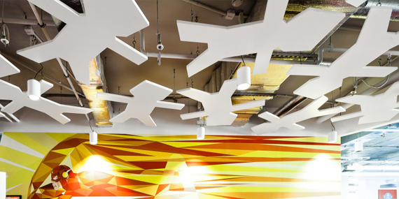 La familia Ecophon Solo™ está disponible en numerosos colores y existe una amplia gama de formas y tamaños. Estos paneles en suspensión tienen un espesor de 40mm y ofrecen una excelente calidad acústica.