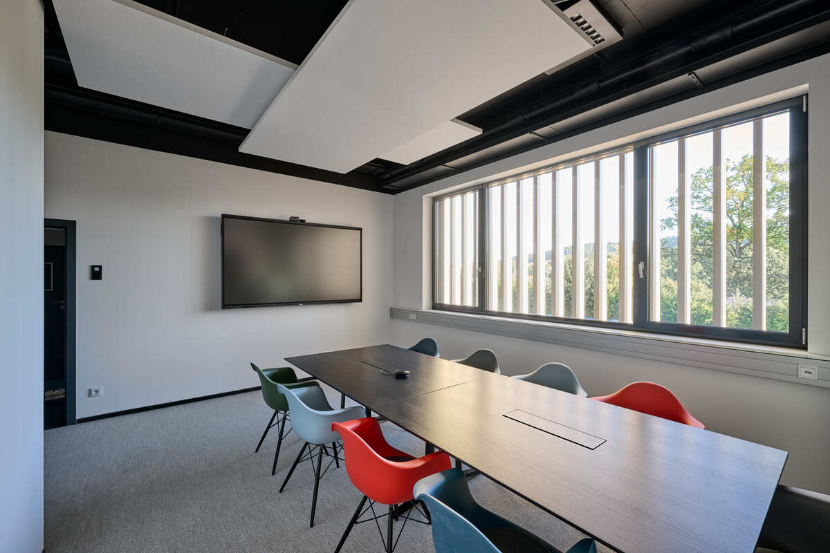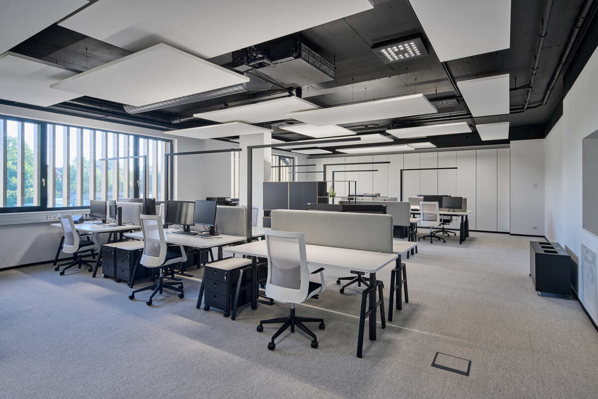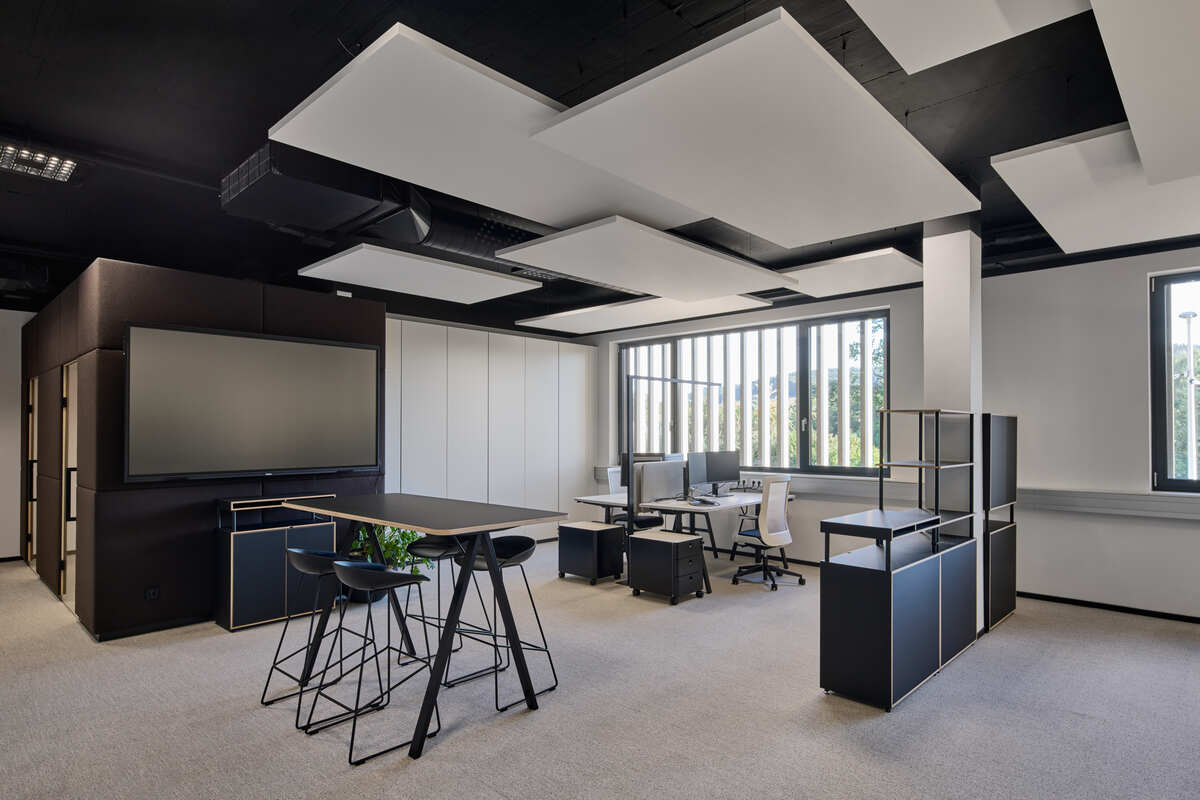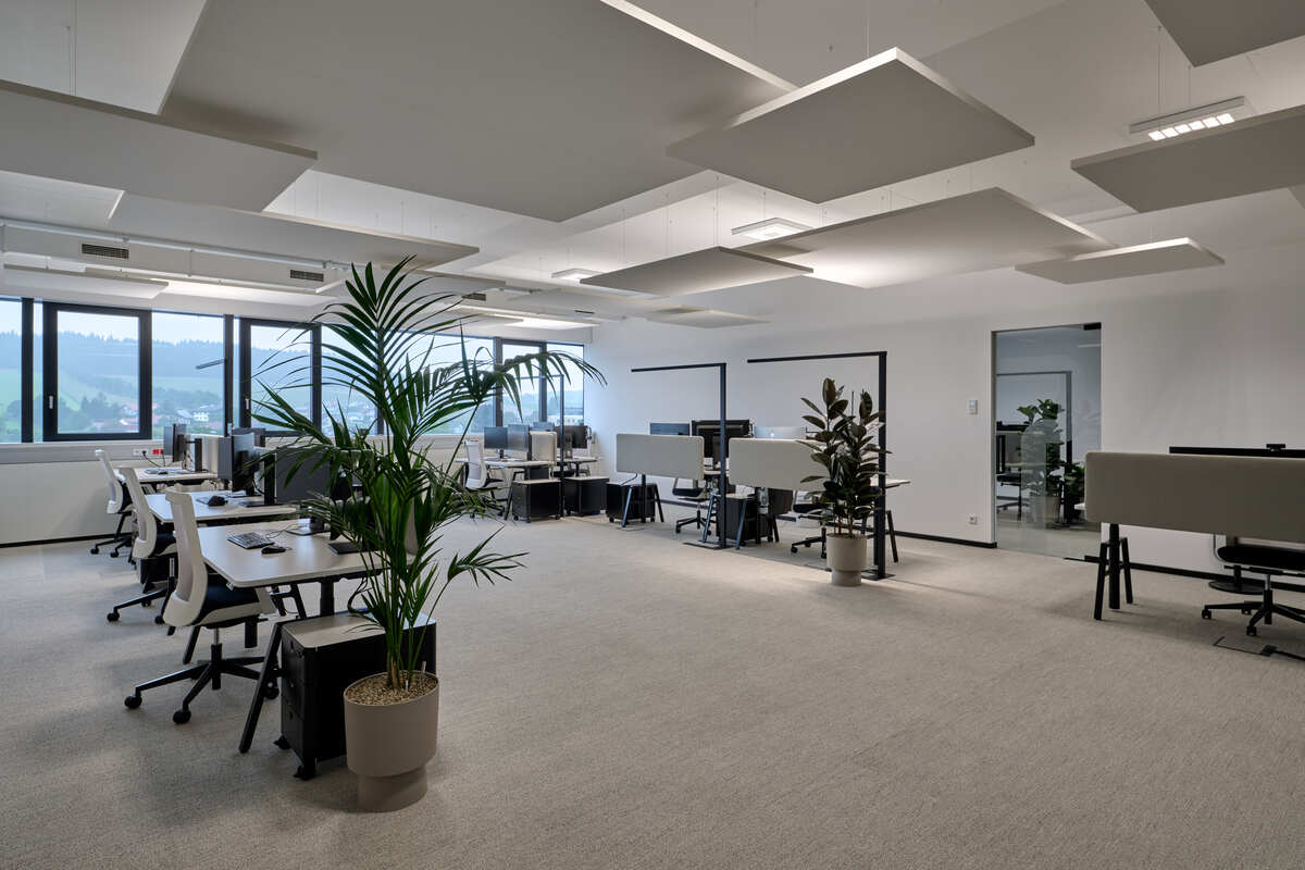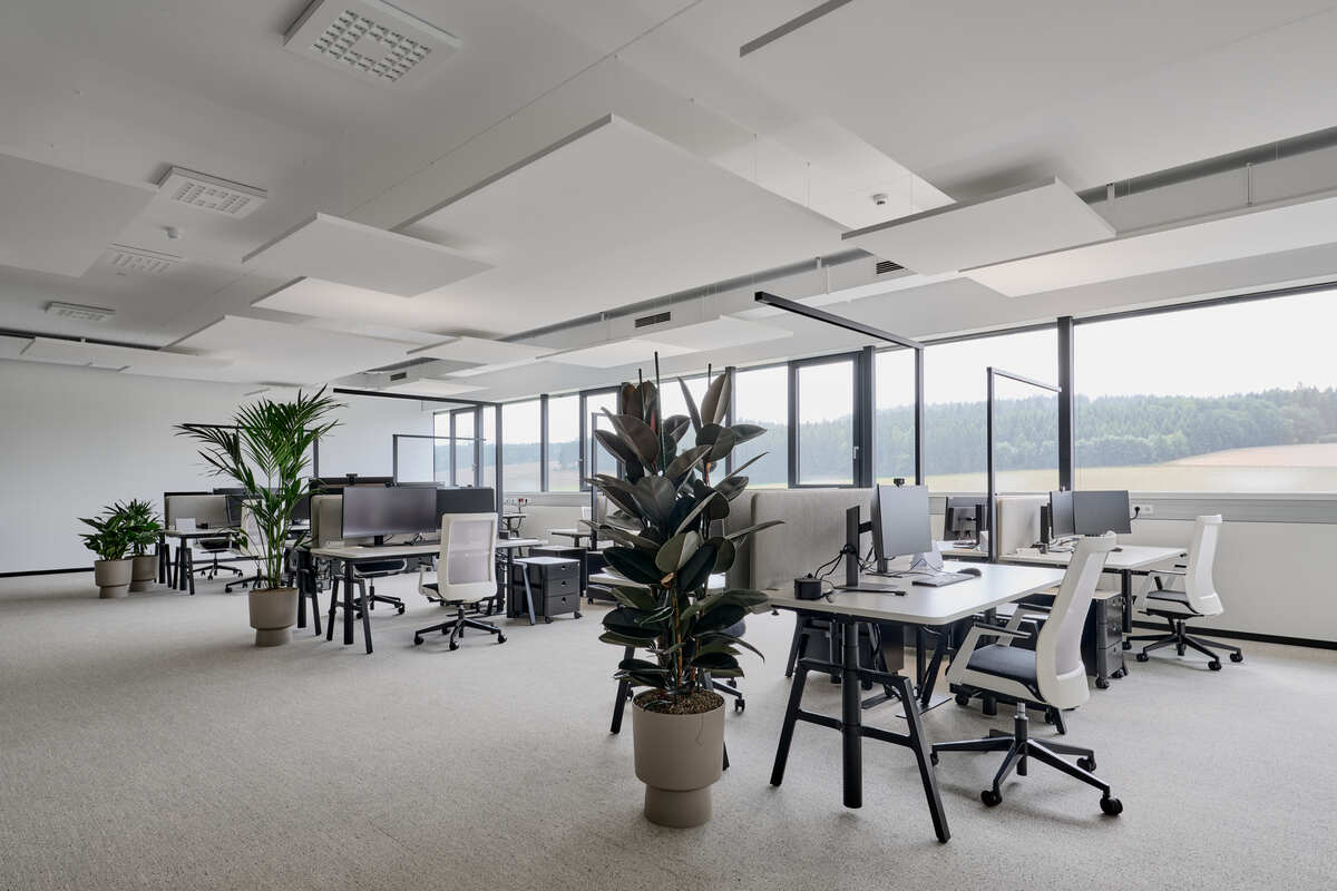 Akustisches Wohlbefinden spielte eine zentrale Rolle bei der Gestaltung der offenen Büroflächen. Um eine angenehme und konzentrationsfördernde Arbeitsumgebung zu gewährleisten, wurden freihängende Ecophon Solo Deckensegel montiert. Ihre beidseitige Schallabsorption sorgt für hervorragende akustische Leistung, reduziert Hintergrundgeräusche und verbessert die Sprachverständlichkeit.