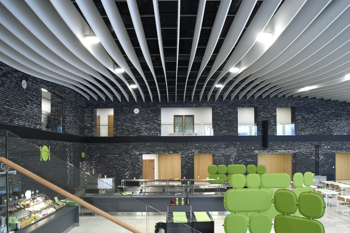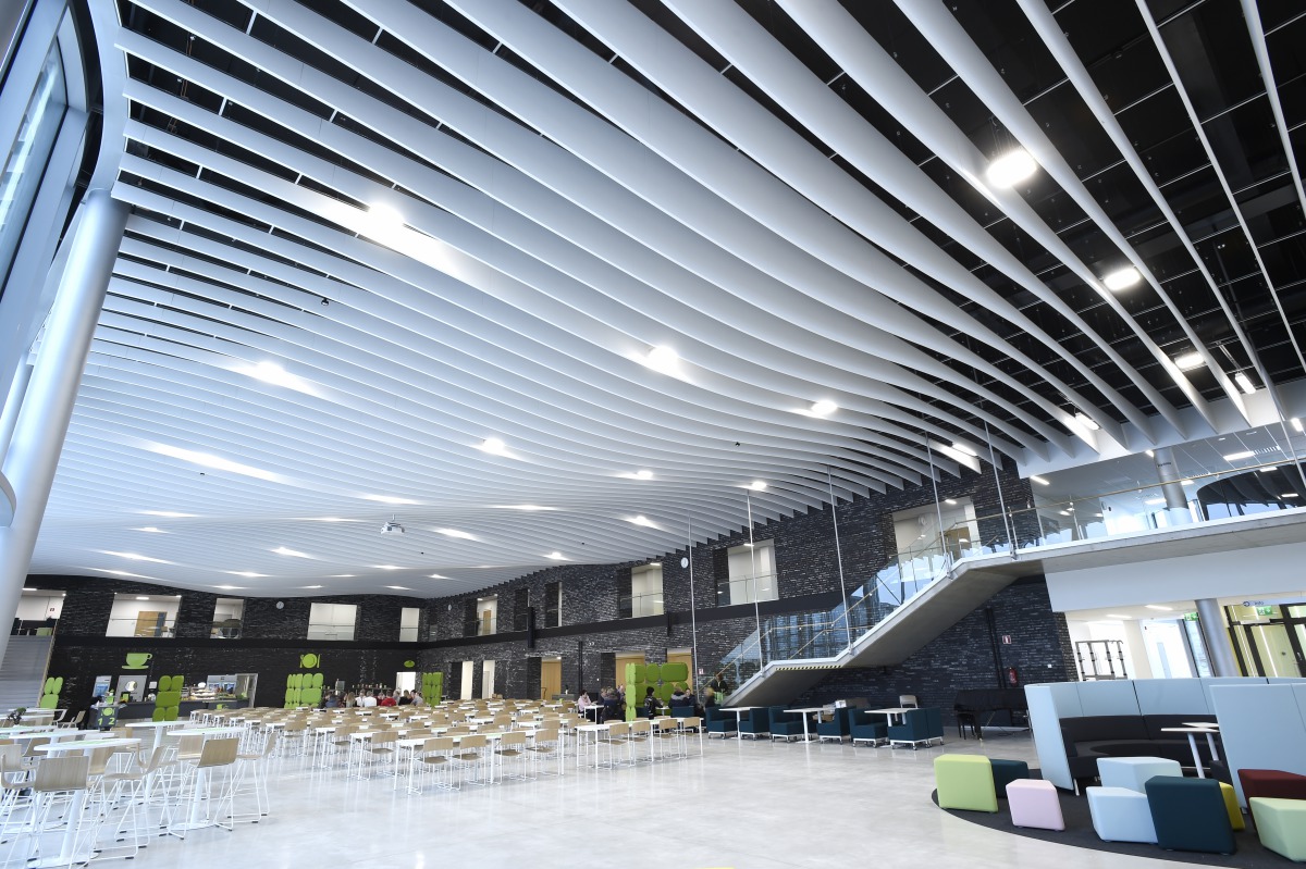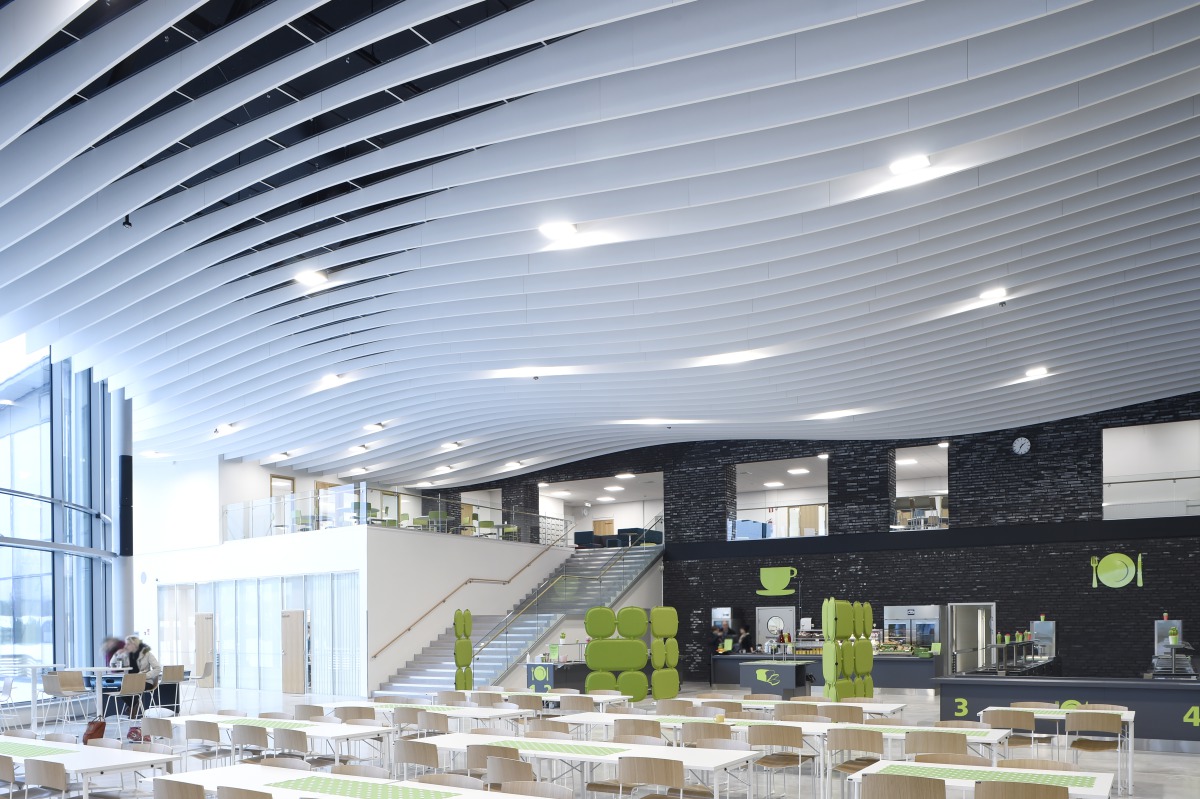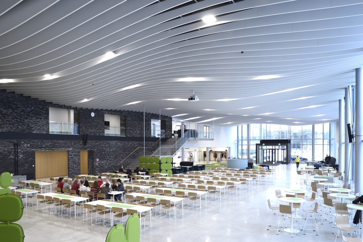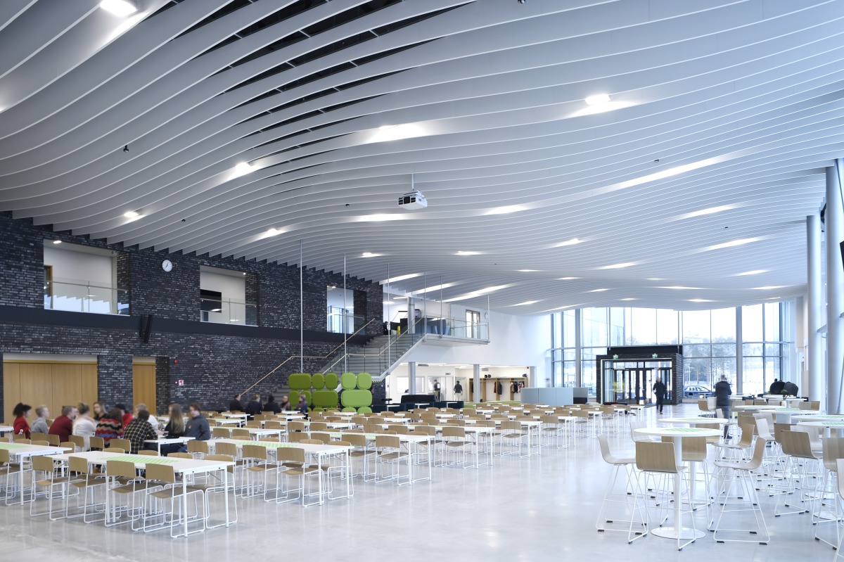 The most spectacular space on the campus is the 1370 m2 lobby, where the campus canteen is located. This area was given a unique, outstanding look by architect Pasi Siistonen from Luovaus Arkkitehdit Oy.