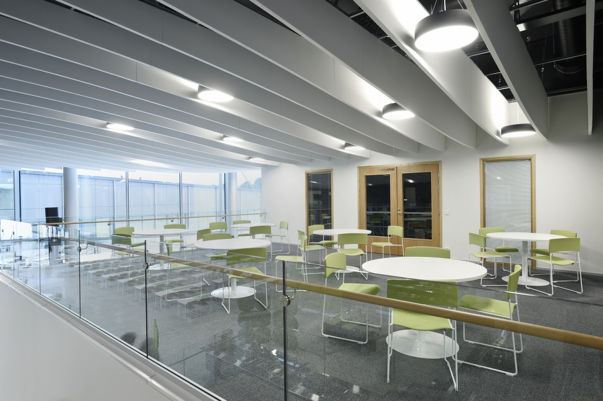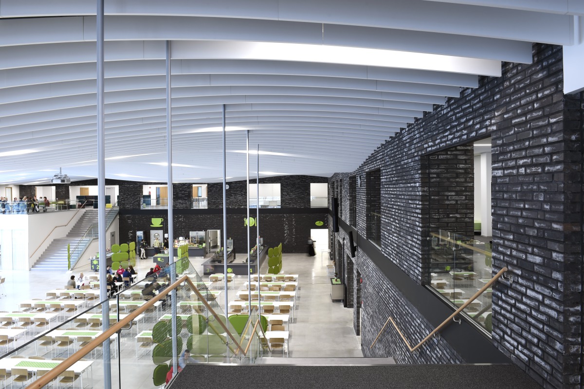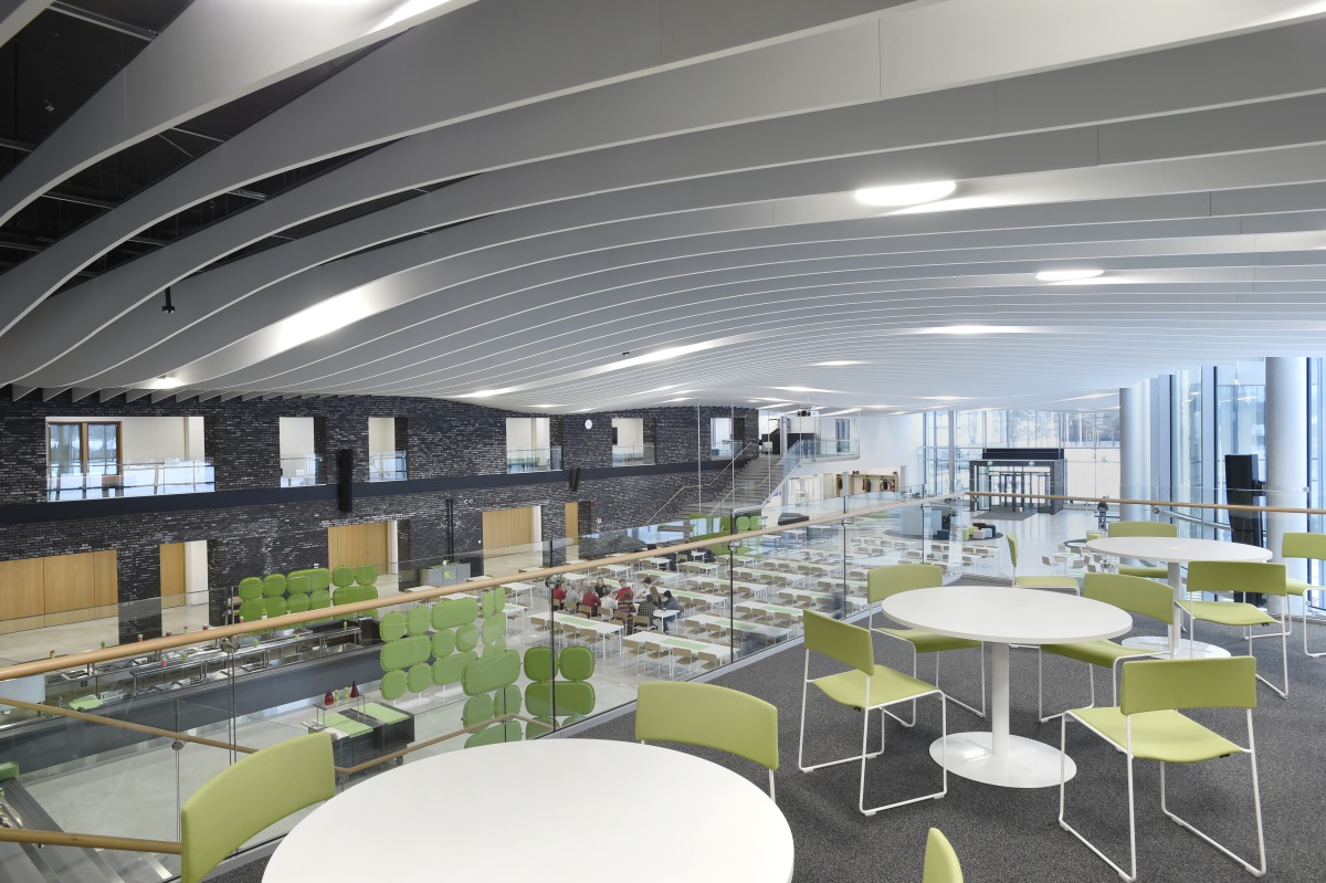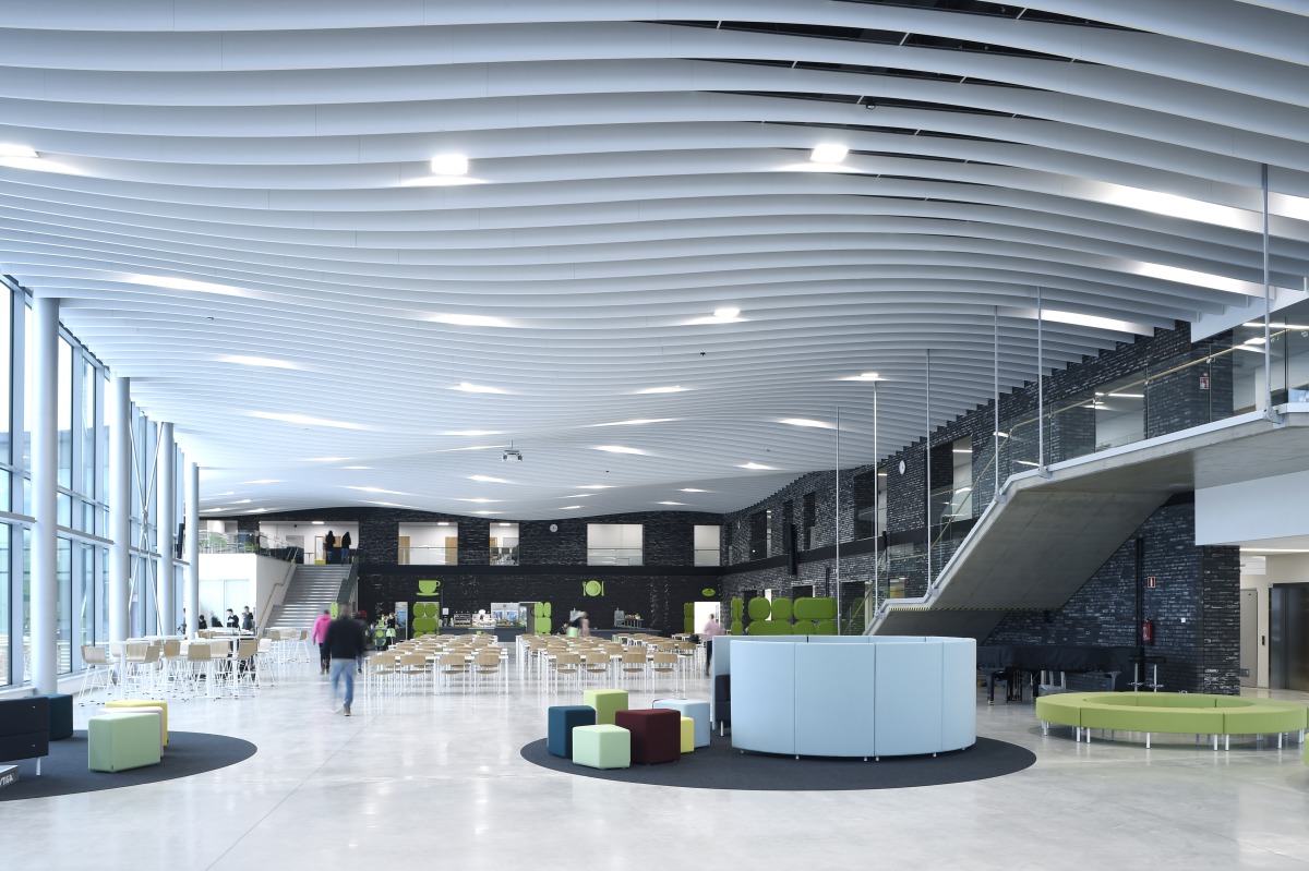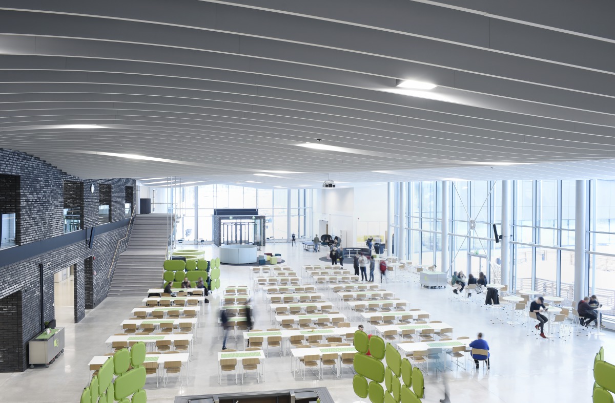 The most spectacular space on the campus is the 1370 m2 lobby, where the campus canteen is located. This area was given a unique, outstanding look by architect Pasi Siistonen from Luovaus Arkkitehdit Oy.