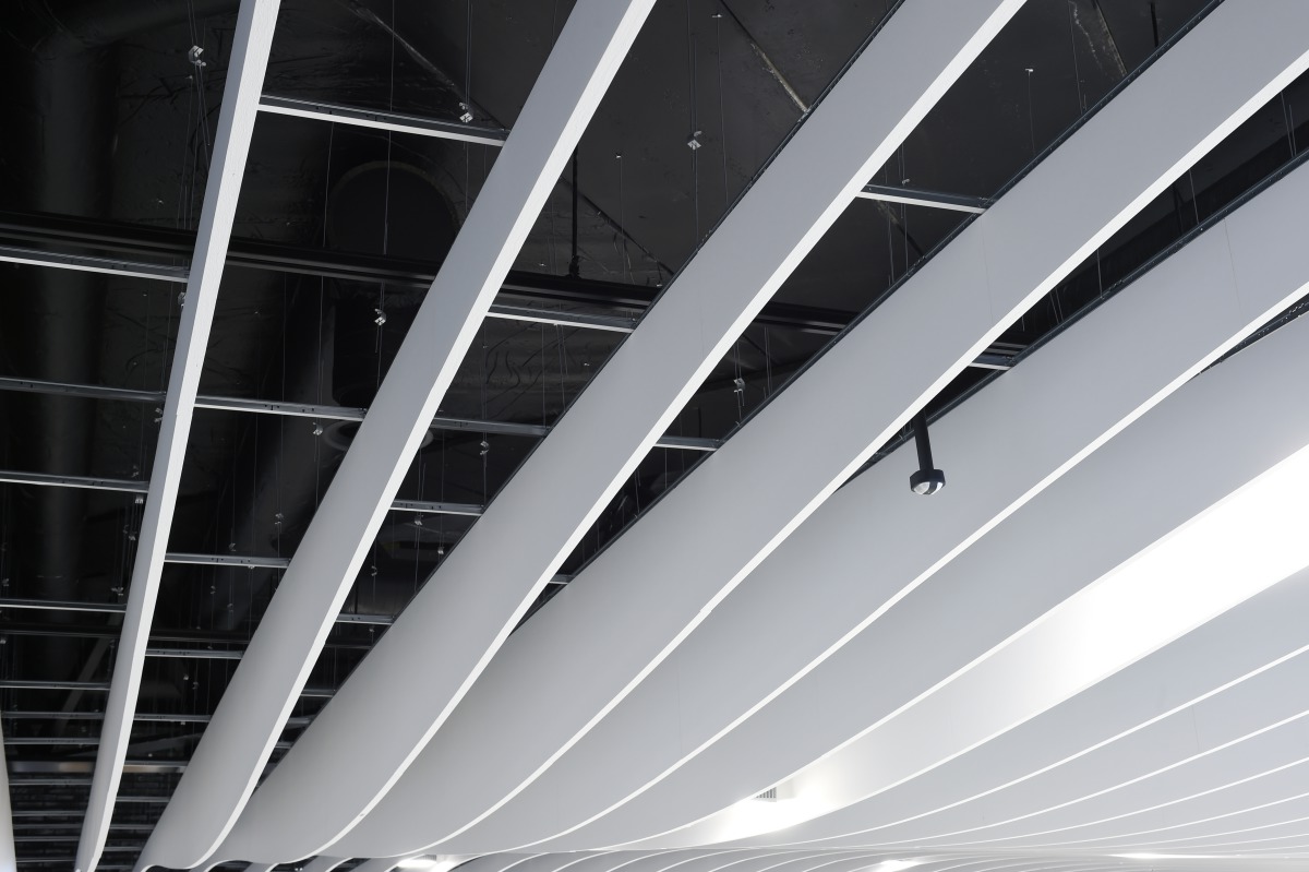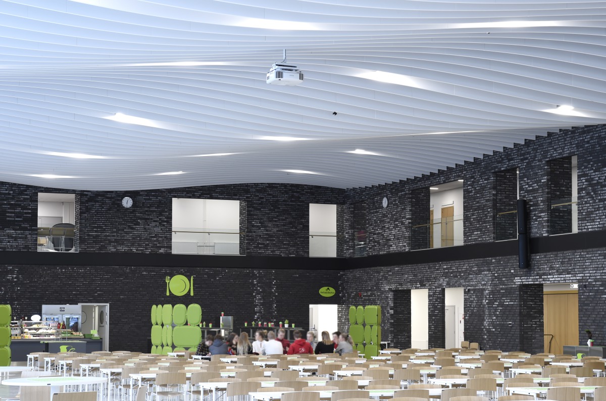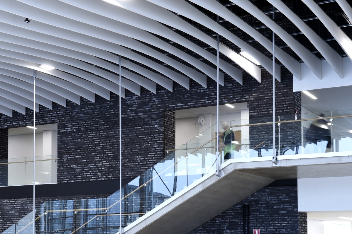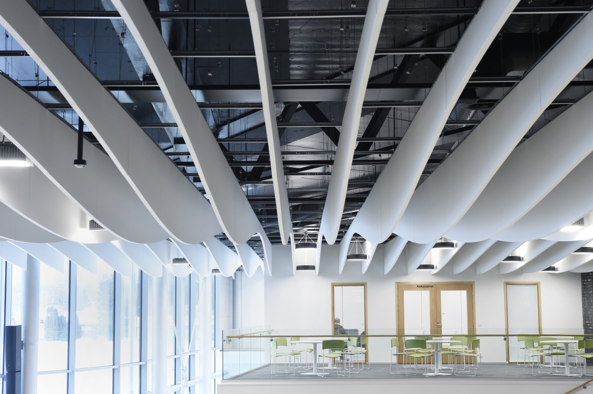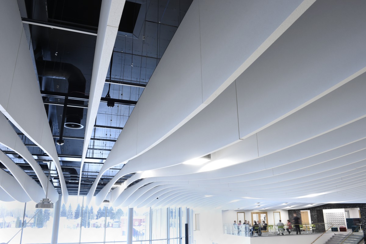 In the ceiling of the entrance, Solo Baffle absorbers were shaped using only four cut-to-shape elements, creating a vibrant and dynamic end-result. The tiles were mounted in rows with c-c 600 mm and by changing the position of the centerline a wavy impression occured."