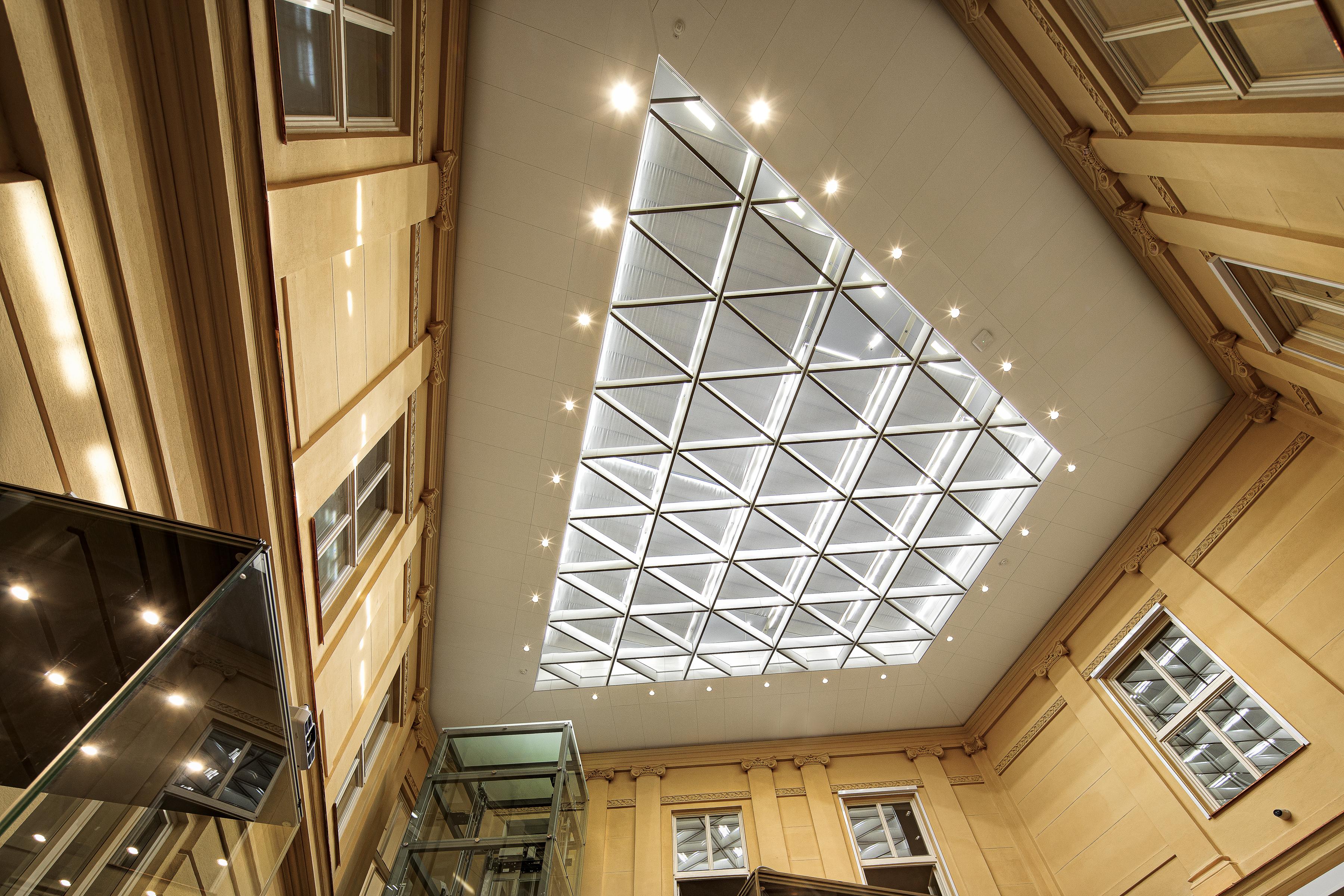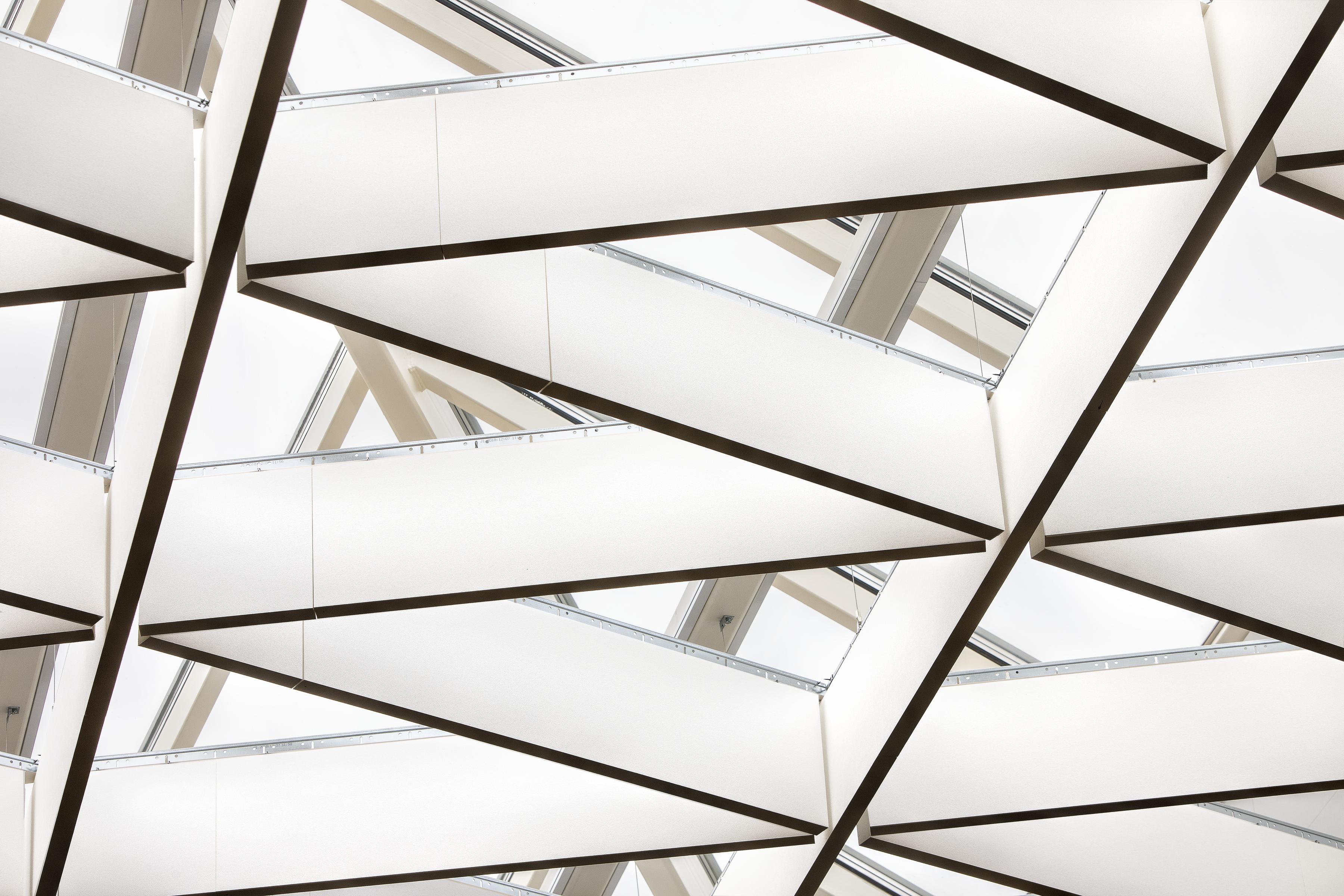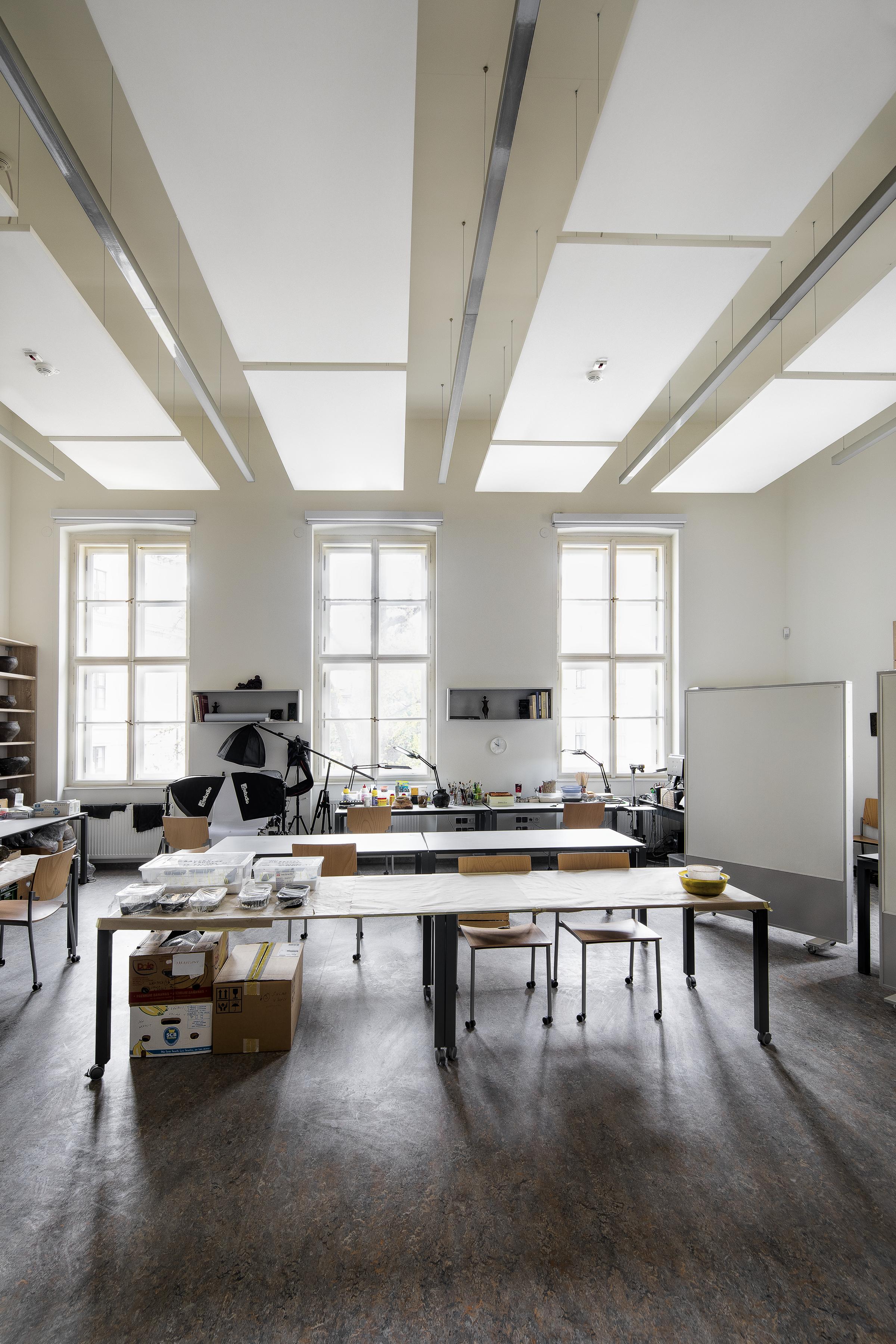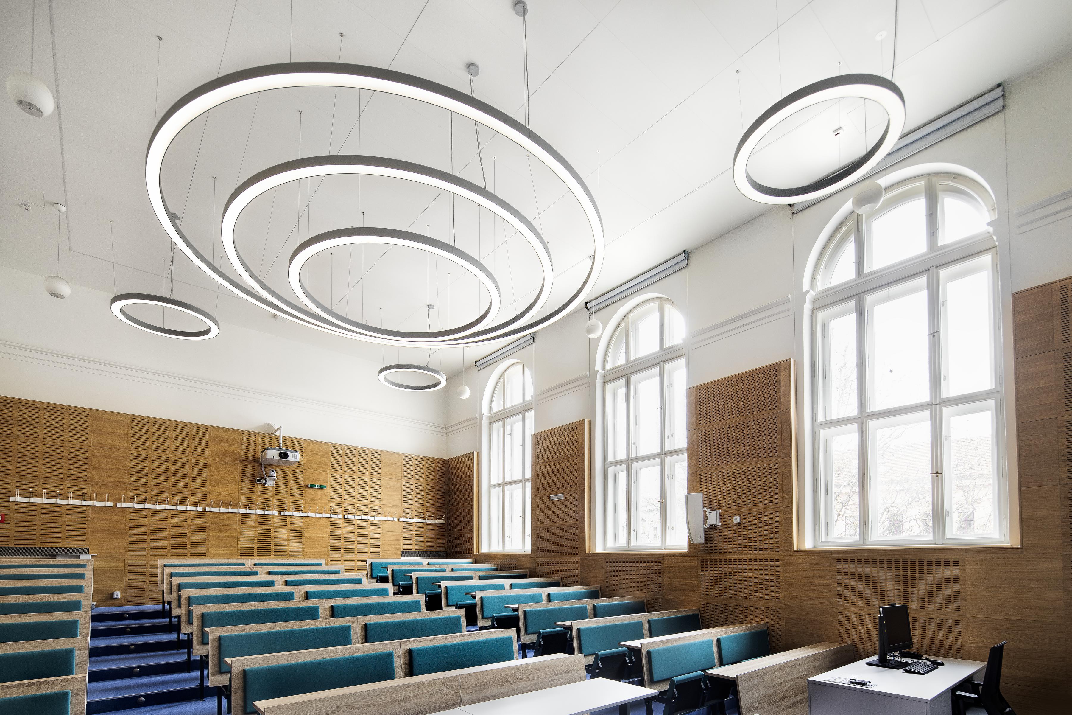 A visão artística dos arquitetos requisitava o uso de soluções acústicas inovadoras, e os experts da Ecophon aceitaram o desafio. Por exemplo, é importante mencionar o vestíbulo de forro de vidro para a faculdade, que é complementado pelos elementos acústicos do Ecophon Solo™ Baffle, permitindo que a luz do sol adentre o ambiente, o que é crucial para uma sala onde haverão exibições e seminários. O salão local é outro interior projetado de maneira inovadora, onde as distintas luzes circulares são complementadas pelo sistema acústico Ecophon Focus™ Ds, apresentando um forro oculto o que auxilia que se preserve a forma histórica.