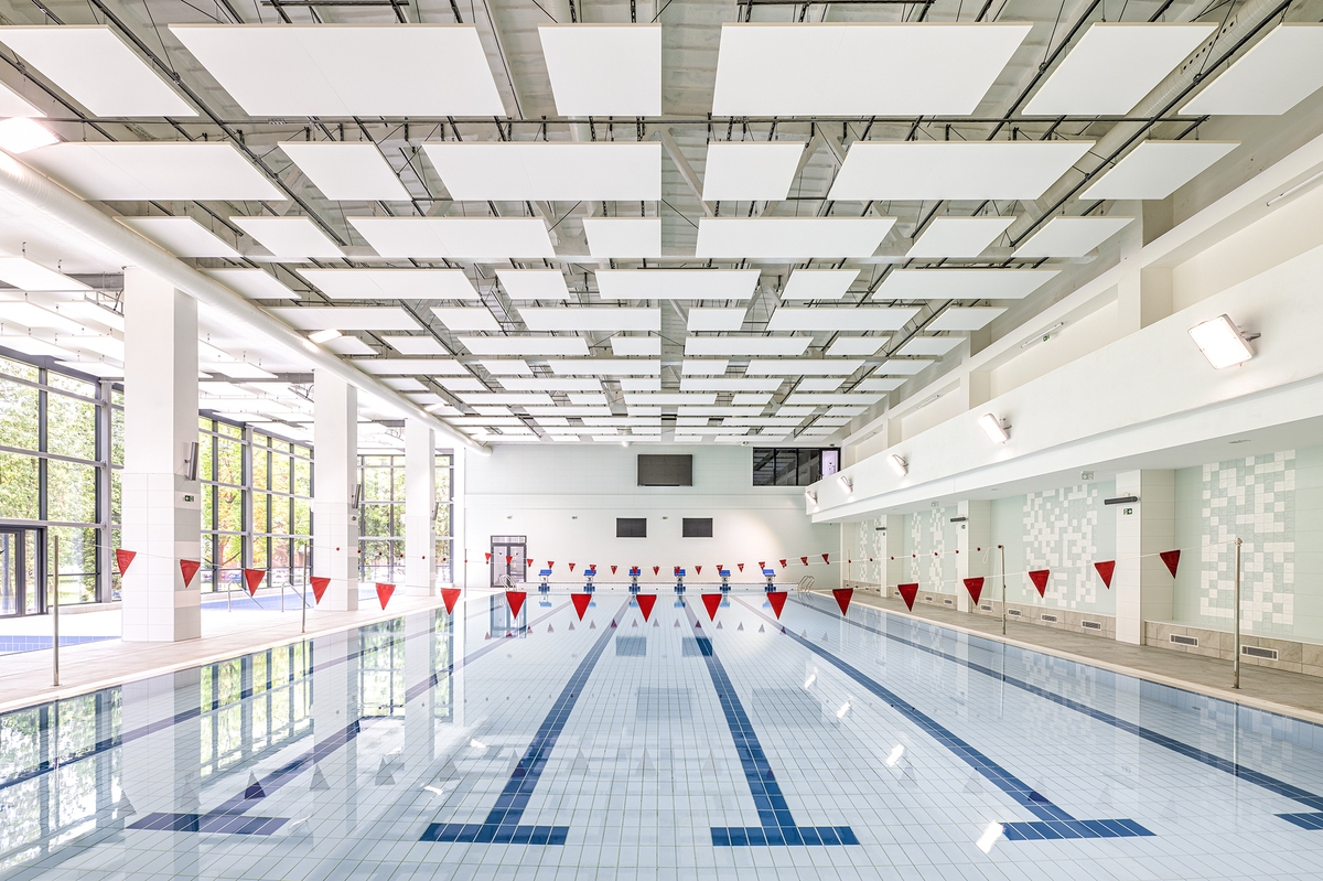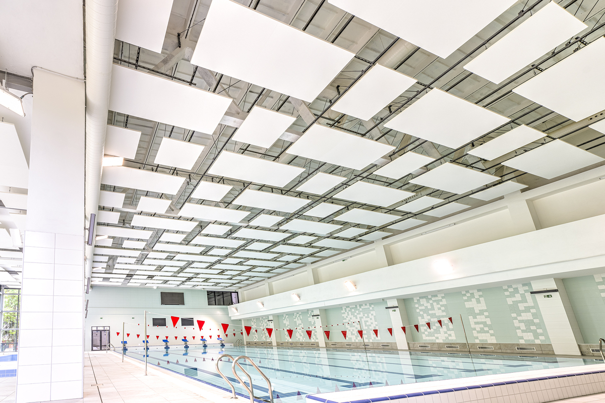 Na área da piscina, é necessário resolver a acústica não apenas para o conforto do usuário, mas principalmente para a segurança. Os nadadores precisam ouvir o salva-vidas e ele precisa ouvi-los.