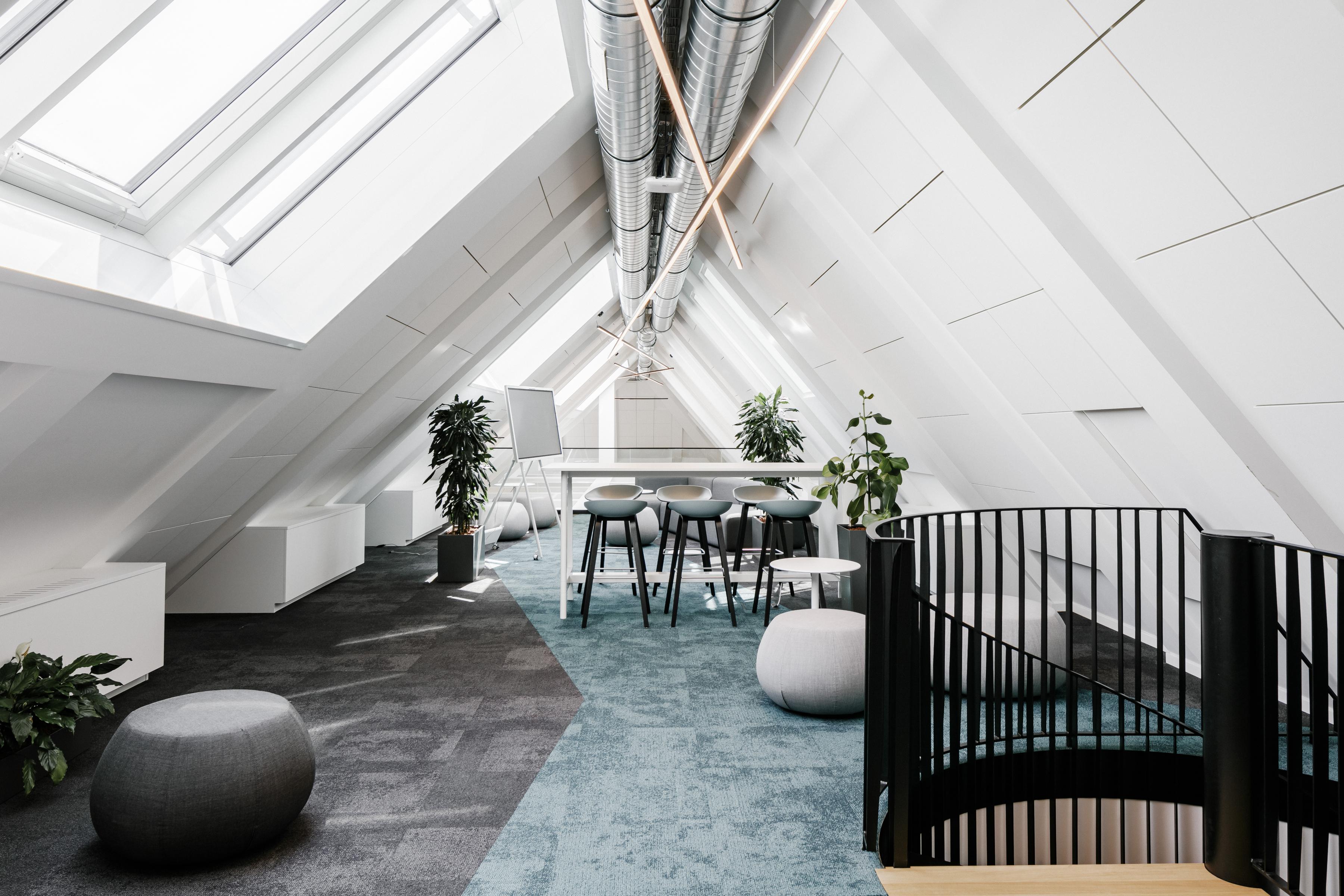 Para garantir a acústica necessária para uma vasta gama de atividades neste ambiente dinâmico, um forro acústico Ecophon foi instalado. Ecophon Master™ SQ é um forro acústico especialmente projetado para ambientes de escritório de plano aberto e todas outras áreas onde as exigências por uma boa acústica e inteligibilidade de fala são particularmente altas. As placas de espessura de 40 mm são coladas diretamente ao forro exposto e permanecem visualmente discretos. Isto resulta em uma solução acústica quase invisível, mas muito efetiva.
