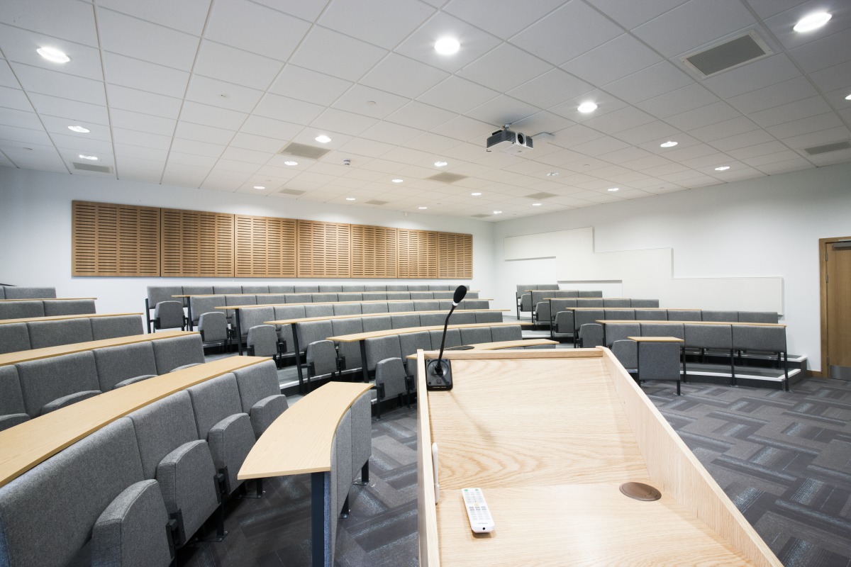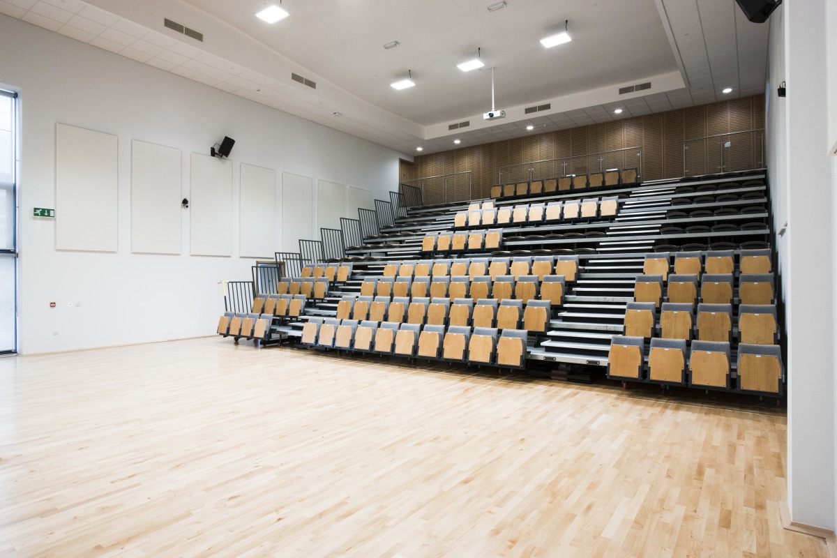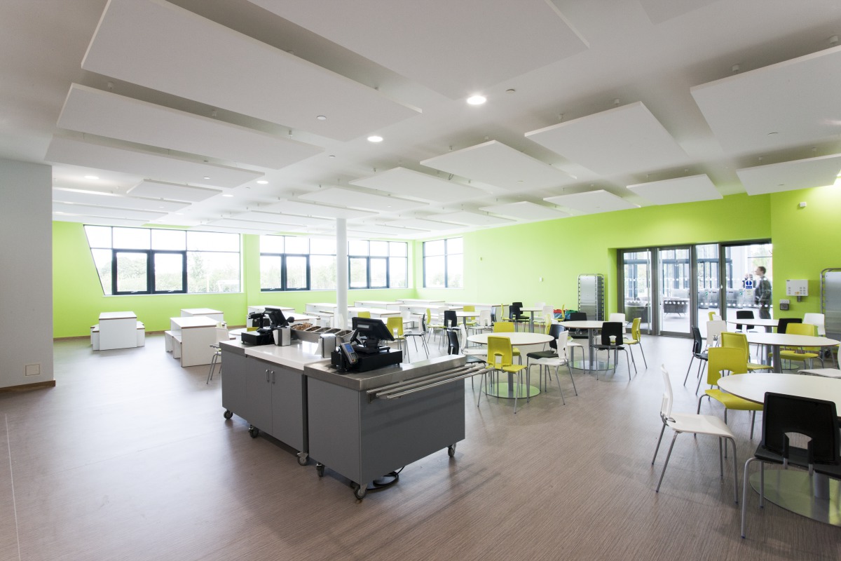 Die Haupthalle wird sowohl für Vorträge als auch für Musikdarbietungen genutzt. Hier wurden ebenfalls Akusto Wandpaneele ausgewählt, die sowohl bei elektronischer als auch bei natürlicher Beschallung für eine ausgezeichnete Sprachverständlichkeit sorgen. Akustisch anspruchsvoll sind außerdem der Speiseraum und das Lernzentrum, wo die Geräuschpegel mit Solo Rectangle Deckensegeln minimiert werden. In den Klassenräumen kamen Gedina E Deckenplatten zum Einsatz, die den Raumhall minimieren und gute Sprachverständlichkeit gewährleisten.