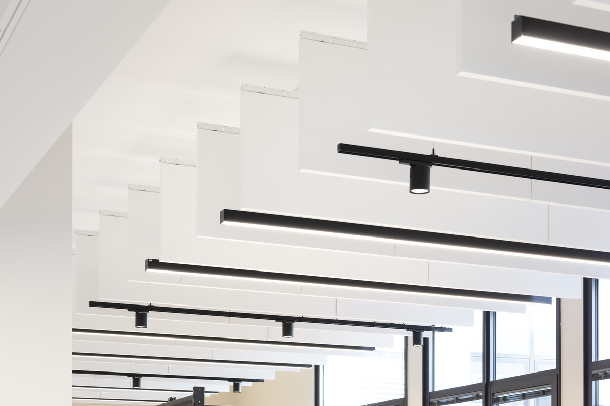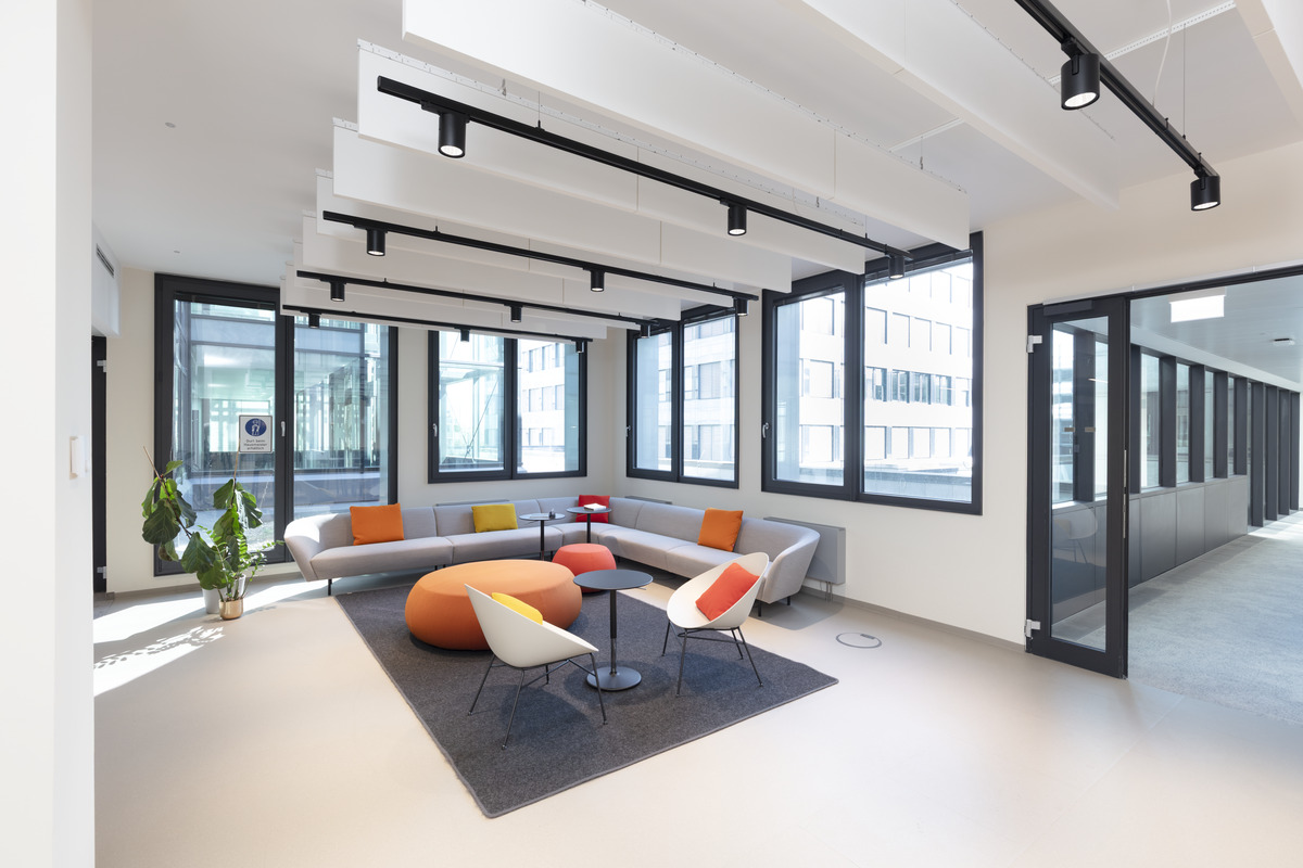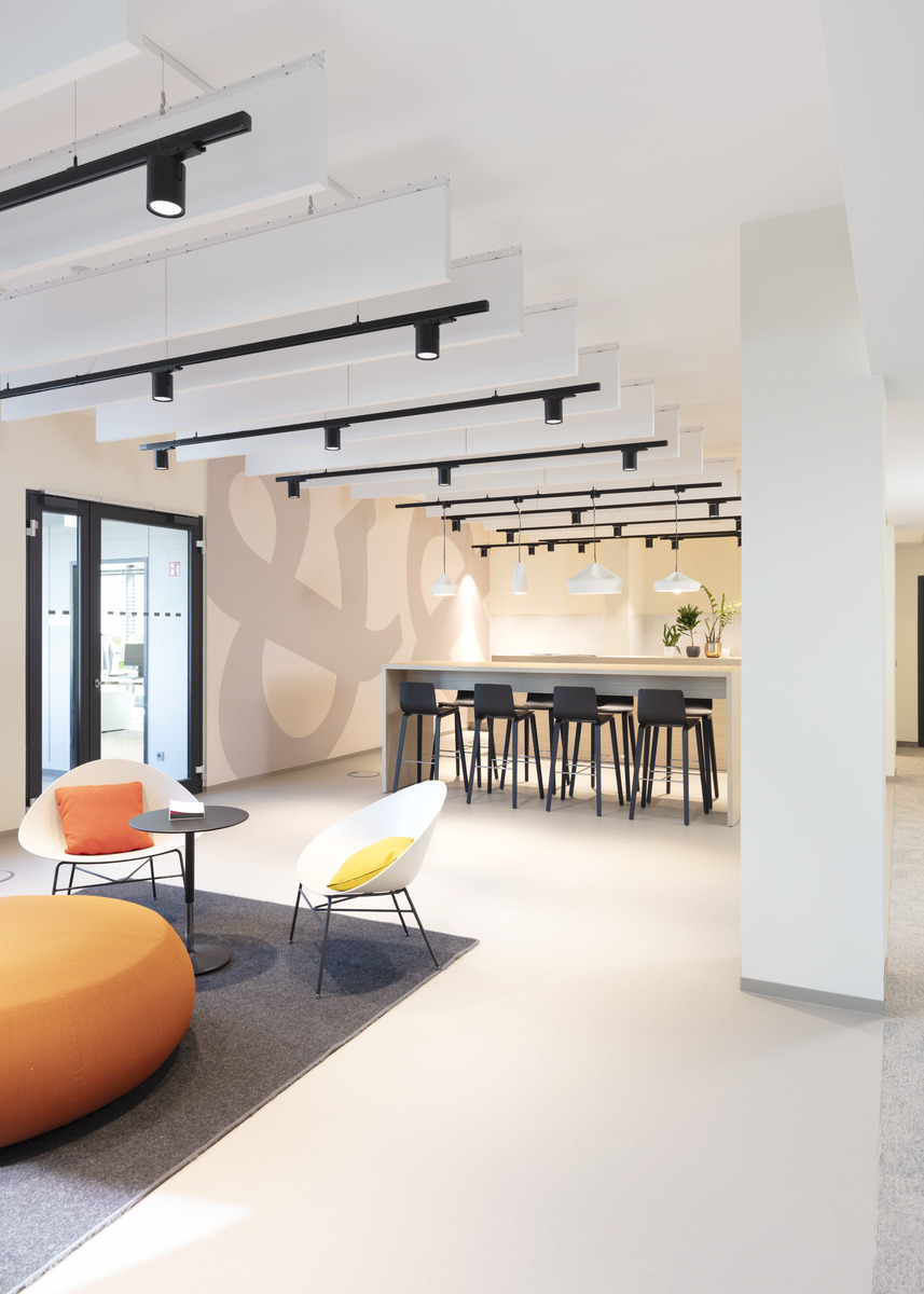 Ein zentrales Element des neuen Raumkonzepts sind die vertikal montierten Ecophon Solo Baffeln. Sie sorgen nicht nur für eine optimale Raumakustik, sondern setzen zugleich ein starkes architektonisches Statement. Die vertikal montierten Absorber lassen sich flexibel anpassen, sowohl in der Höhe als auch im Abstand, und schaffen so eine offene, elegante Atmosphäre, die den Anforderungen zukunftsorientierter Arbeitsumgebungen gerecht wird.