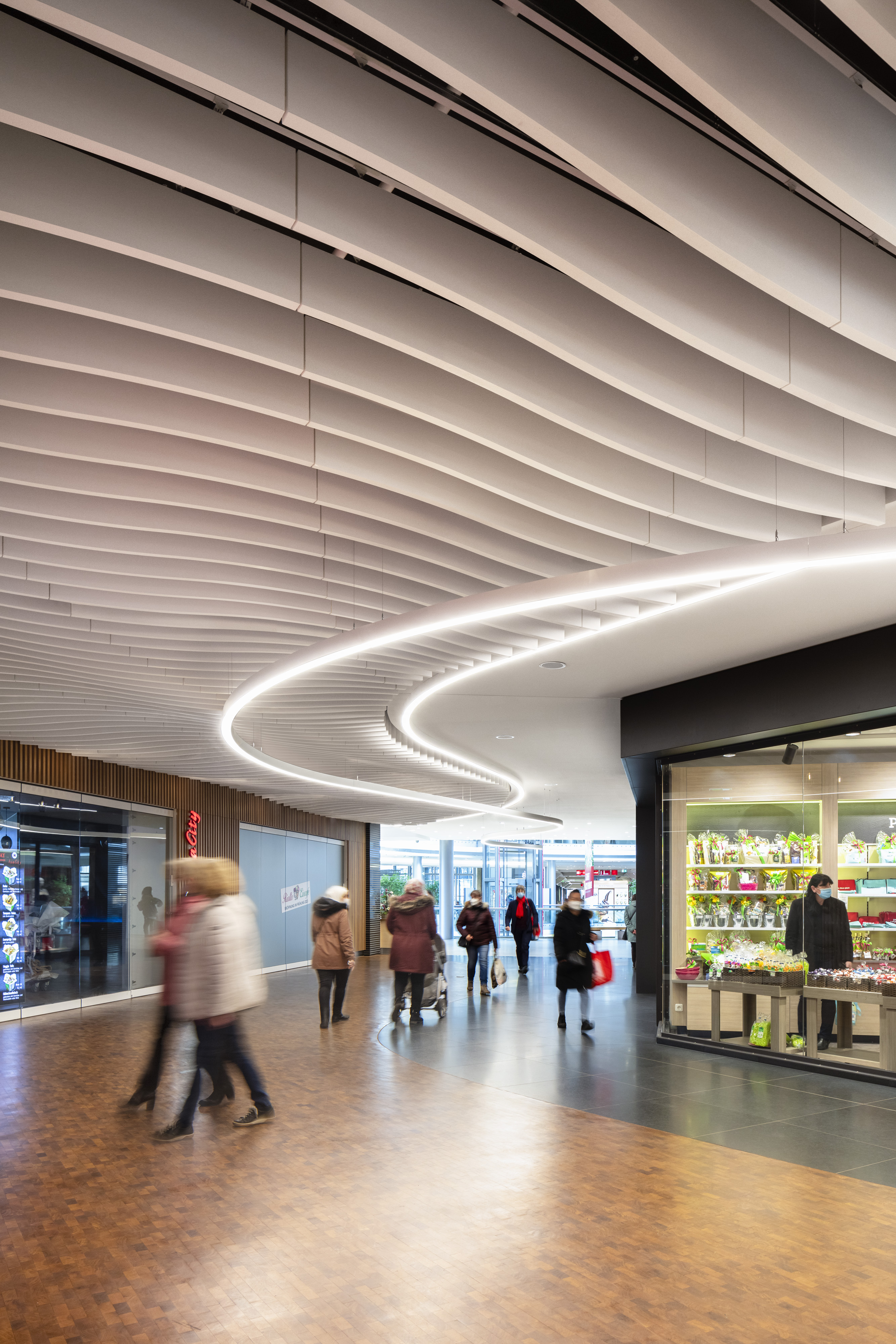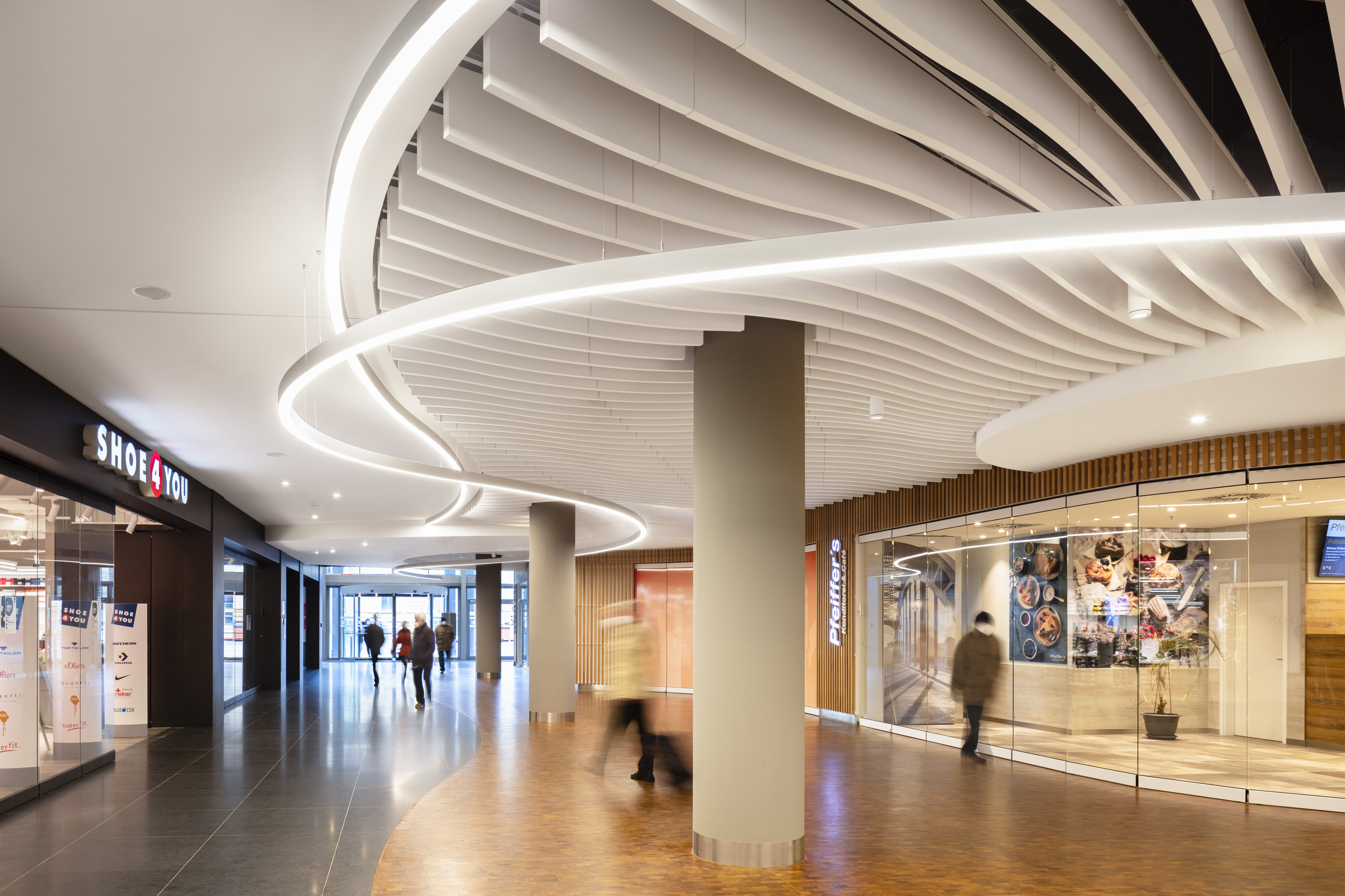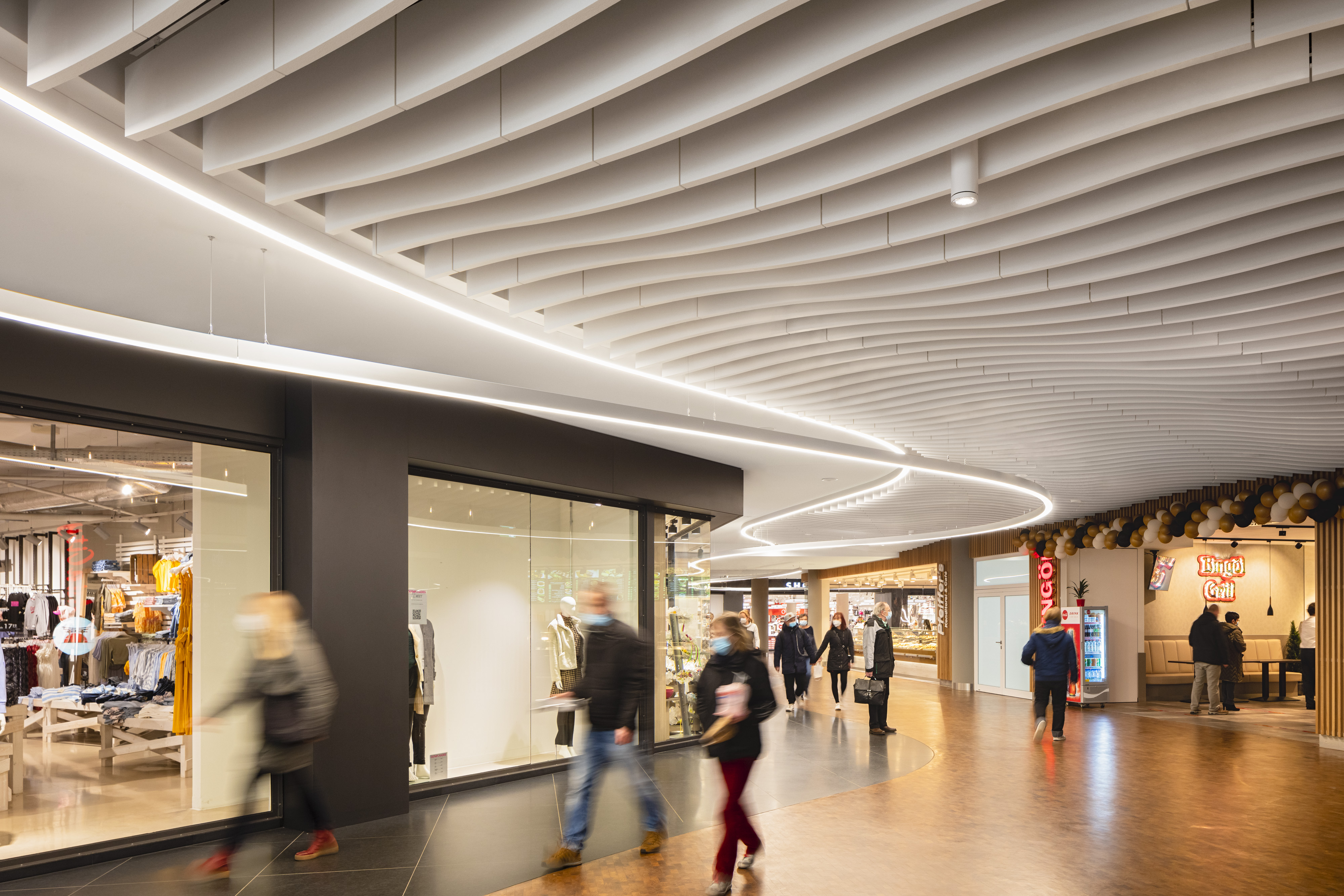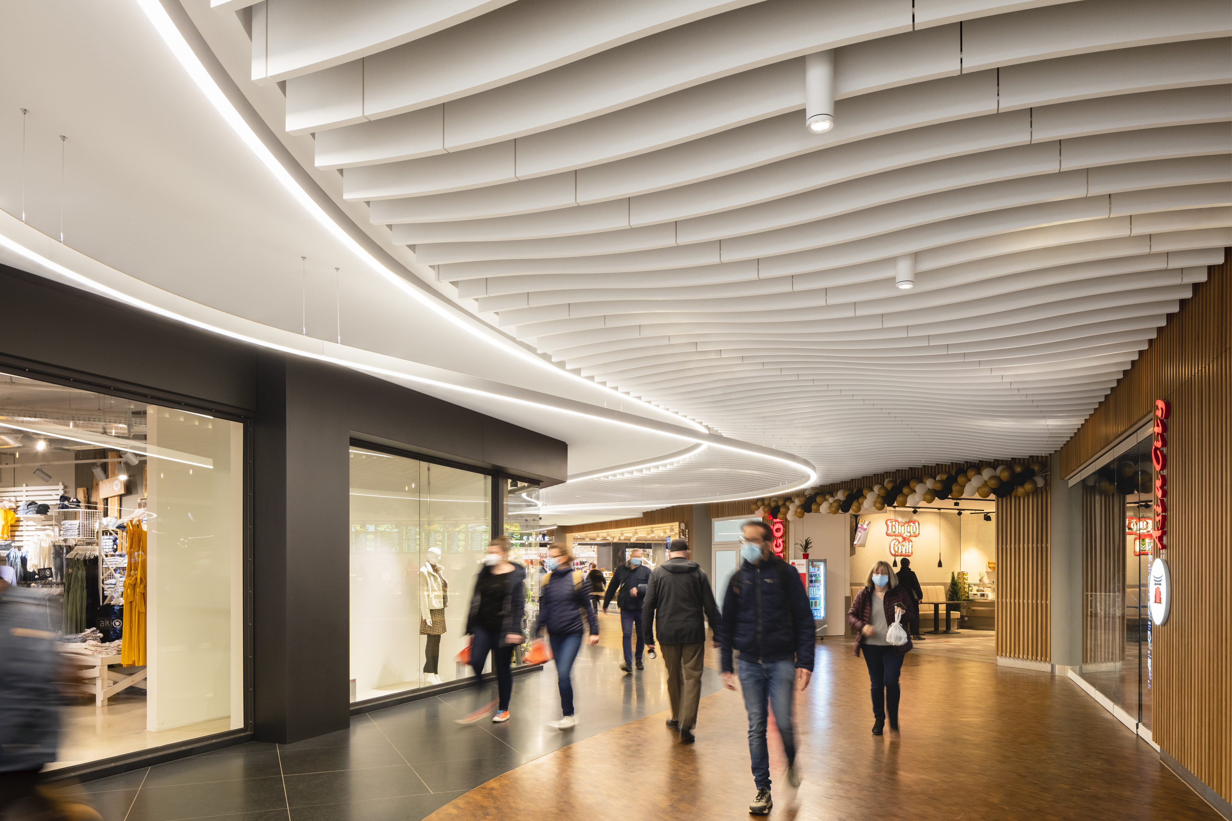 Nach Anfertigung eines Deckenspiegels mit verschiedenen Mustern entschieden sich die Beteiligten für eine Lösung mit wellenförmigen Baffeln. Laut Sandra Oheim (arc Architekten) sei es damit auf der einen Seite gelungen, die verspielte Struktur der Mall elegant und visuell ansprechend fortzuführen. Auf der anderen Seite habe man den Schallpegel effektiv reduzieren können, der vor allem in älteren Einkaufszentren häufig ein Problem darstelle und für ein ungemütliches Klima sorge.