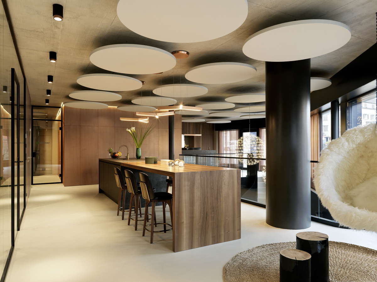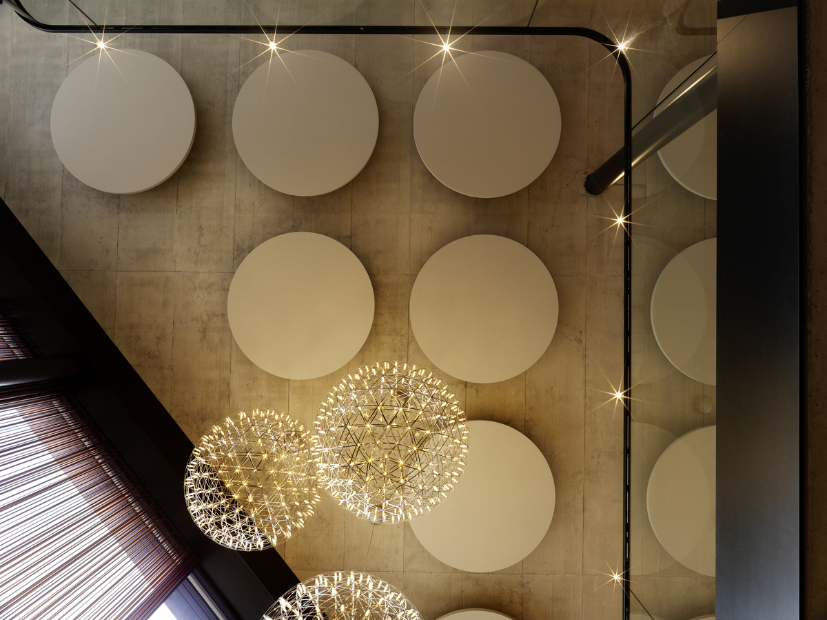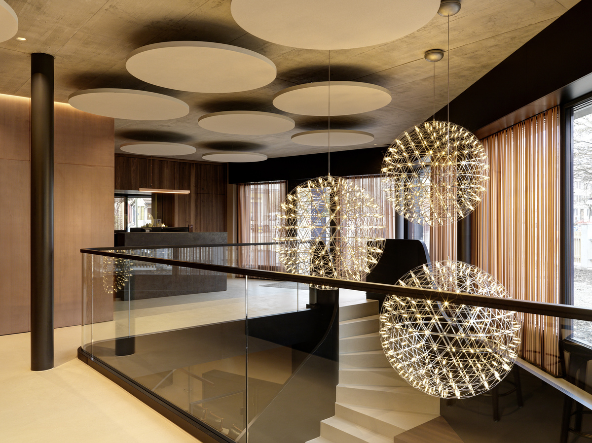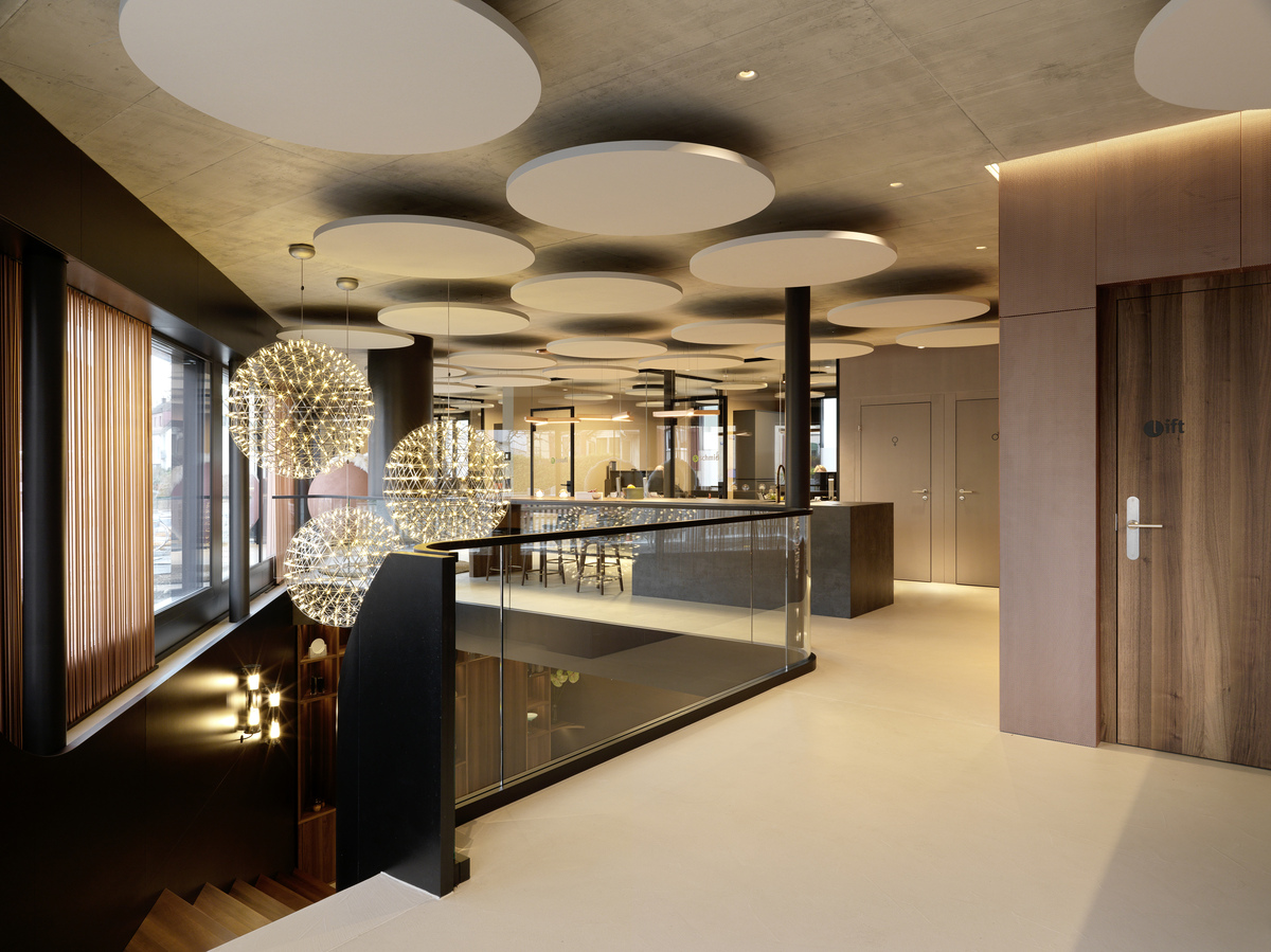 Die klare Geometrie des Gebäudes und die offenen Sichtbetondecken stellten hohe Anforderungen an das Licht‑ und Akustikkonzept: maximale Leistungsfähigkeit bei minimaler visueller Präsenz. Die frei schwebenden, kreisförmigen Deckensegel bringen Weichheit, Balance und einen subtilen architektonischen Rhythmus in die Räume und schaffen eine Atmosphäre, die ruhig, durchdacht und zugleich hochfunktional ist.