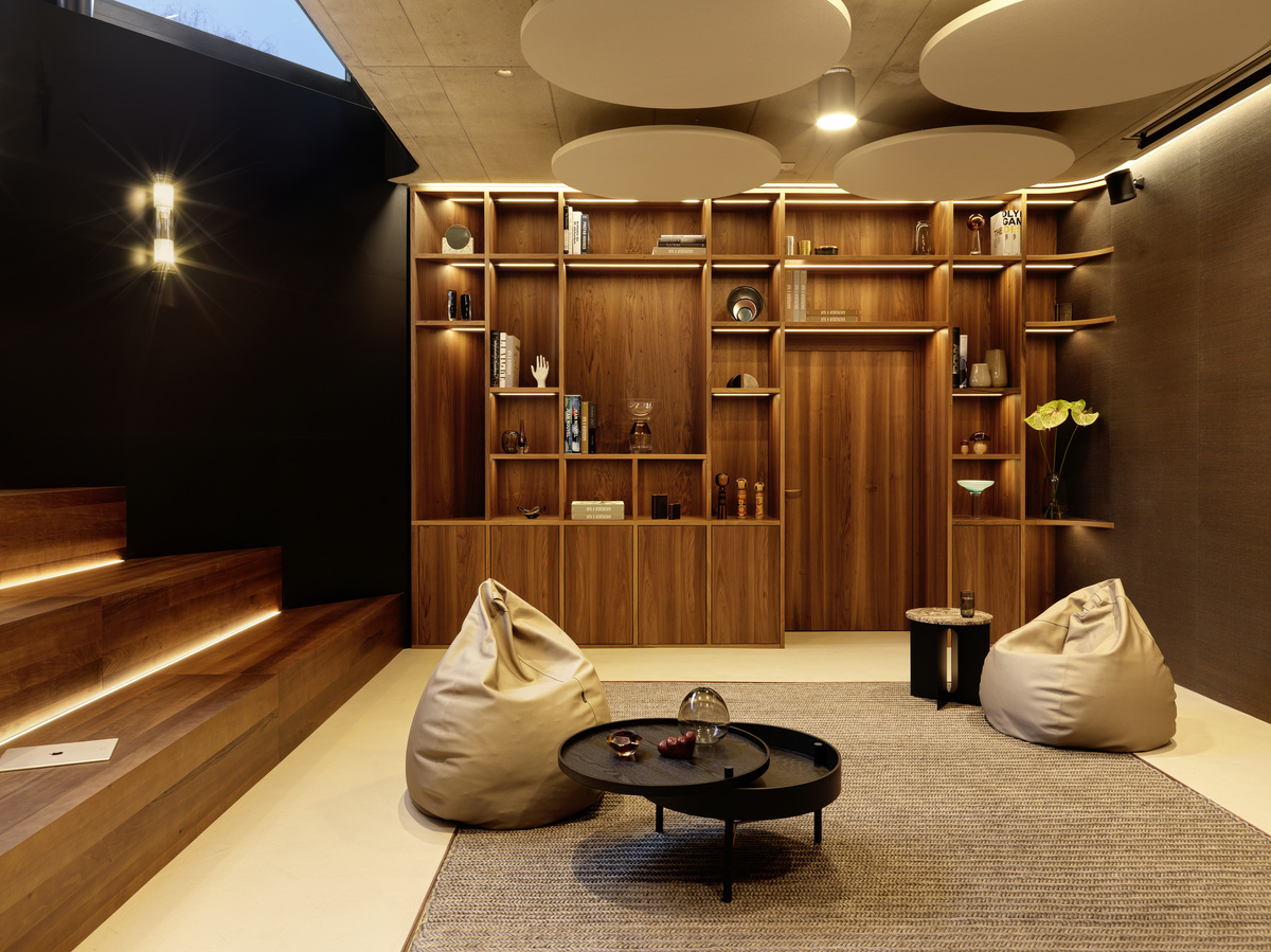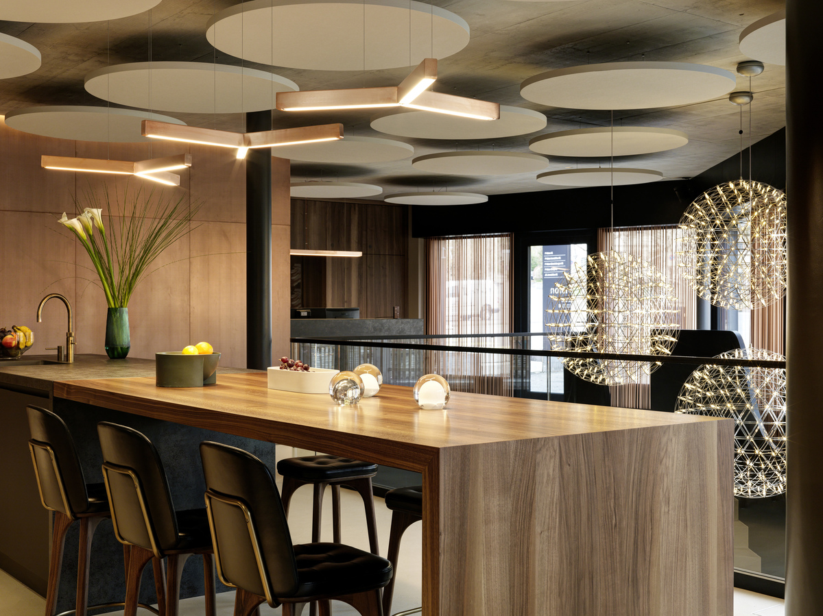 In diesem bewusst minimalistischen Umfeld übernehmen die Deckensegel Ecophon Solo Circle eine zentrale Rolle. Ihre präzise Platzierung unterstützt die räumliche Klarheit und sorgt für hohen akustischen Komfort, ohne die Wirkung der Materialien und Details in den Hintergrund zu drängen.