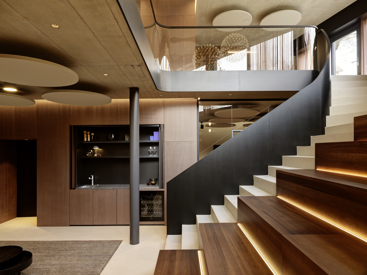 Der neue Bürokomplex des Boutique‑Generalunternehmens P‑Vision ist geprägt von natürlichen Materialien: Kupfer, Sichtbeton und mineralische Bodenbeläge bestimmen das Erscheinungsbild. Mit hoher handwerklicher Qualität und grosser Liebe zum Detail umgesetzt, spiegelt die Materialität sowohl die ressourcenorientierte Arbeitsweise der Baubranche als auch den hohen architektonischen Anspruch des Bauherrn wider.