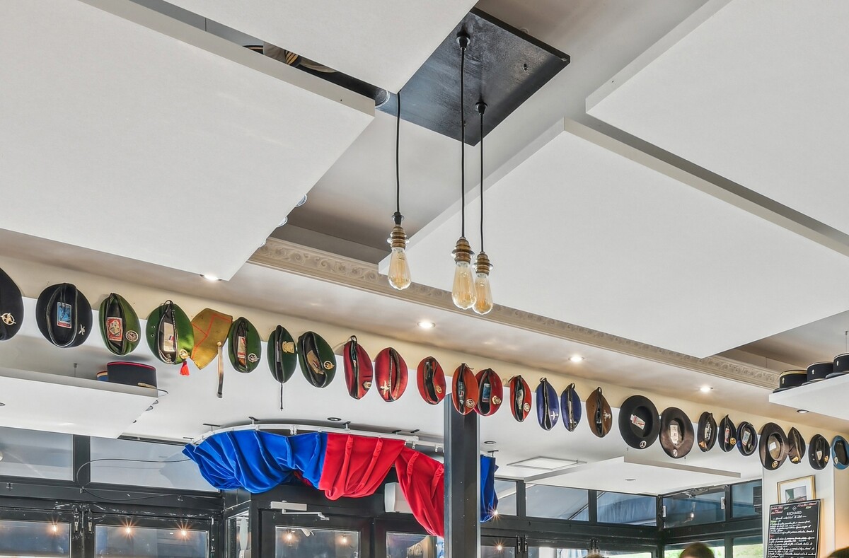 Ecophon arbeitete mit dem Montageunternehmen COTRIS zusammen, um eine Lösung zu entwickeln, die sowohl akustischen als auch optischen Anforderungen gerecht wird. Um den Nachhall zu reduzieren und im gesamten Gastraum eine angenehmere Atmosphäre zu schaffen, montierte COTRIS eine Kombination aus Ecophon Akusto™ Wall C-Paneelen an den Wänden sowie abgehängte Ecophon Solo™ Square- und Ecophon Solo™ Rectangle-Schallabsorber an der Decke.