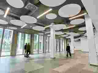 Entdecken Sie, wie das neue Büro von P‑Vision rohe, nachhaltige Materialien mit den Deckensegeln Ecophon Solo Circle verbindet und so eine ruhige, präzise und handwerklich hochwertig gestaltete Arbeitsumgebung schafft.