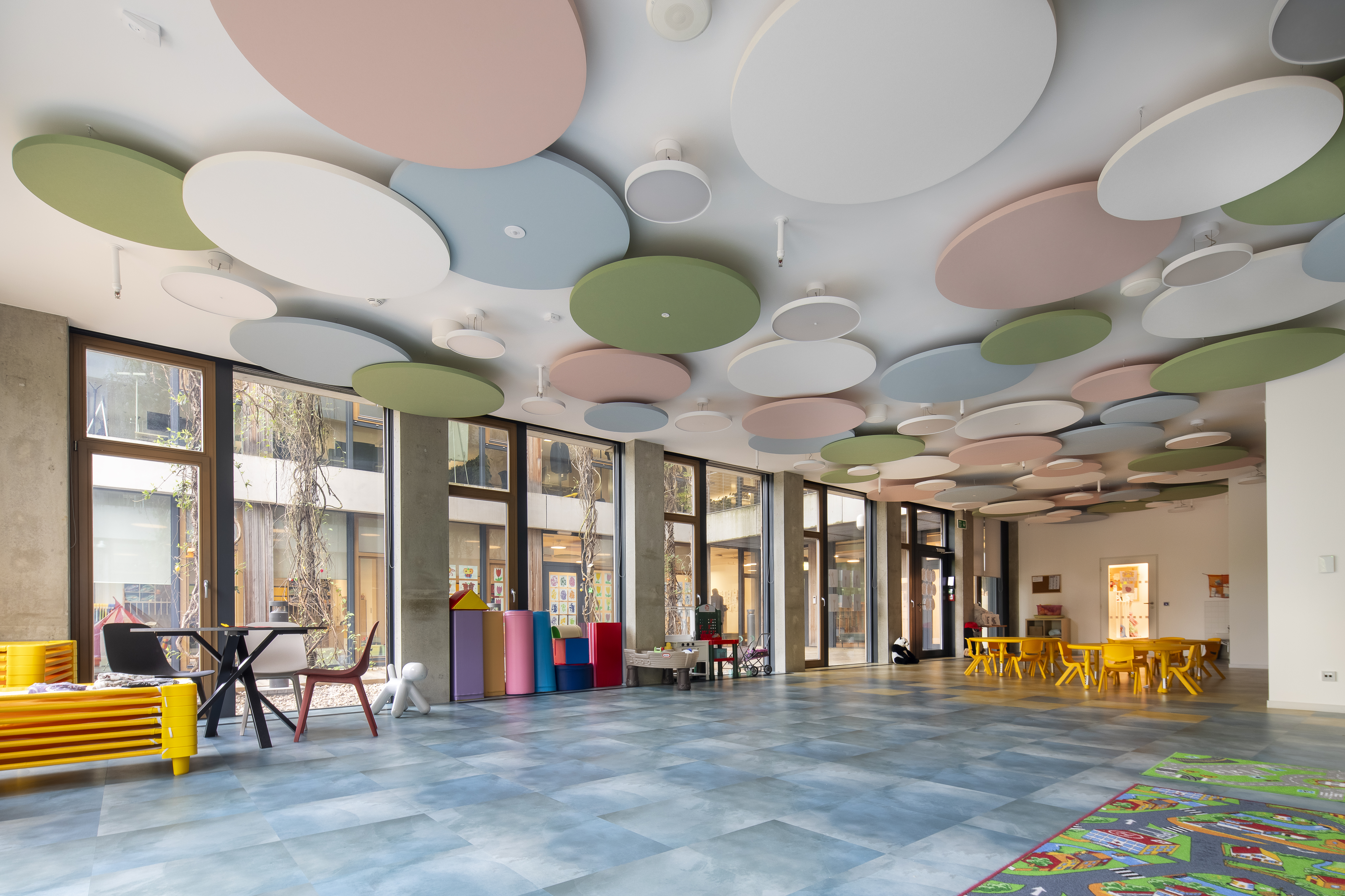 Die Farbe einer Akustikdecke beziehungsweise der Akustiklösung ist entscheidend für den Raumeindruck und das Wohlbefinden der Menschen im Raum. Studien zeigen, dass Farben einen großen Einfluss auf ein ansprechendes Umfeld sowie auf glücklichere und gesündere Menschen haben. Ecophon bietet verschiedene Farben für unterschiedliche Raumtypen an, um sowohl optische als auch akustische Anforderungen zu erfüllen.