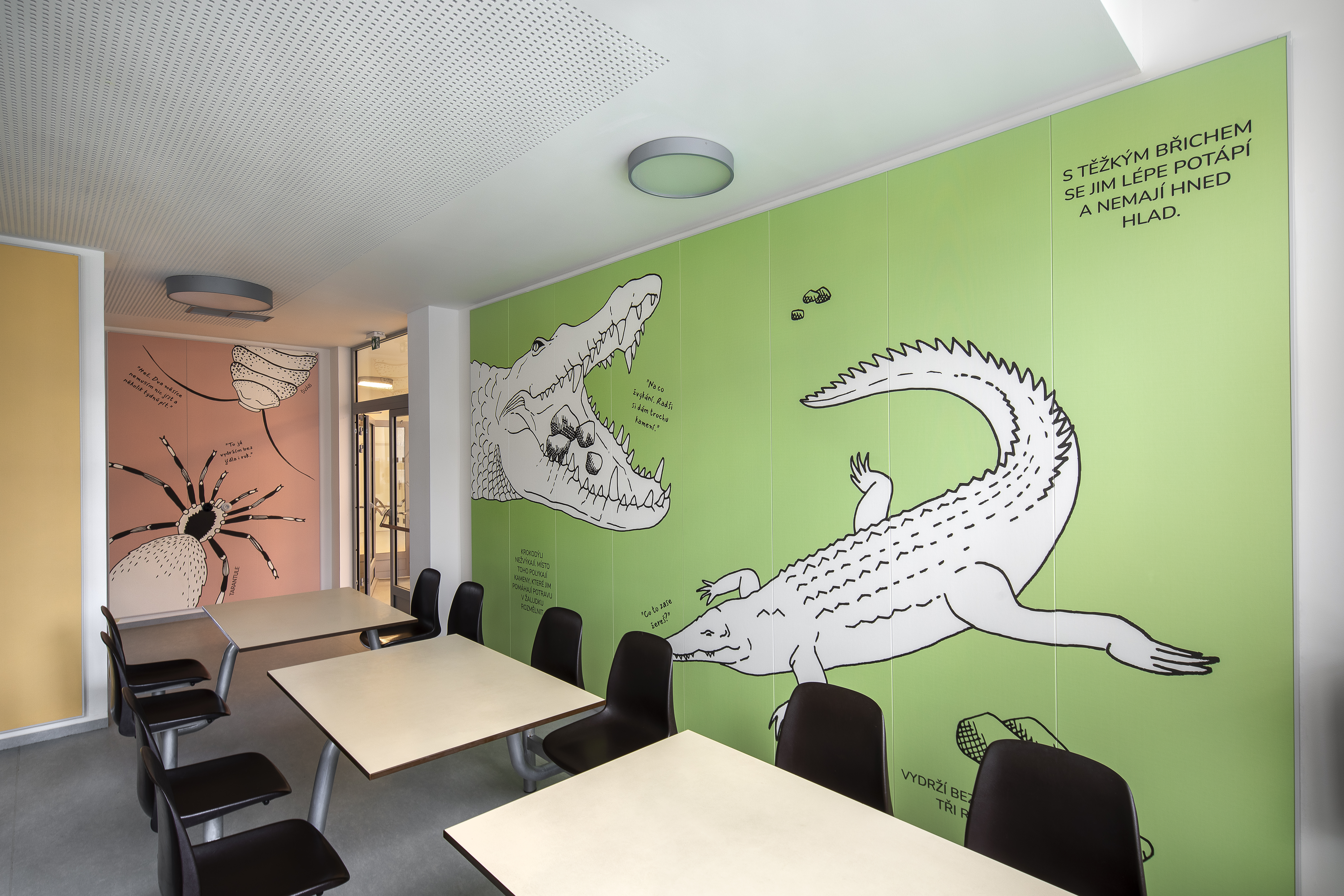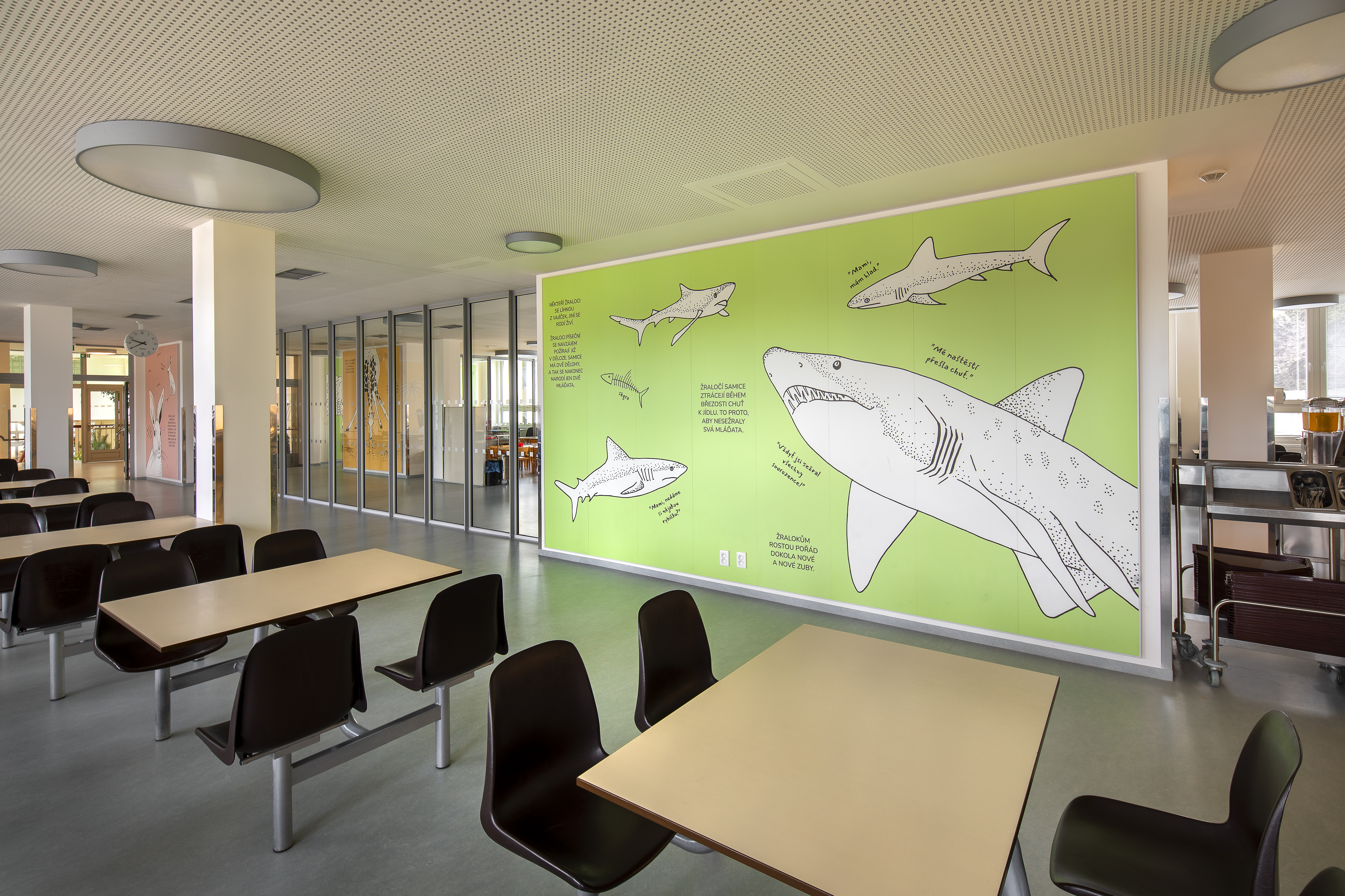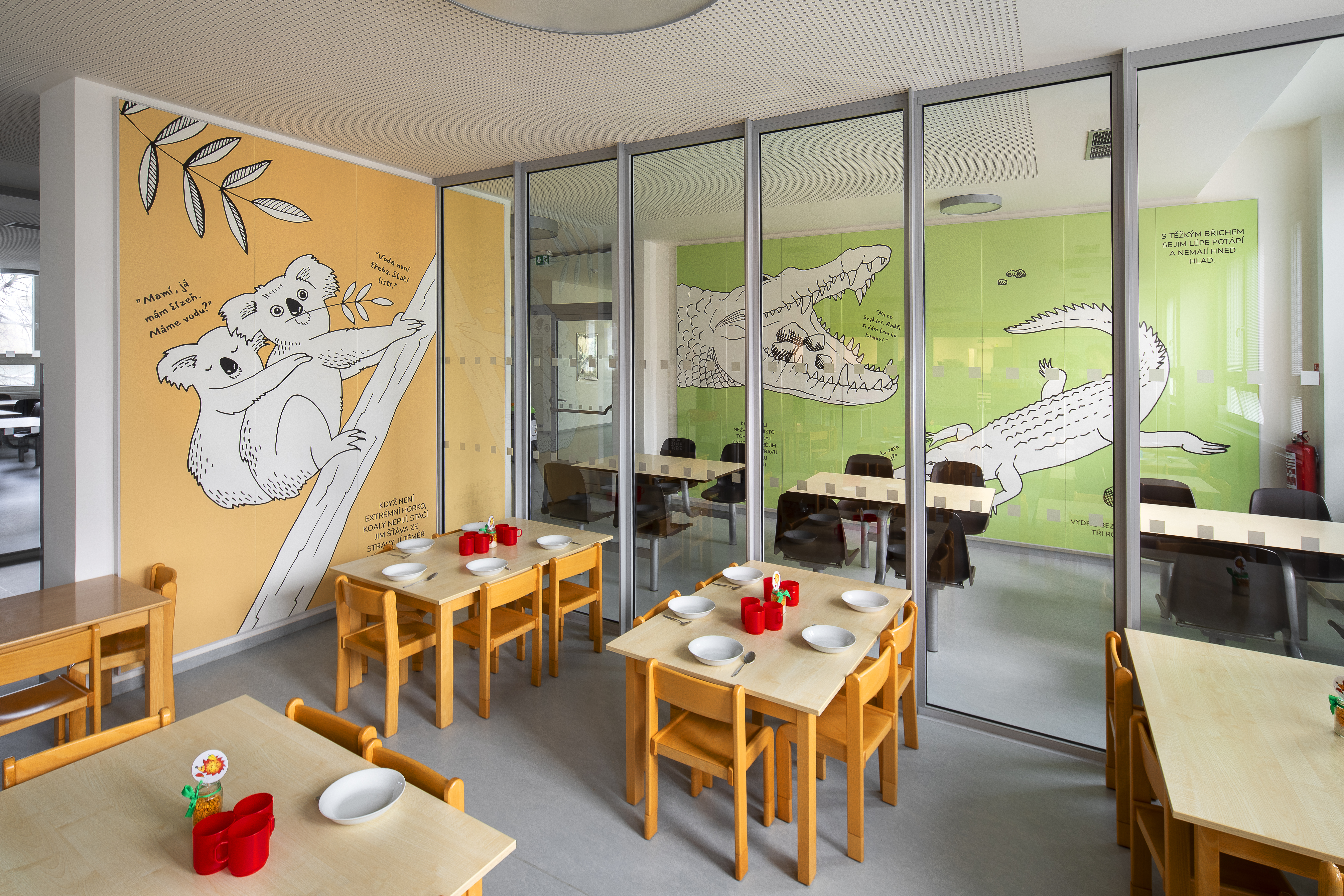 V jídelně se objevují velkoformátové ilustrace zvířat, jako jsou pandy, pavouci, žraloci, krokodýli a zajíci, a každé z nich doprovází zajímavé fakty. Výsledek? Děti jsou zvědavé, učí se nové informace a zároveň si mohou užívat prostředí, kde je slyšet jejich hlas, aniž by musely namáhat své hlasivky.