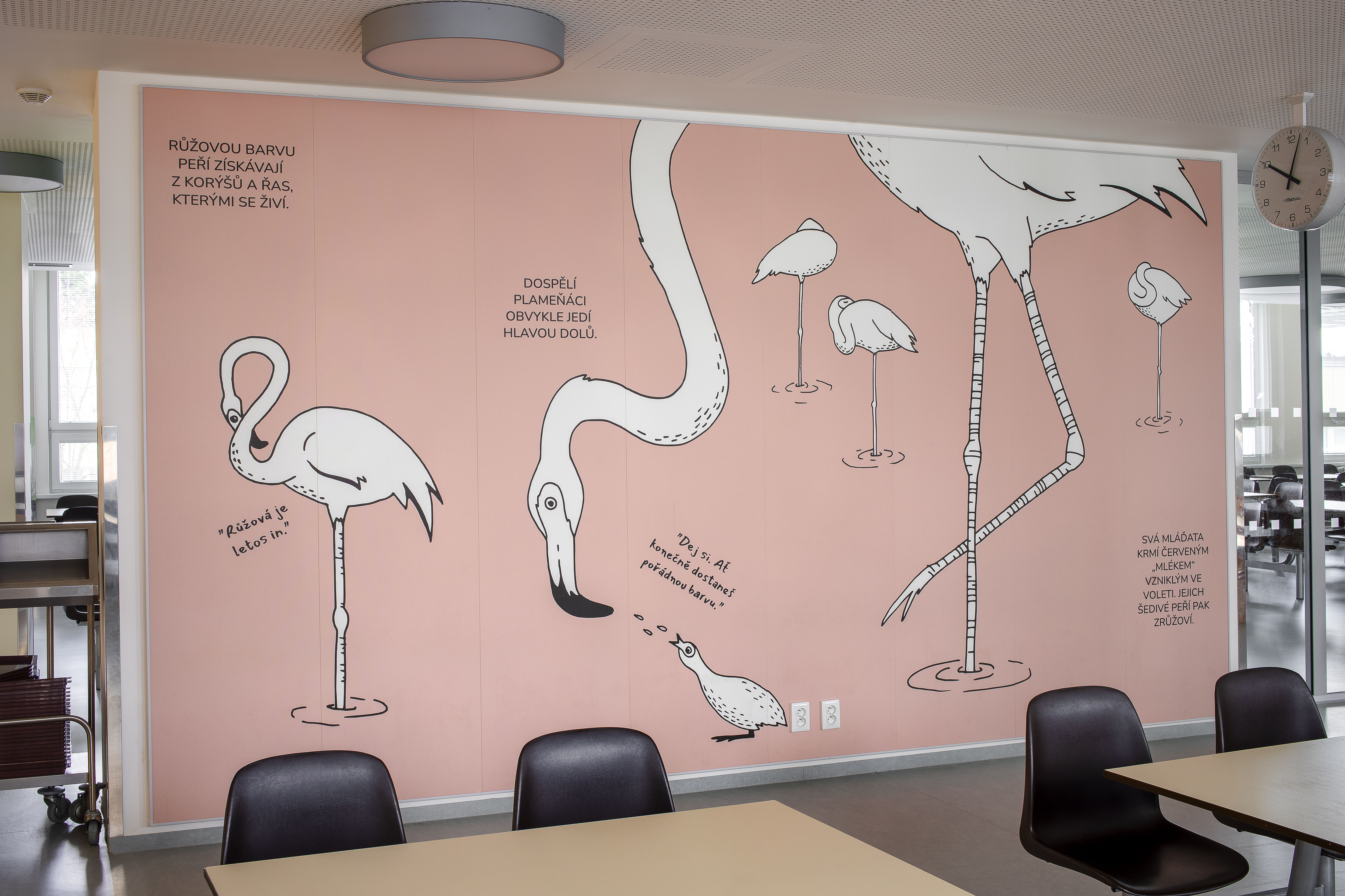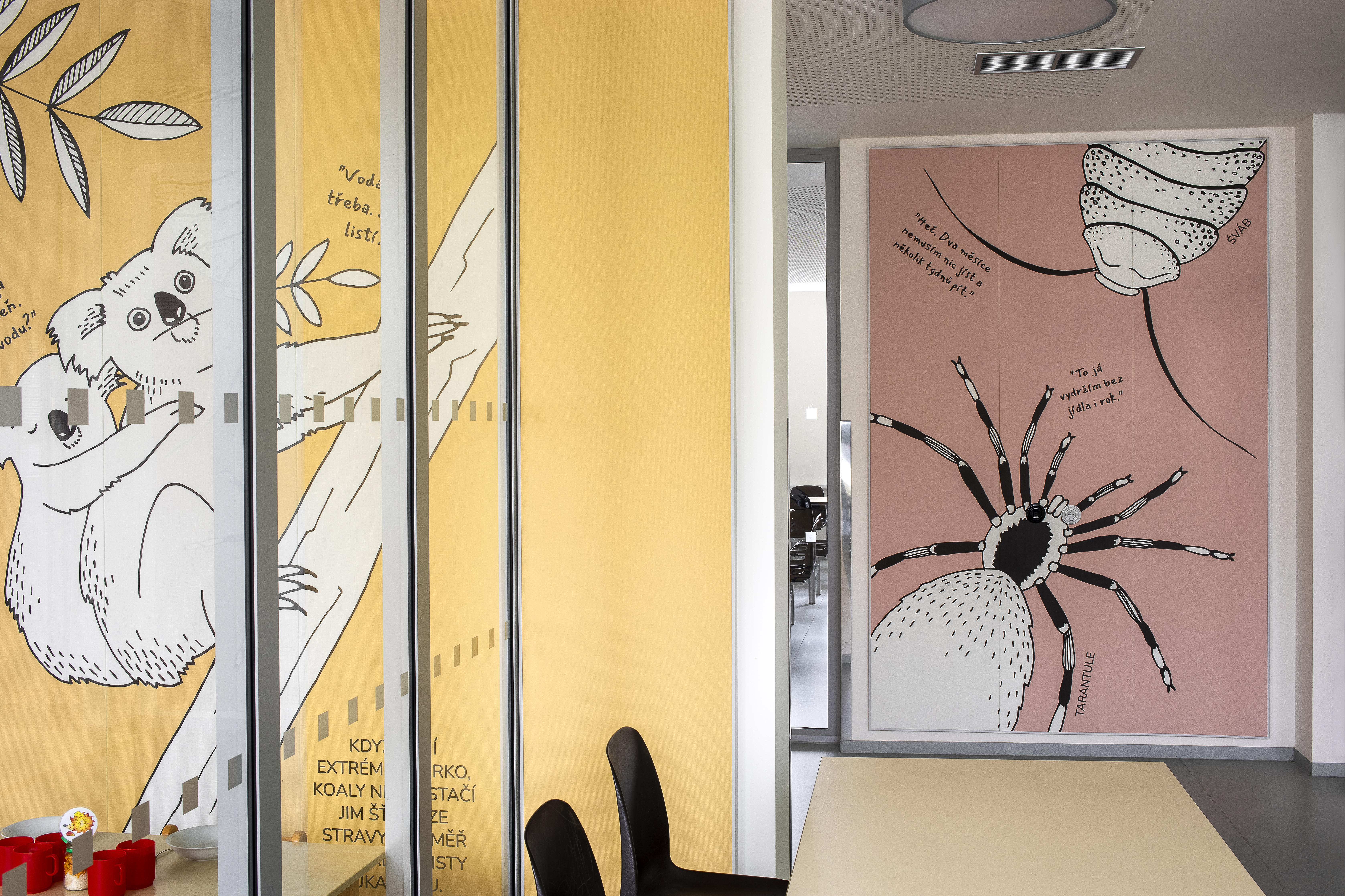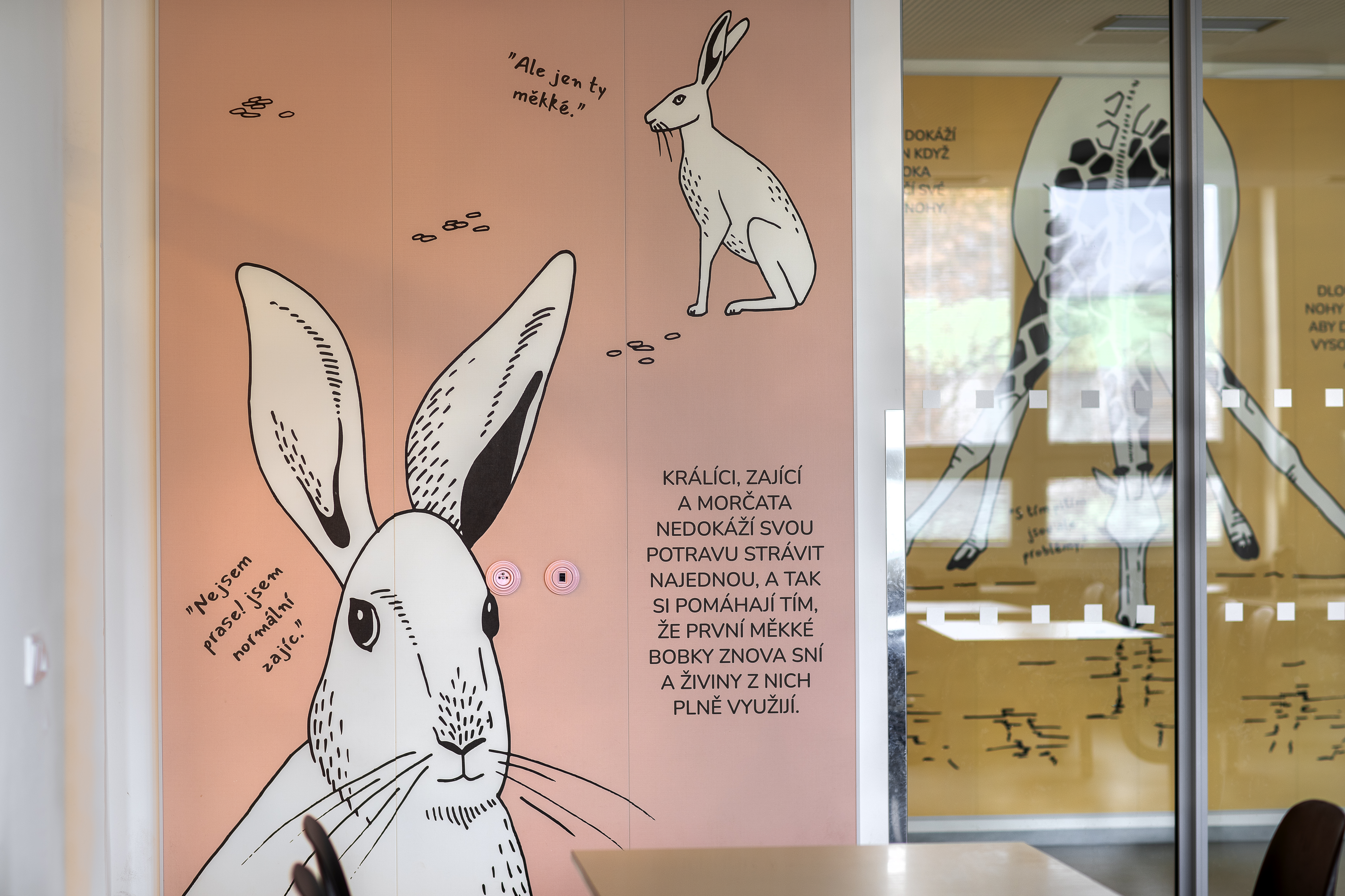 V jídelně se objevují velkoformátové ilustrace zvířat, jako jsou pandy, pavouci, žraloci, krokodýli a zajíci, a každé z nich doprovází zajímavé fakty. Výsledek? Děti jsou zvědavé, učí se nové informace a zároveň si mohou užívat prostředí, kde je slyšet jejich hlas, aniž by musely namáhat své hlasivky.