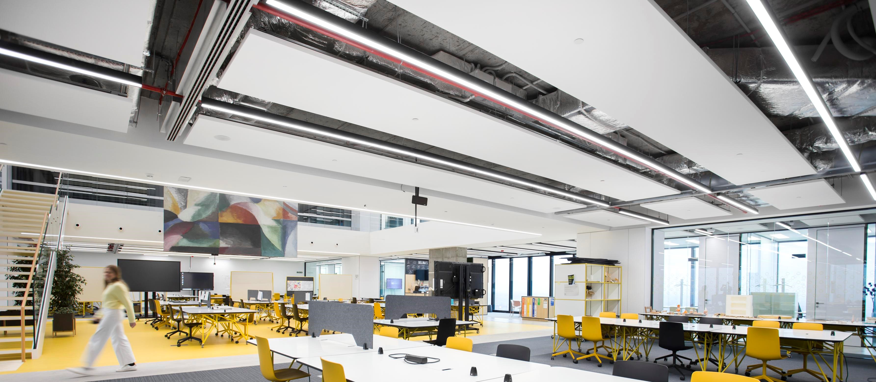 Ecophon Solo Matrix Celsius ist dank einheitlicher Formate beider Paneelarten flexibel planbar, auf jeden Anspruch anpassbar und geeignet für Neubau wie Bestand.