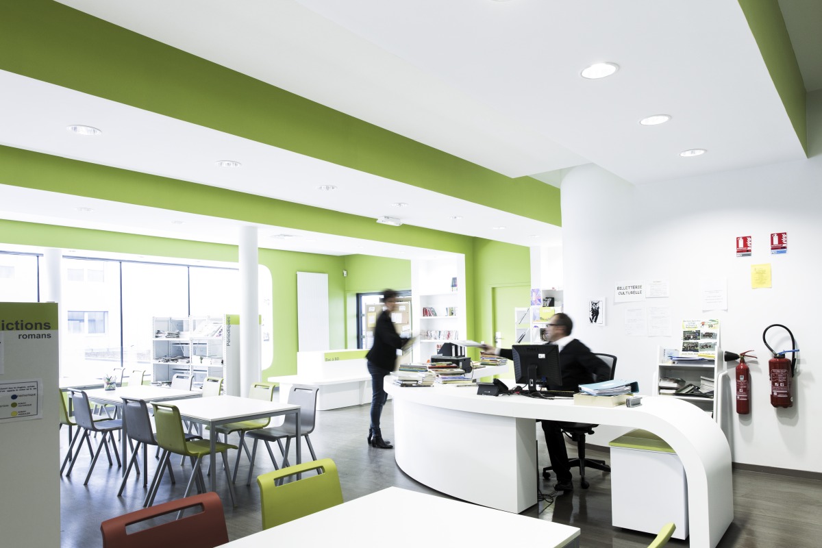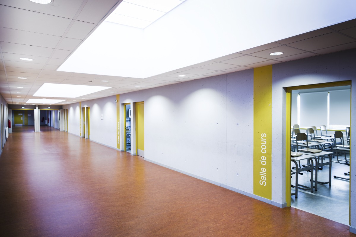 Als Niedrigenergiehaus verfügt das BBC College Saint Exupéry über ein thermoaktives Bauteilsystem, ein sog. TABS (Thermally Activated Building System). Bei der Planung der Inneneinrichtung musste daher berücksichtigt werden, dass die Kühleffekte von Wand- und Deckenoberflächen ausgehen. Der Architekt Guillaume Dufour vom Architekturbüro Marie-Pascal Bouchez wählte für den Innenausbau deshalb die freihängenden Deckenelemente Solo. Diese Bauteile lassen sich ausgezeichnet mit Beleuchtungskonzepten kombinieren und schaffen eine angenehme Atmosphäre sowohl durch ihre gestalterische Wirkung als auch durch die ausgezeichnete Raumakustik, wobei die Funktionsweise des TABS nicht beeinträchtig wird.