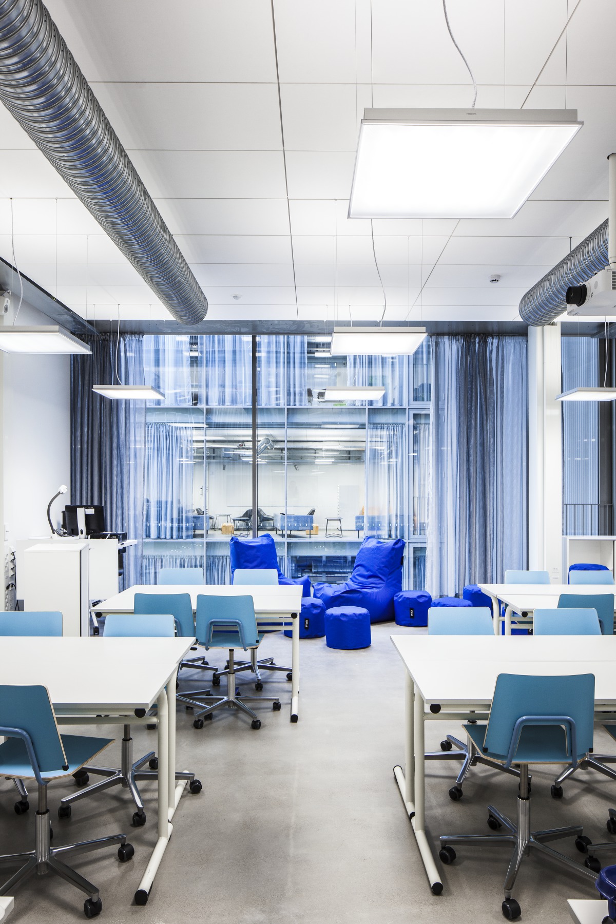 Auch die Möblierung der Klassenräume ist flexibel. Tische und Stühle sind mit Rollen ausgestattet und können leicht und ohne Lärmentwicklung bewegt werden. Teppichböden vermindern die Rollgeräusche und die Akustikdecken absorbieren effektiv den allgemeinen Hintergrundlärm.
