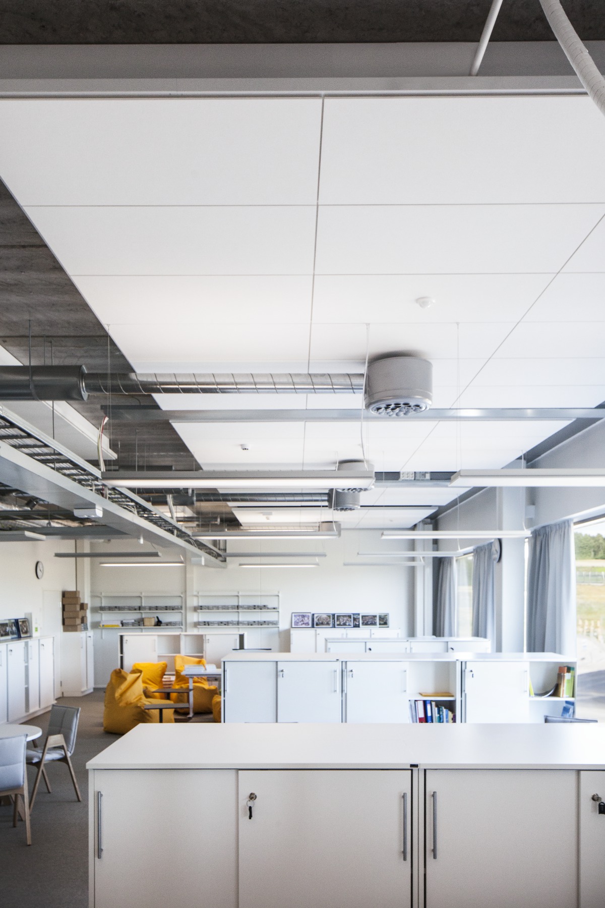 In herkömmlichen Klassenräumen basiert die Planung der Raumakustik auf dem Verhältnis zwischen Schallabsorption und Reflexion. Dafür werden schallabsorbierende Akustikdecken montiert, während in der Raummitte eine Deckenoberfläche verwendet wird, die Sprache reflektiert. Auf diese Weise breitet sich die Stimme des Redners besser im gesamten Raum aus.