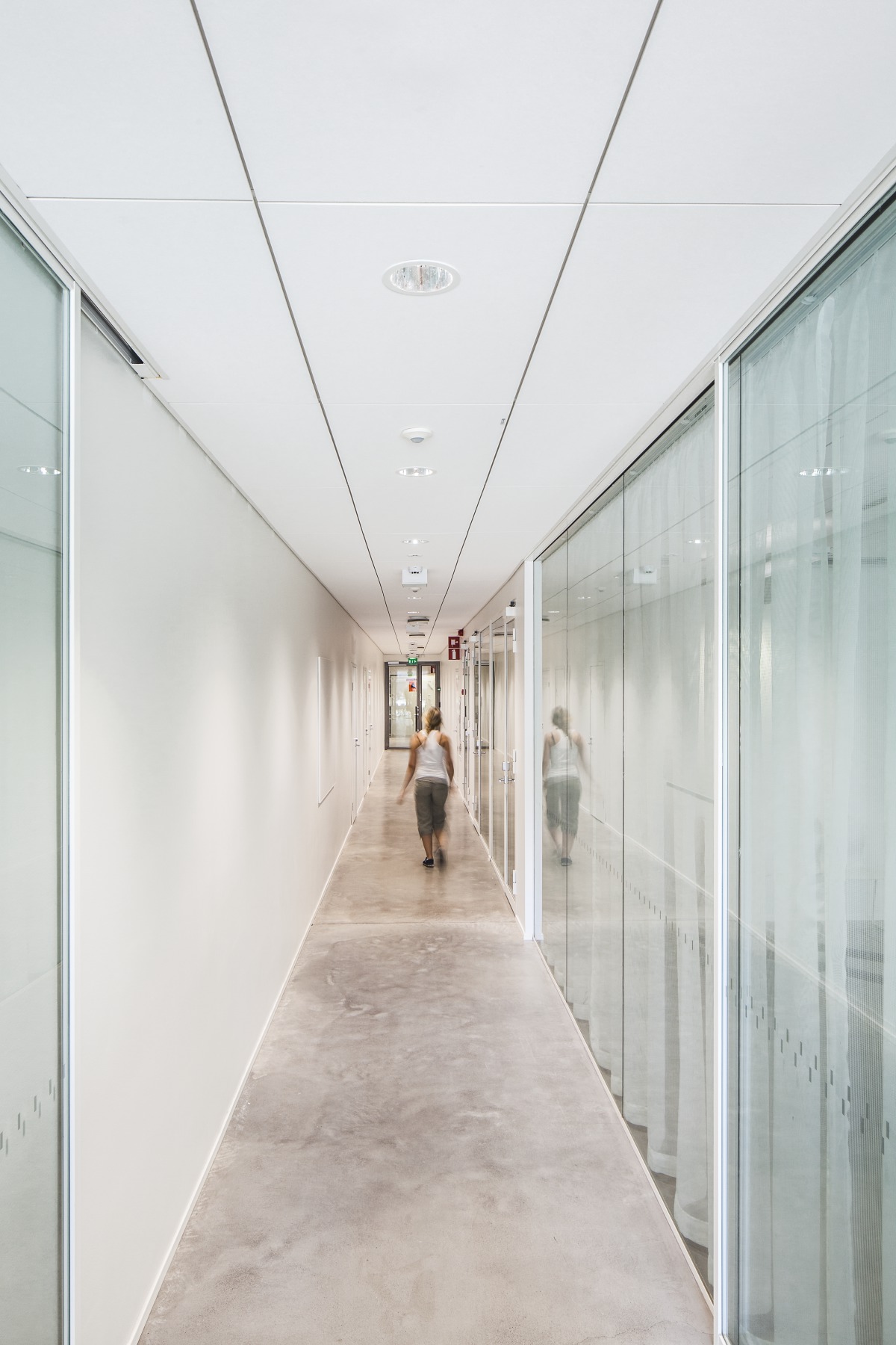 Wenn ein Raum nur wenige oder gar keine festen Wände hat, wird die Optimierung der Raumakustik zu einer architektonischen Herausforderung. In Opinmäki gibt es viele Glasflächen, um Weiträumigkeit und gute Lichtverhältnisse zu schaffen, was allerdings die Ausbreitung von Lärm begünstigt.