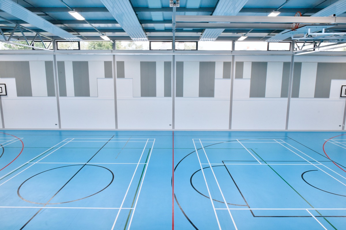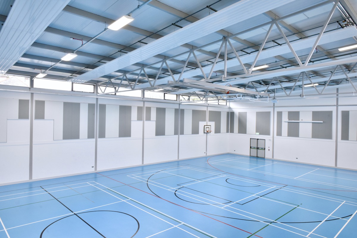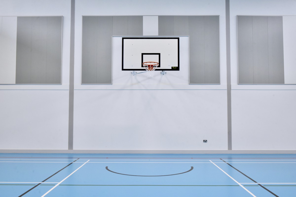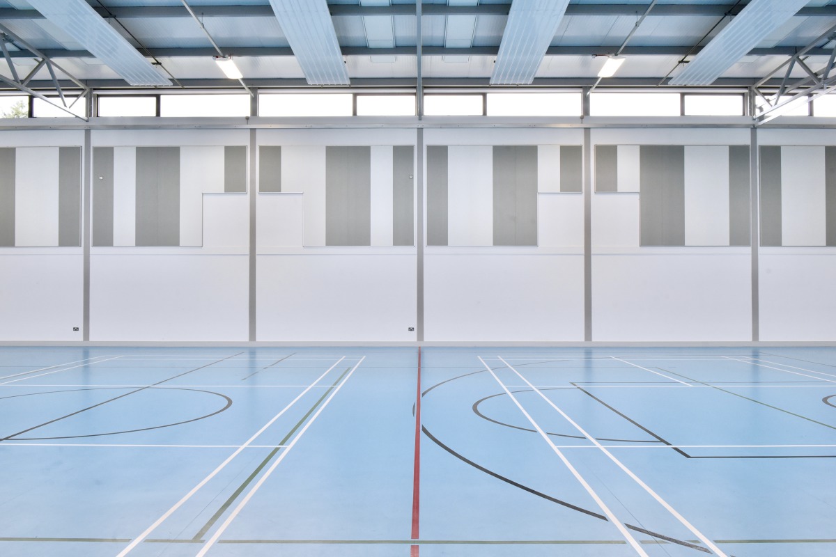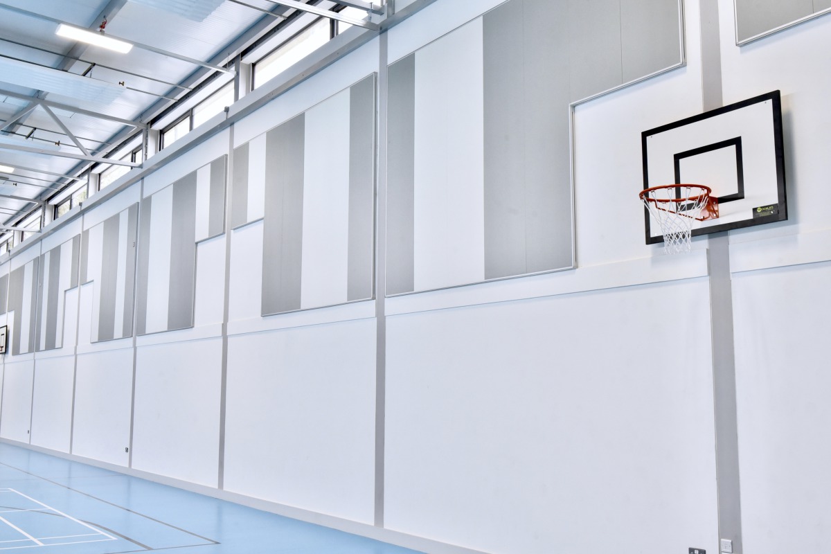 Justin Maguire sagte: "Wir haben uns für Super G entschieden, weil das Produkt optisch ansprechend ist und die von uns geforderte akustische Leistung erreicht und mit der Garantiezusage robust genug ist, um den Auswirkungen von Ballspielen standzuhalten." Ziel der Akustiklösung in der Sporthalle war es, den Schallpegel so niedrig wie möglich zu halten, Echos zu reduzieren und es den Menschen zu ermöglichen, mit normaler Lautstärke zu sprechen und sich dennoch Gehör zu verschaffen. Super G sind stoßfeste Decken- und Wandpaneele der Klasse 1A, die einen Glaswollekern aus schallabsorbierendem Material der Klasse A besitzen.