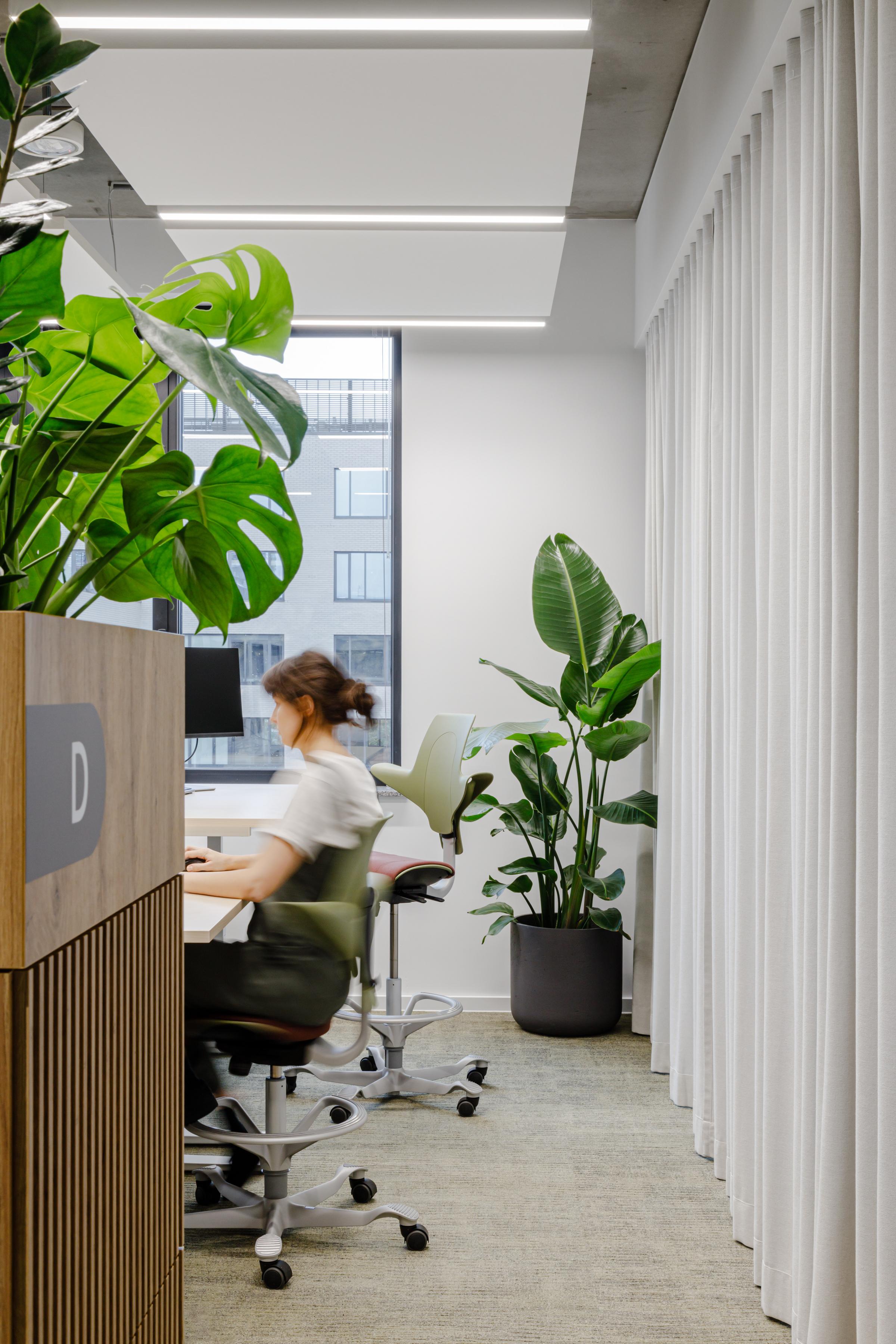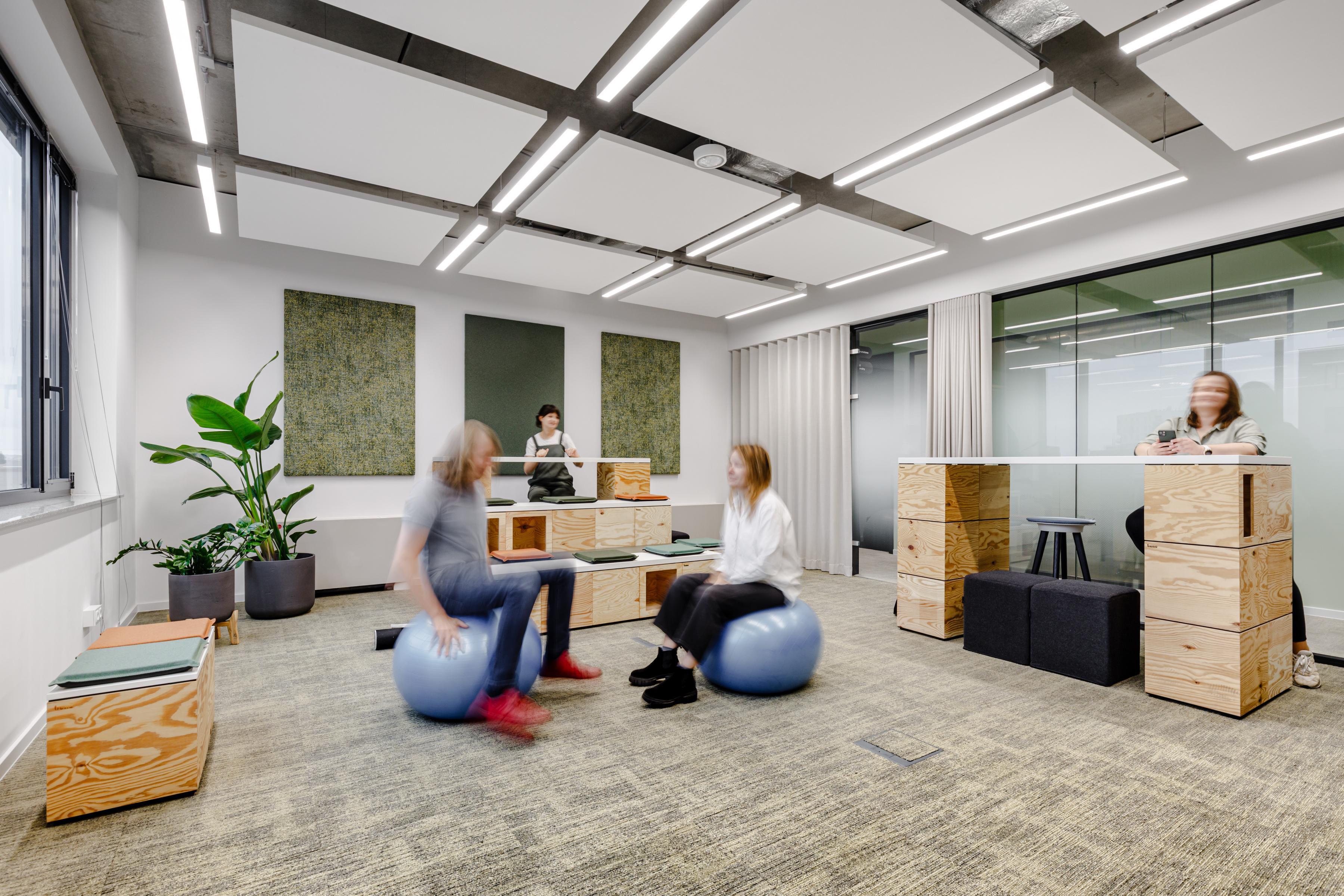 Eine große, aber positive Überraschung für die Designer war der Zustand der zuvor verwendeten modularen und freihängenden Deckensegel, die wie neu waren. Einige der wiederverwendeten Ecophon Solo™ Deckensegel wurden bedruckt, um ihnen ein neues Aussehen zu verleihen und sie in das neue Design des Büros einzupassen.