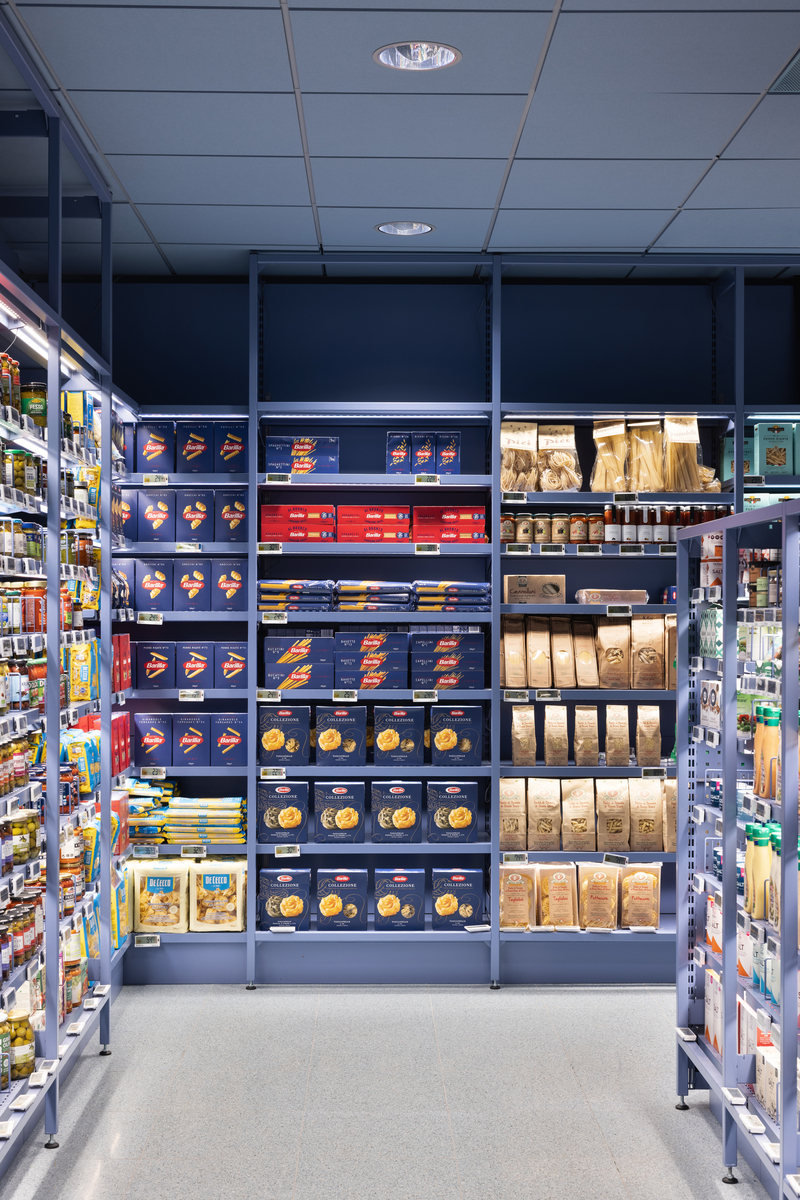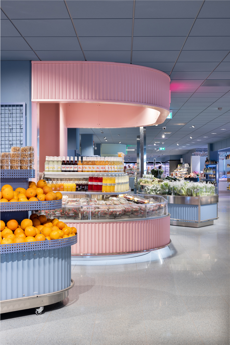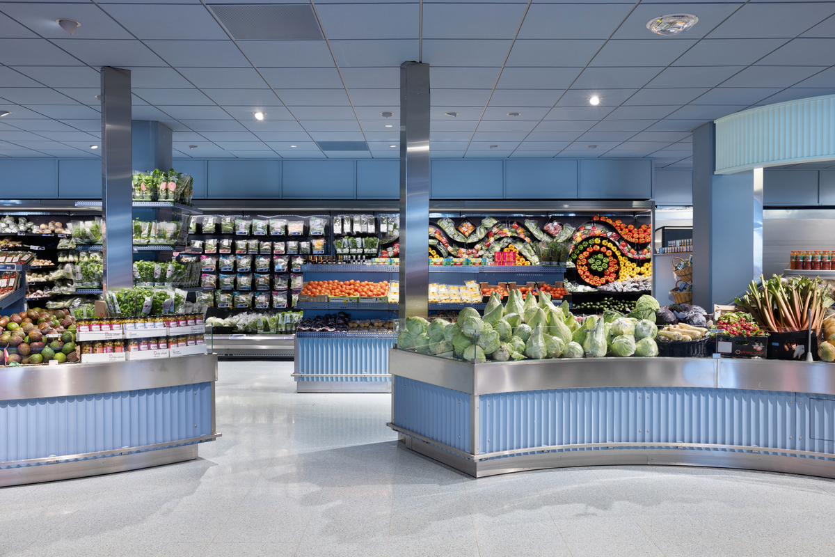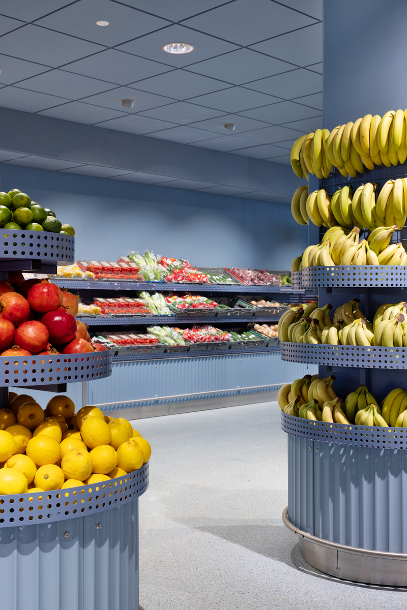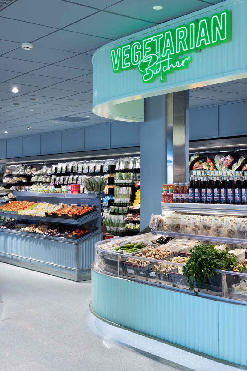Zusammen mit den verschiedenen Themenstationen wie der Saft- und Smoothie-Bar, der Seafood-Bar und der zentralen Deli-Station, die an eine Markthalle erinnert, hat der Laden einen klaren Fokus auf Ästhetik und Funktion.