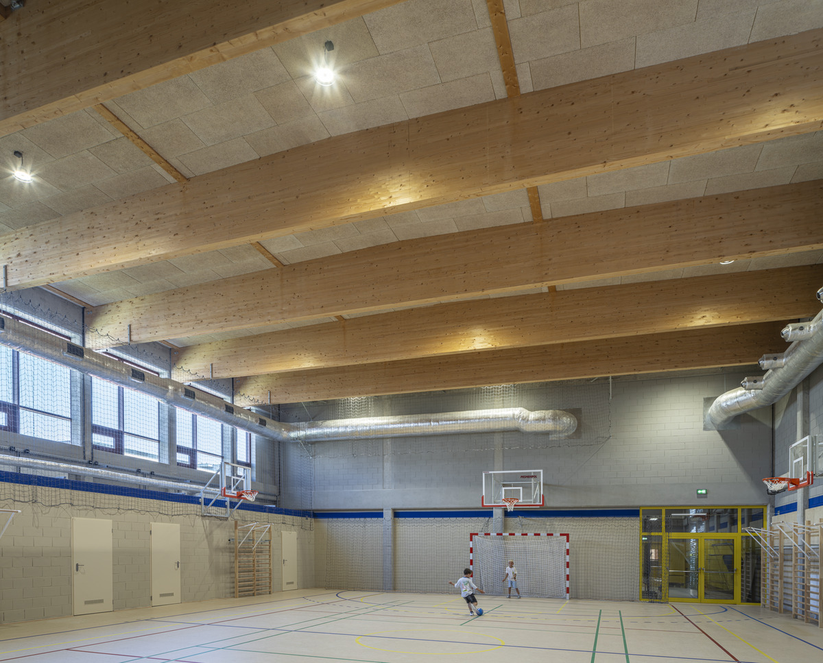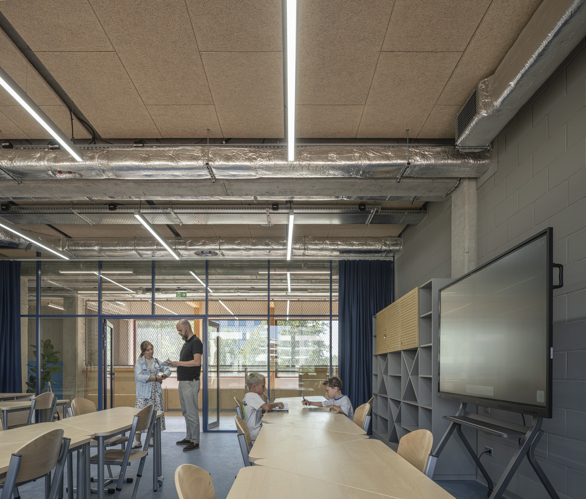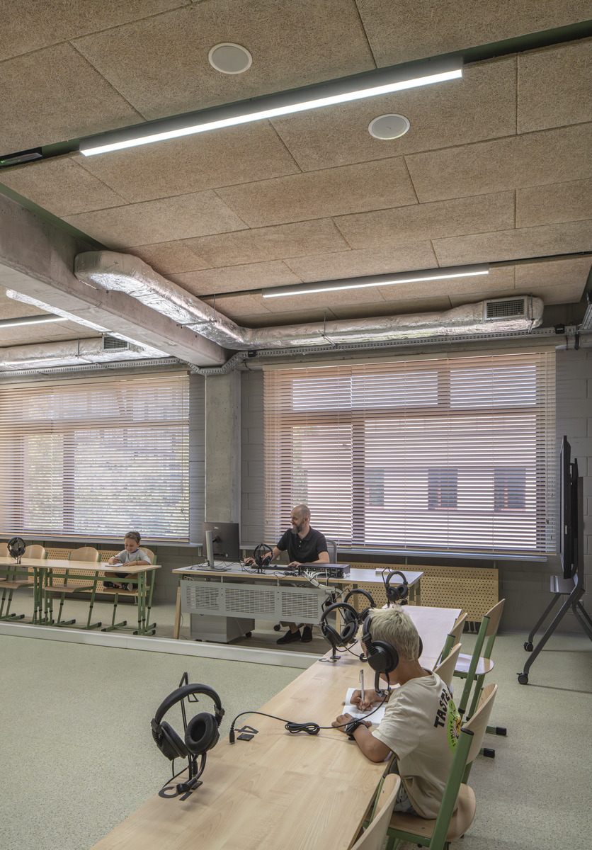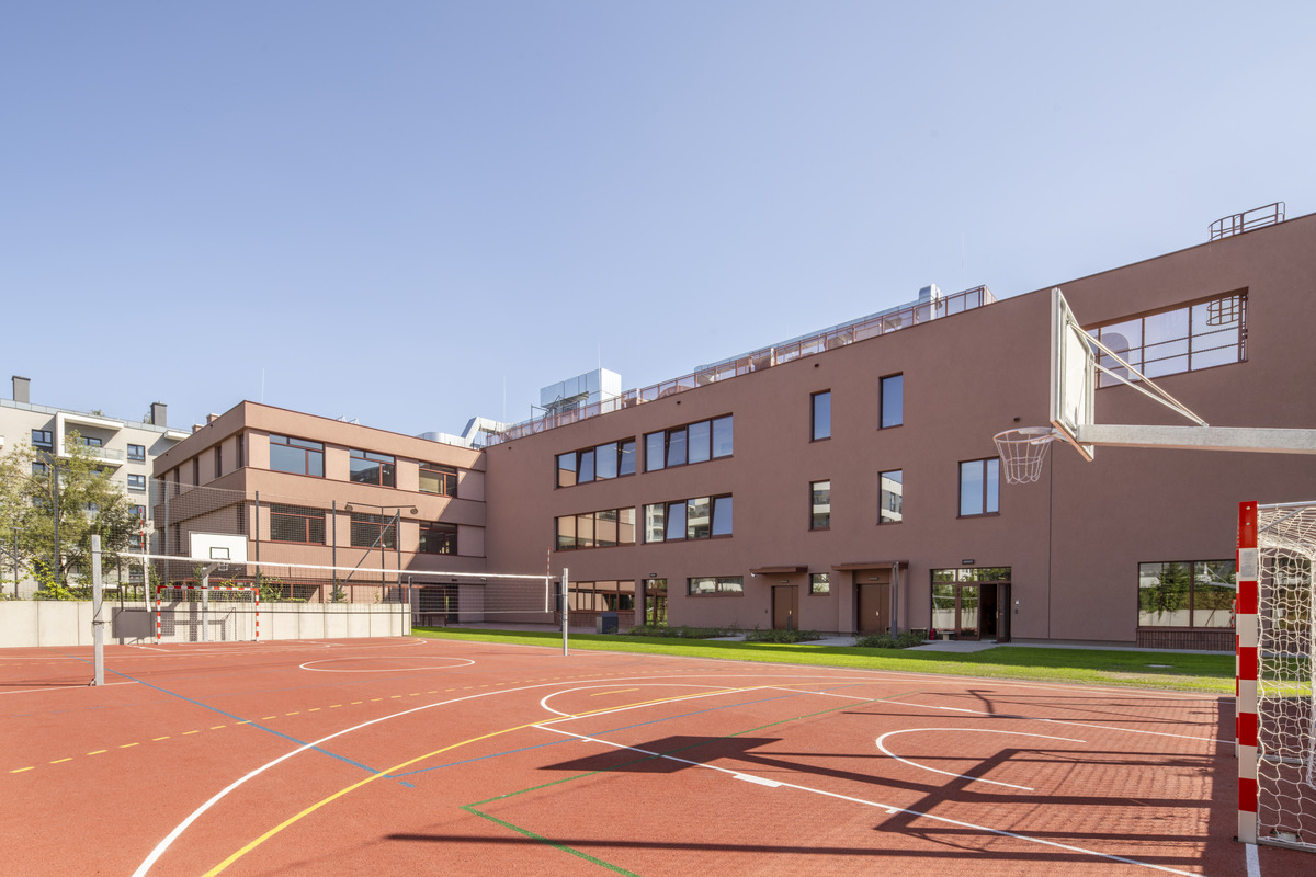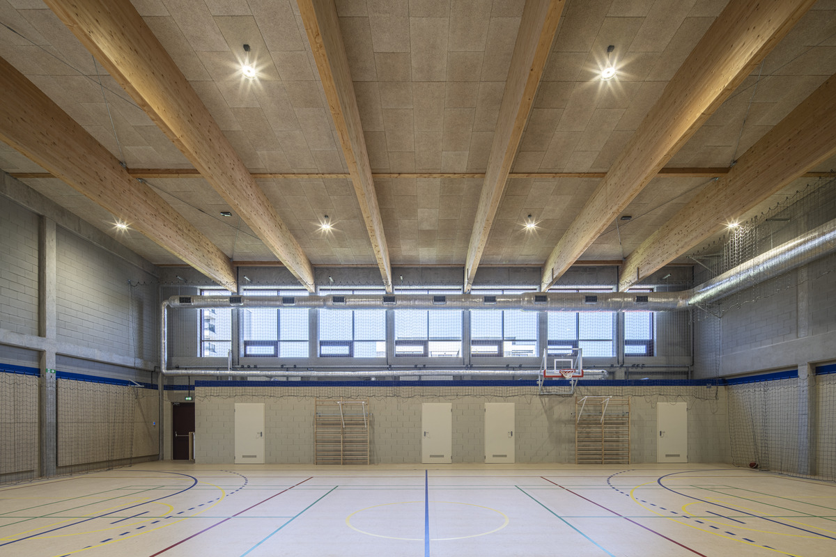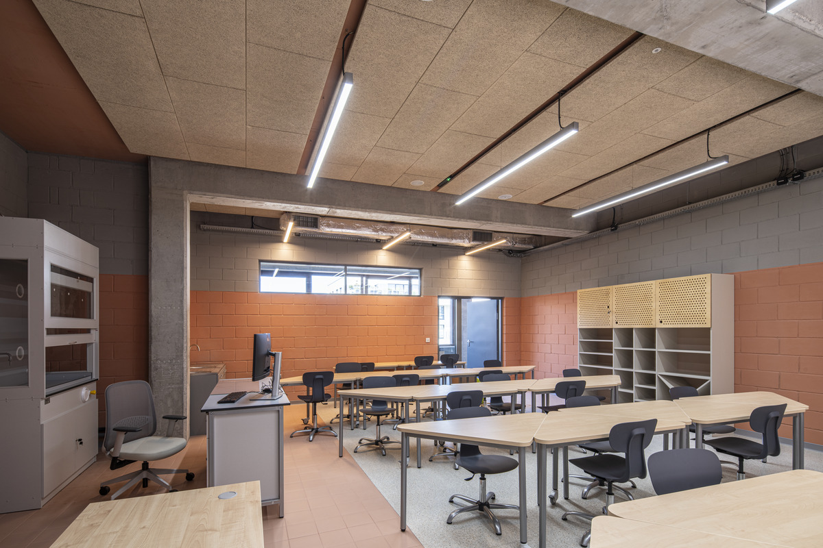Das von den Architekten WWAA entworfene Konzept setzt stark auf natürliche Materialien wie Beton, Holz und Stein. Mit seiner minimalistischen Ästhetik, inspiriert vom amerikanischen Schuldesign, bietet das Gebäude offene Lernbereiche und großzügig verglaste Klassenzimmer, die viel Tageslicht ins Innere lassen. Diese Merkmale stellen jedoch auch akustische Herausforderungen dar.