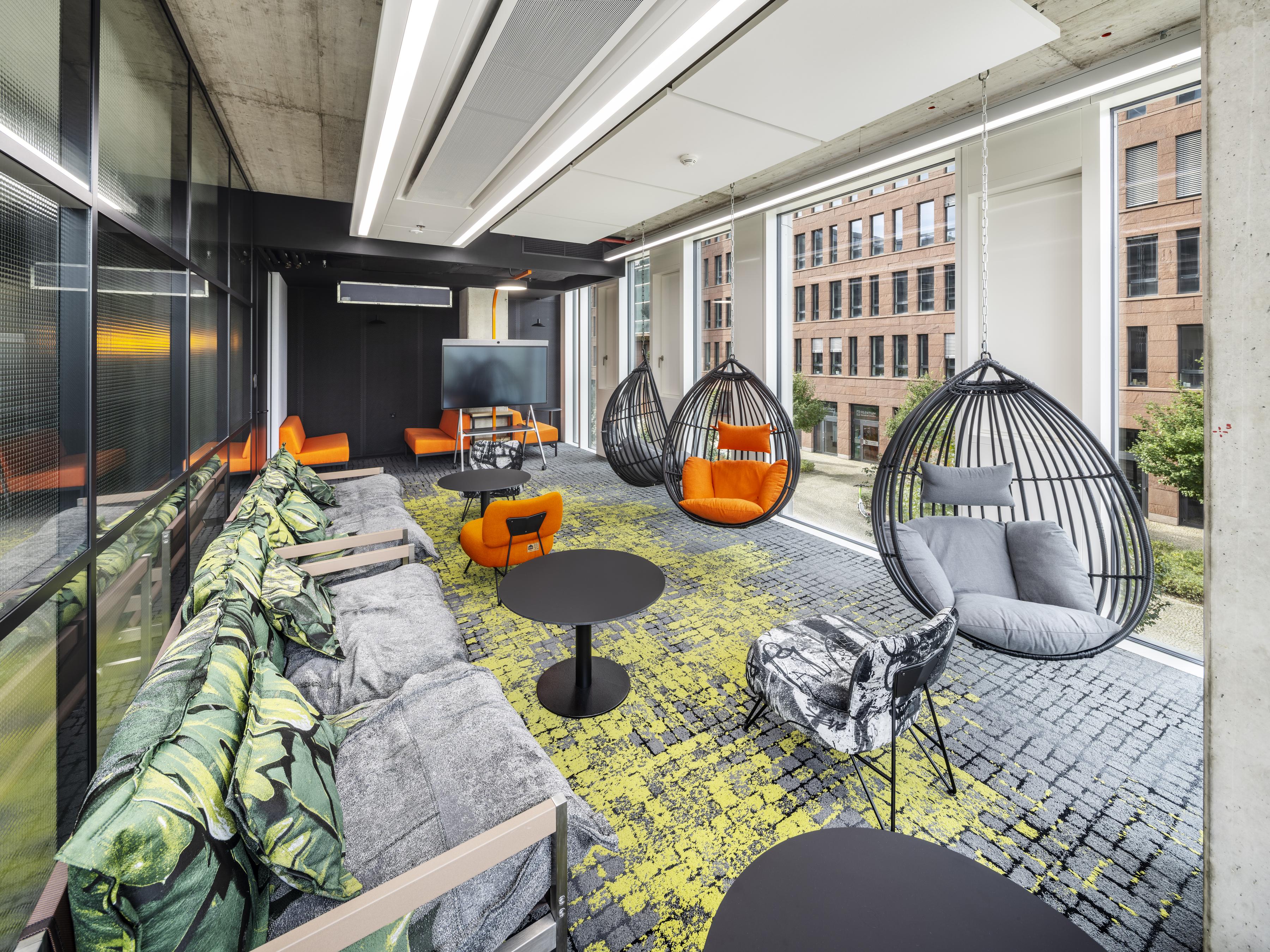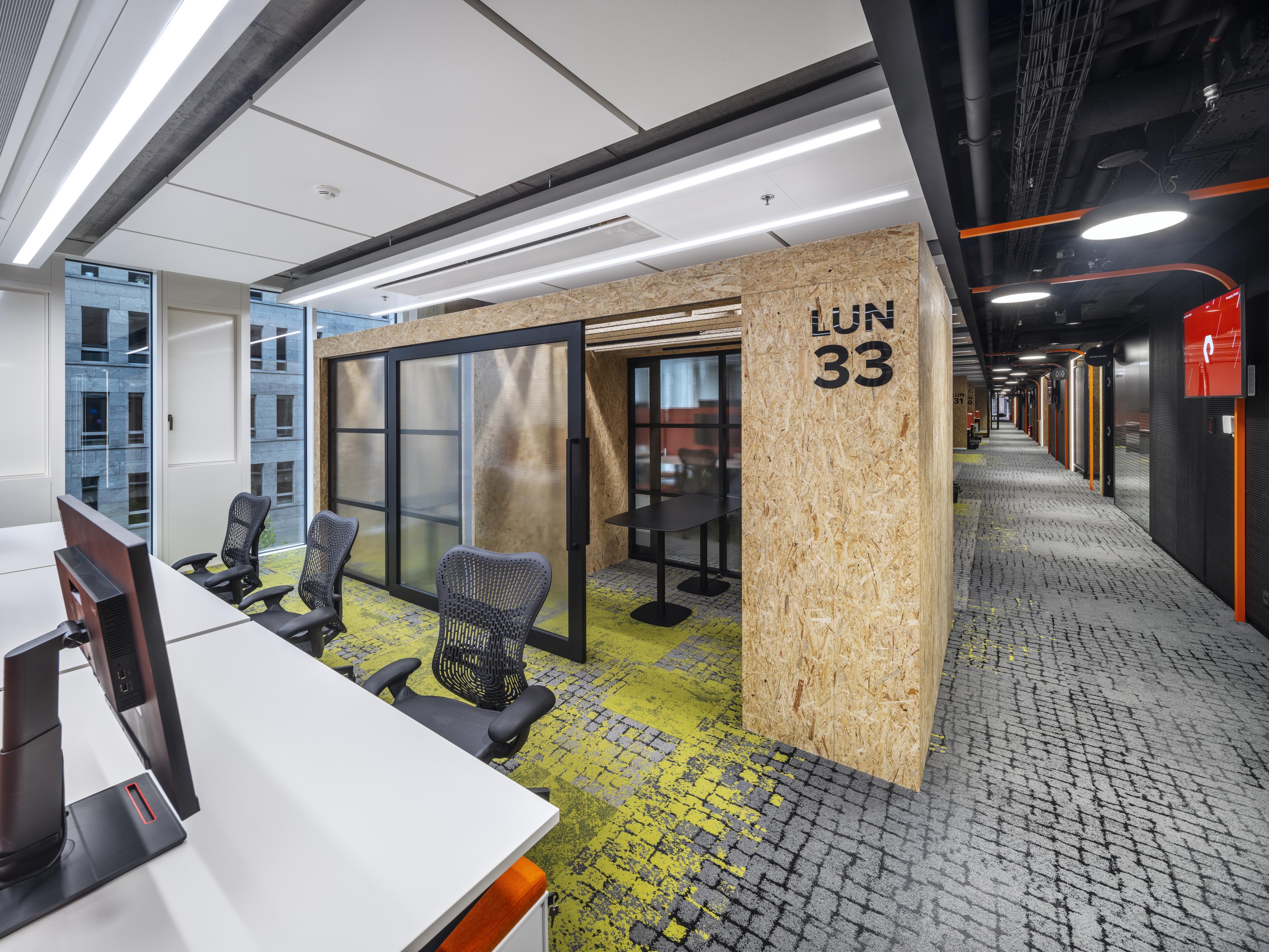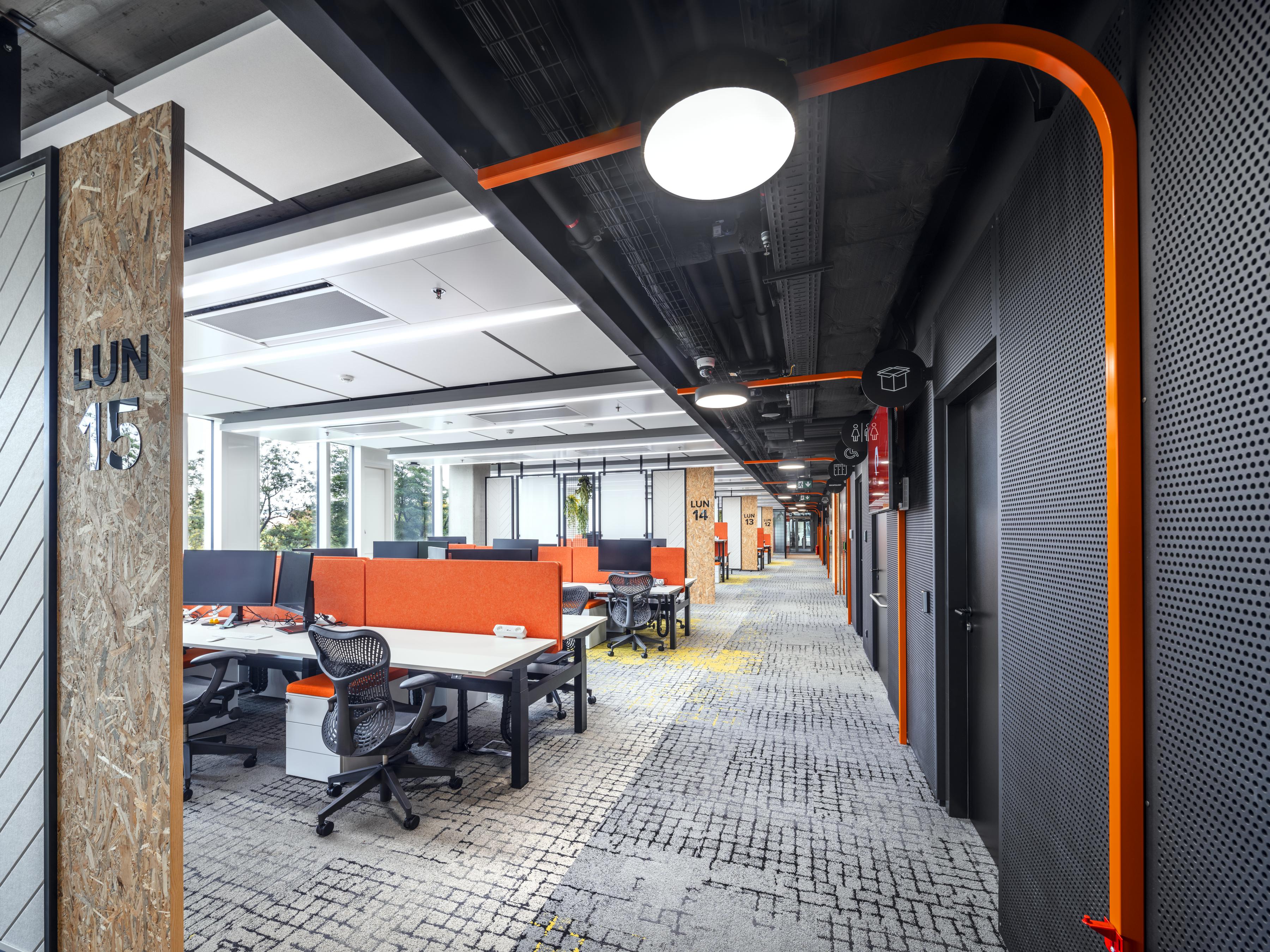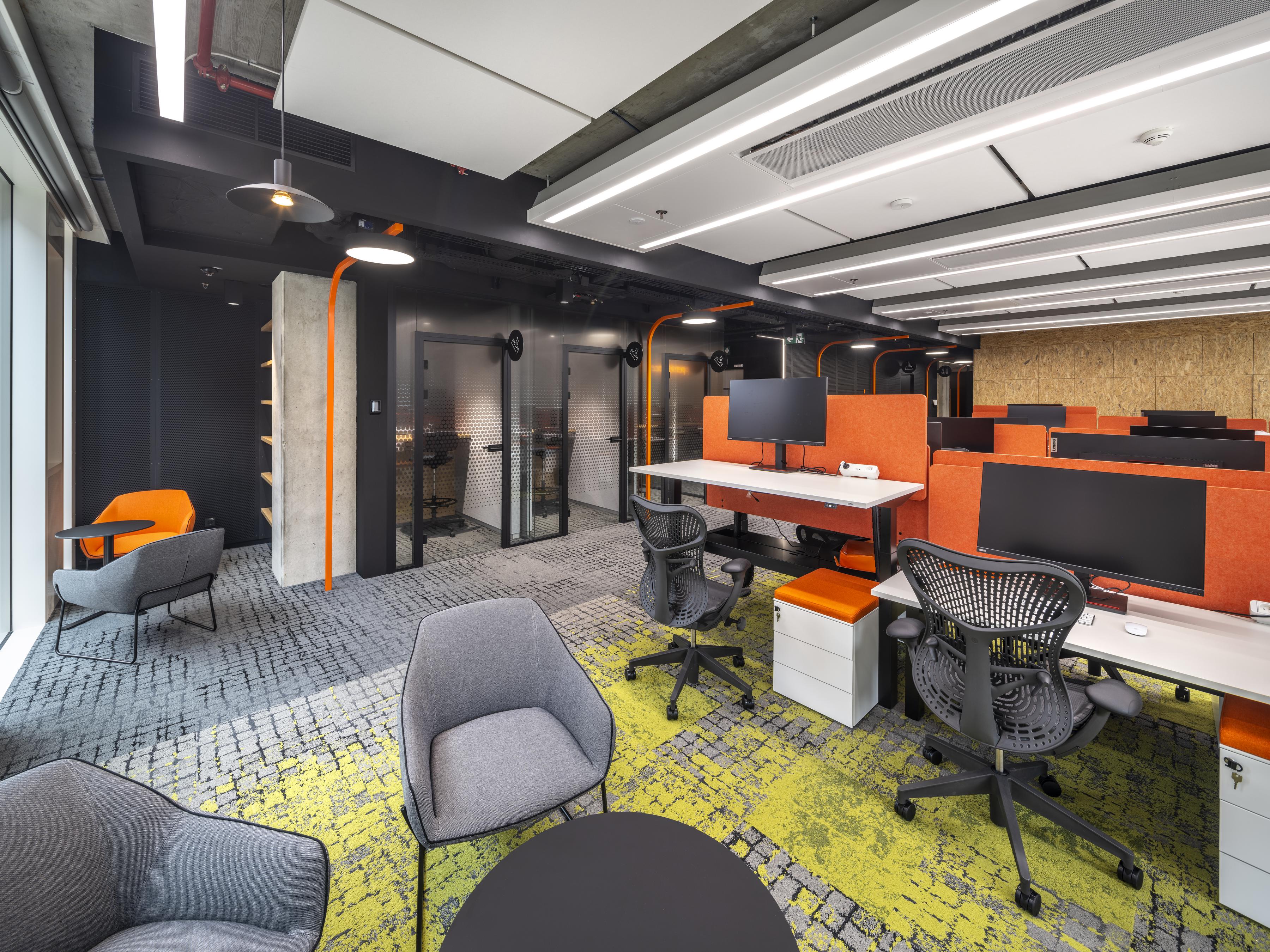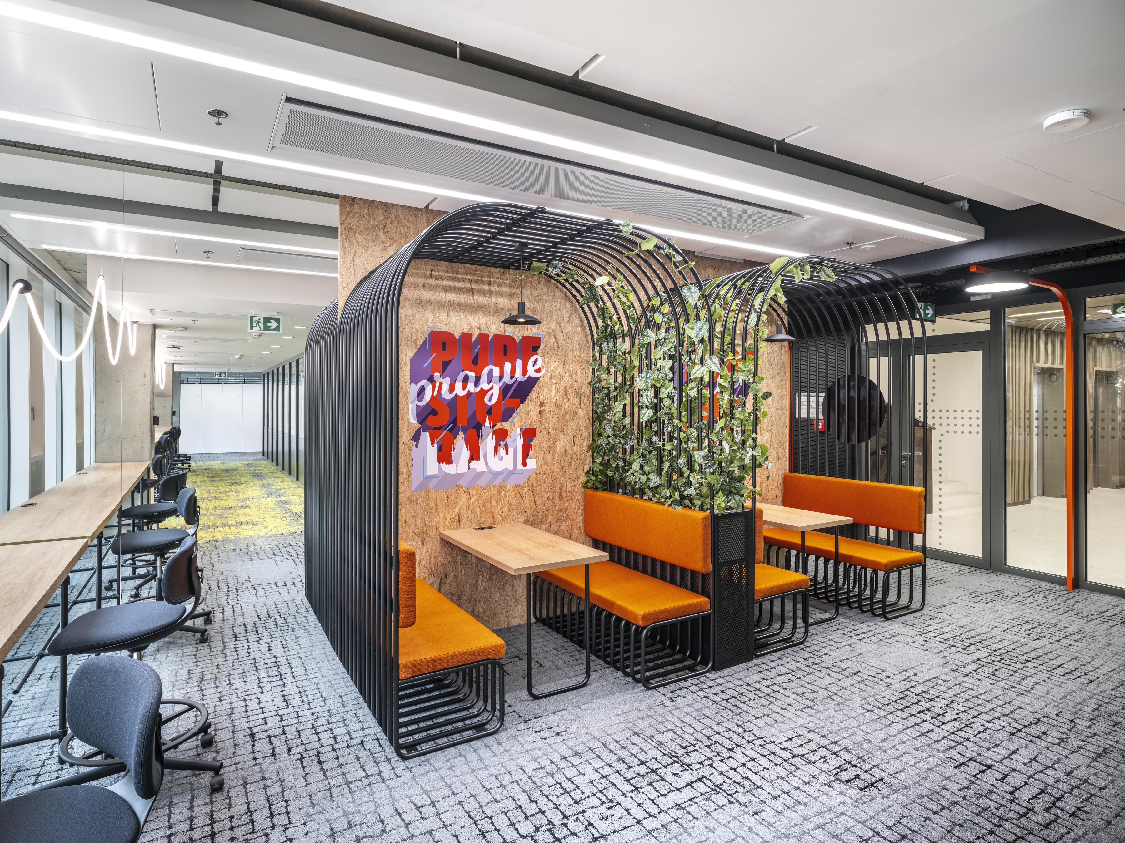 Cushman & Wakefield nutzten bei ihrer Arbeit eine visuelle Darstellung der Corporate Identity des Unternehmens. Die Verwendung von geraden Linien im gesamten Büro, einschließlich der Möbel, der Beleuchtung, des Bodenbelags und sogar des Navigationssystems, unterstreicht die technologische Idee einer Schalttafel. Die Verwendung von Orange als Akzent auf Stoffen, Möbeln und Bodenbelägen dient ebenfalls als visuelle Darstellung der Marke Pure Storage.