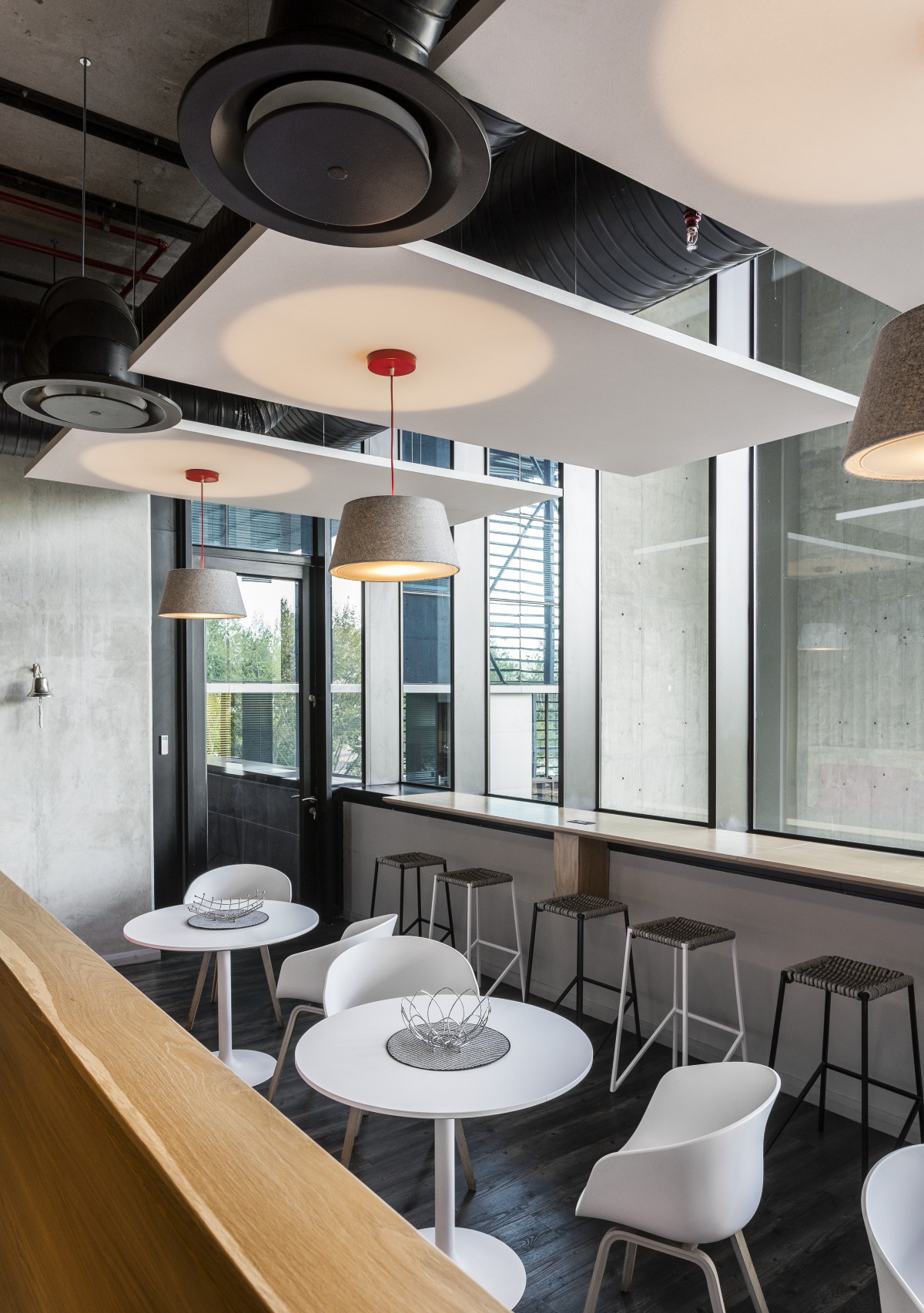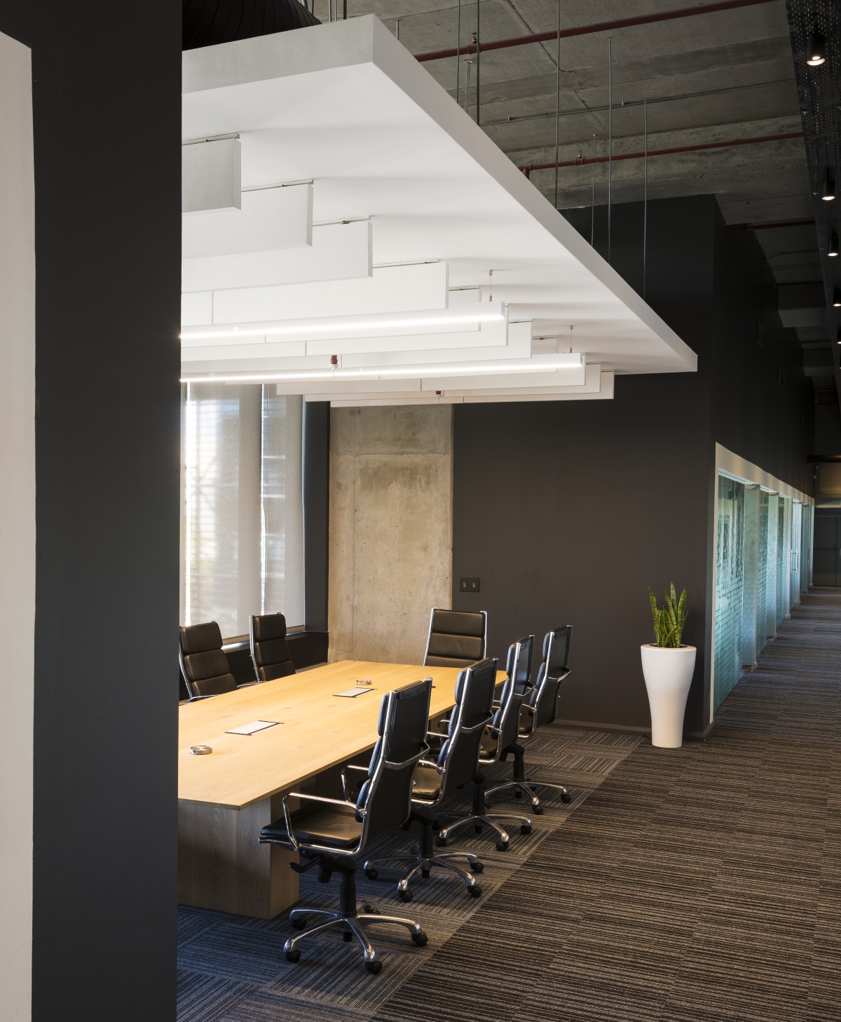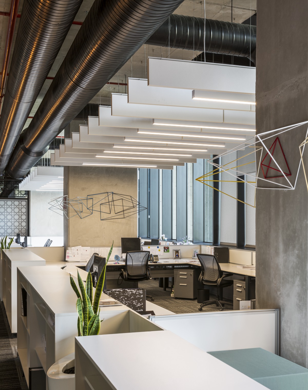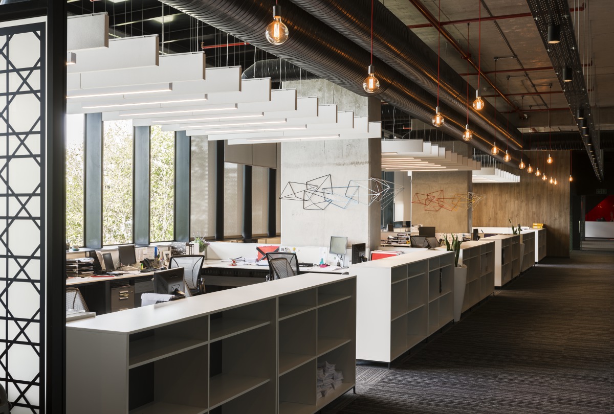 Redefine ist ein geschätzter Ansprechpartner auf dem Immobilienmarkt, der sich auf den Besitz, die Verwaltung und die Aufwertung hochwertiger Immobilien konzentriert. Das Unternehmen hatte Probleme mit der Privatsphäre zwischen den Zellenbüros, der Lärmausbreitung in Großraumarbeitsplätzen und der Lärmbelästigung aus Pausenbereichen. Um dies zu lösen, wurde die abgehängte Akustikdecke Gedina A in den mobilen Bürobereichen montiert. In den offenen Arbeitsbereichen galt es, die großzügige Atmosphäre mit exponierter Decke und natürlichem Licht zu erhalten. Aus diesem Grund wurde die freihängenden Schallabsorber Solo Rectangle in den Pausenbereichen und Solo Baffle in den offenen Arbeitsbereichen moniert.