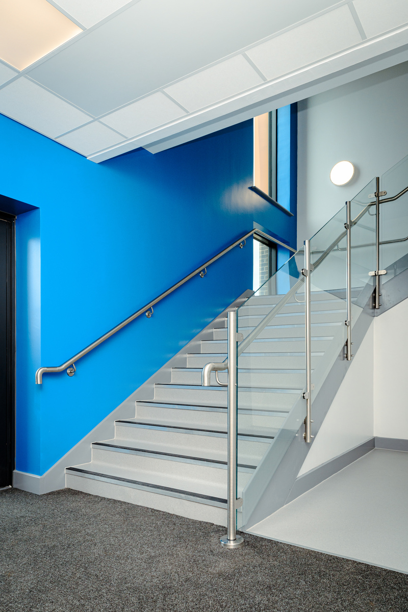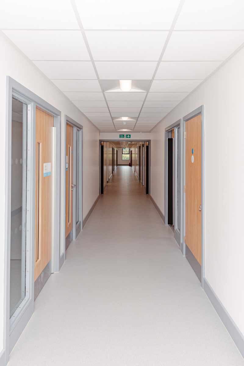 In jedem Bereich wurden maßgeschneiderte Akustiklösungen integriert, um die Schallübertragung zu kontrollieren und eine gute Akustik zu gewährleisten. In den Klassenzimmern wurden frei hängende Ecophon Solo™-Deckensegel als Alternative zu abgehängten Decken montiert. Ecophon Hygiene Performance™ A, das aufgrund seiner hervorragenden Reinigungsfähigkeit ausgewählt wurde, kam in Küchen und Bereichen zur Lebensmittelzubereitung zum Einsatz. In den für den Sportunterricht genutzten Turnhallen sorgte Ecophon Akusto™ Wall A mit Super G-Oberfläche für Stoßfestigkeit, sodass Ballsportarten weiterhin sicher ausgeübt werden können.
