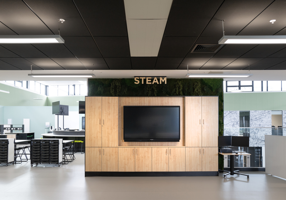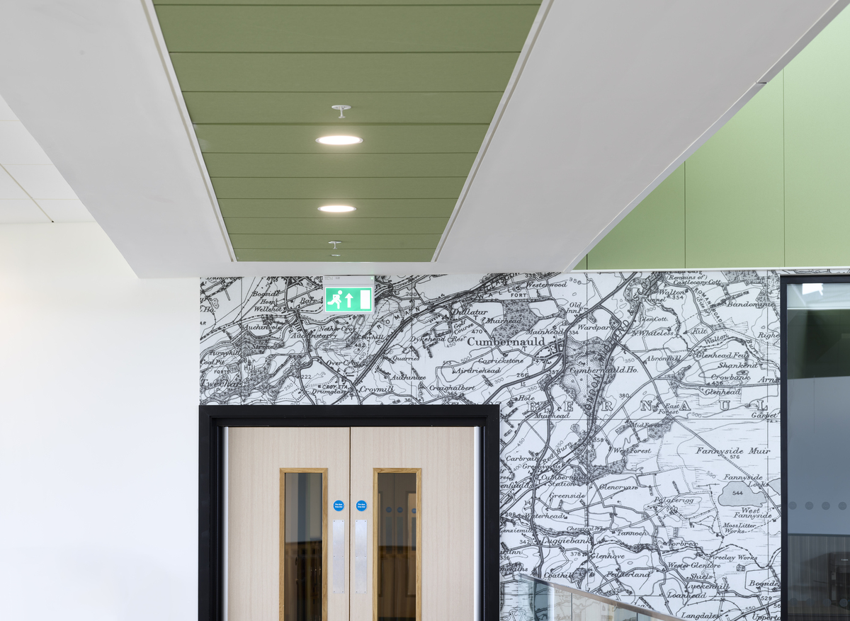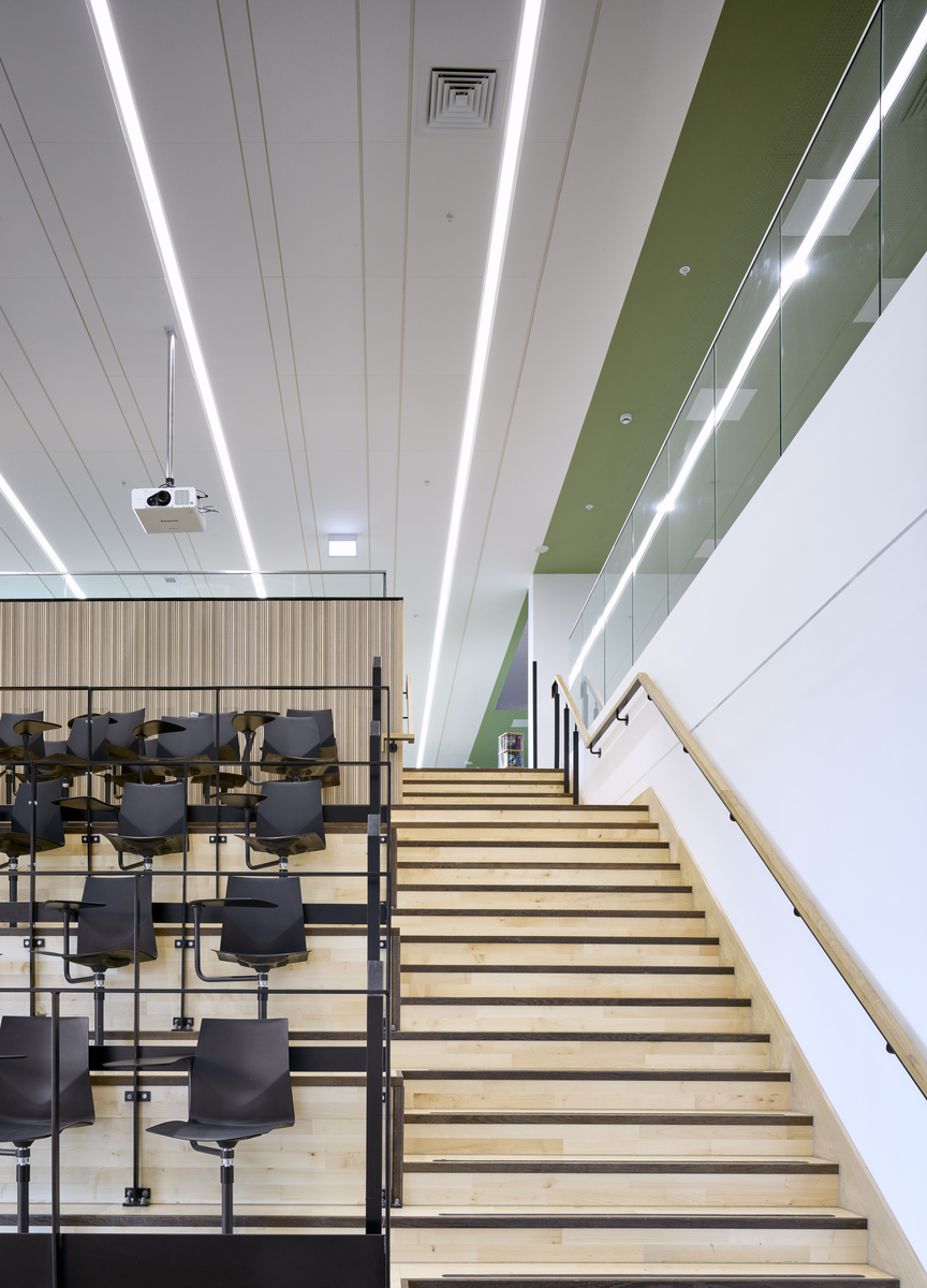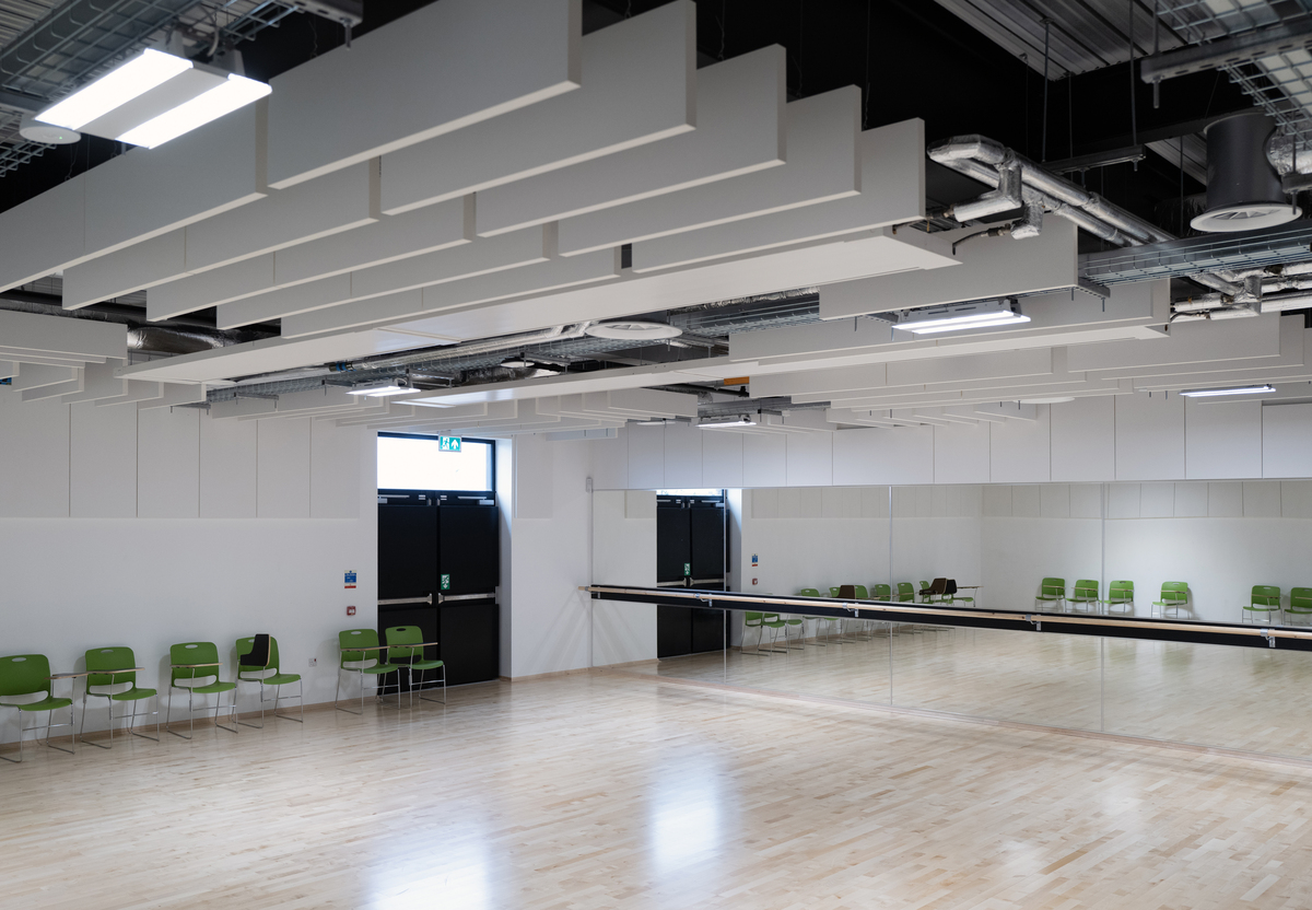Die Ecophon Produkte wurden in verschiedenen Bereichen eingesetzt, insbesondere eine große Anzahl der Wandabsorber Ecophon Akusto™ Wall C in Fresh Clover, diese wurden an allen Wänden des großen Atriums montiert. Ein weiteres herausragendes Produkt ist Ecophon Focus™ Lp, das als Alternative zu Holzwolleplatten und traditionellen Rasterdecken ausgewählt wurde. Die Verwendung von Ecophon Combision™ dB42 in Dark Diamond sorgte für ein hohes Maß an Schalldämmung zusätzlich zur Absorptionsklasse A im Theater.