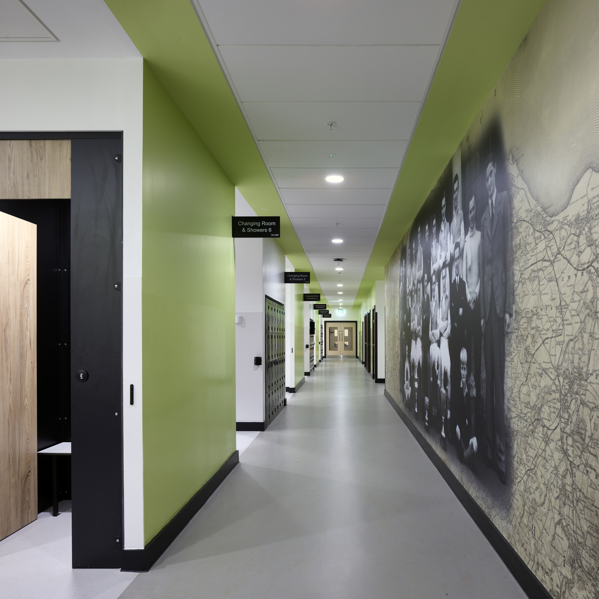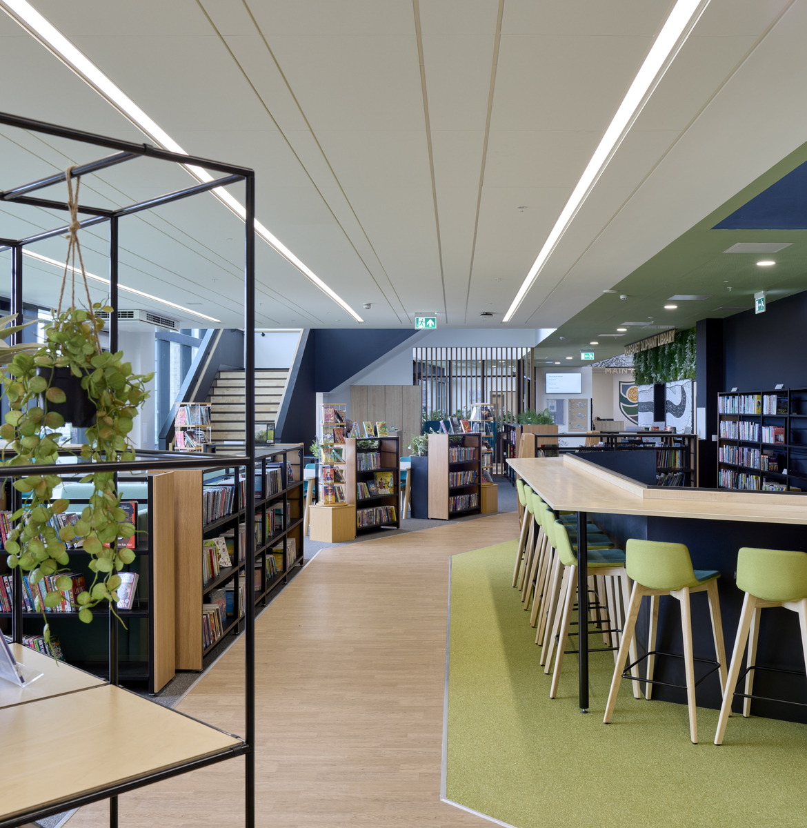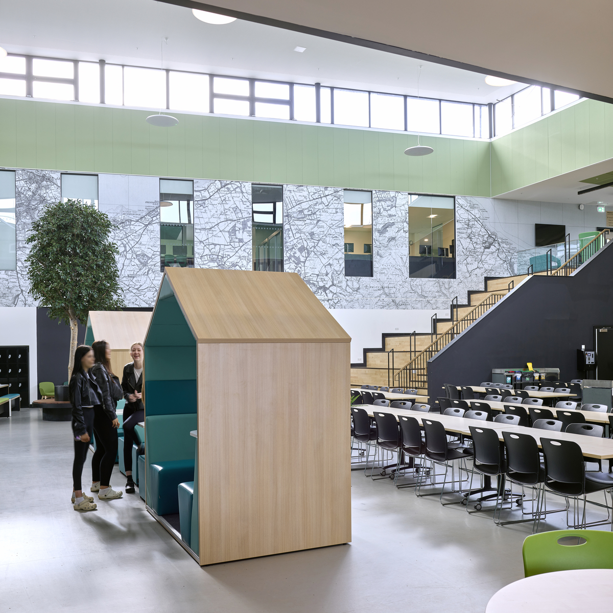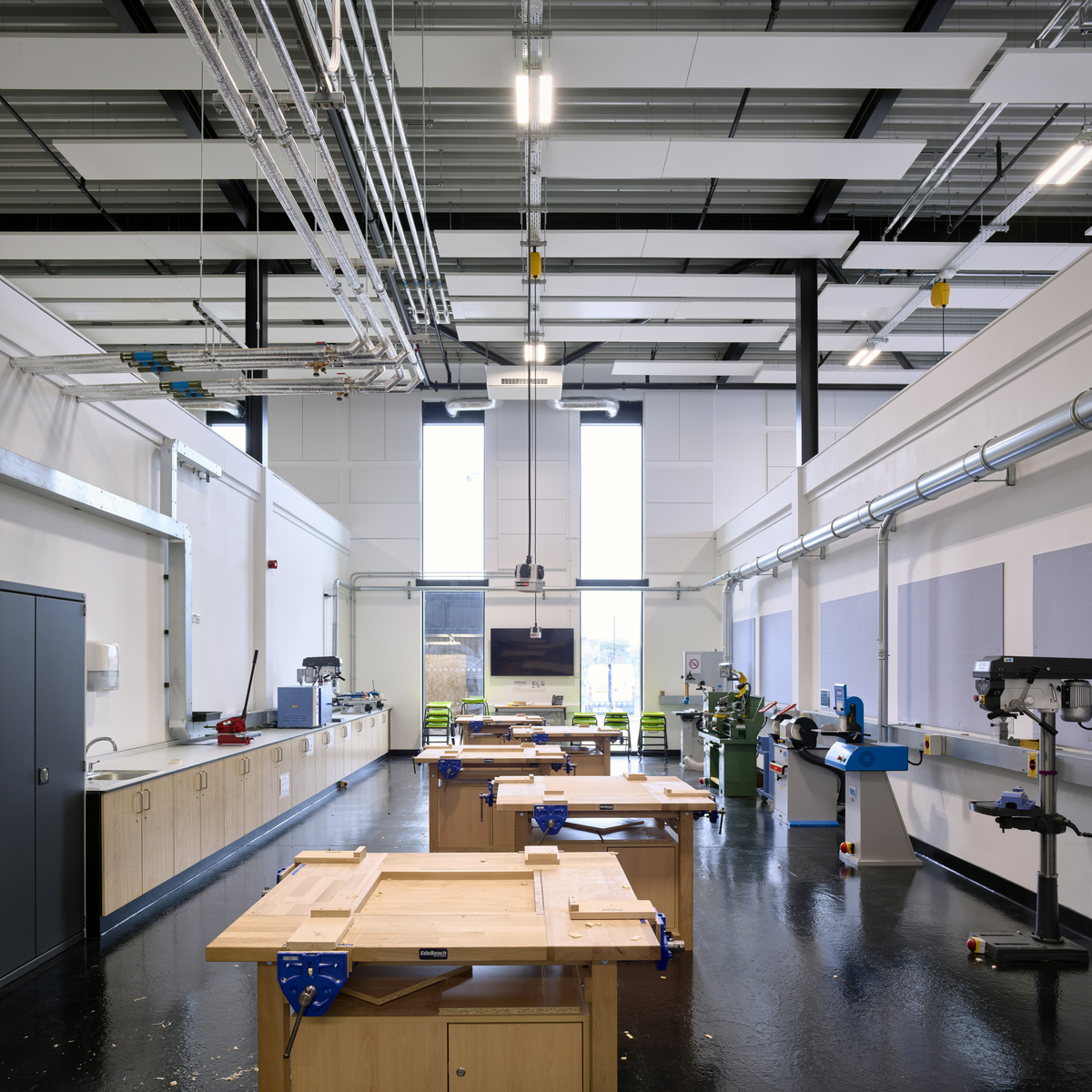 Die Ecophon Produkte wurden in verschiedenen Bereichen eingesetzt, insbesondere eine große Anzahl der Wandabsorber Ecophon Akusto™ Wall C in Fresh Clover, diese wurden an allen Wänden des großen Atriums montiert. Ein weiteres herausragendes Produkt ist Ecophon Focus™ Lp, das als Alternative zu Holzwolleplatten und traditionellen Rasterdecken ausgewählt wurde. Die Verwendung von Ecophon Combision™ dB42 in Dark Diamond sorgte für ein hohes Maß an Schalldämmung zusätzlich zur Absorptionsklasse A im Theater.