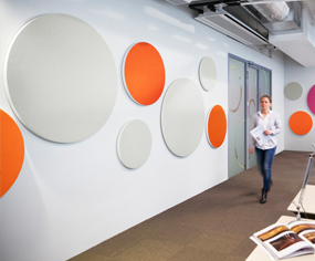 Ecophon Akusto One bietet nicht nur herausragende schallabsorbierende Eigenschaften, sondern beeindruckt auch durch ästhetische Vielfalt. Ob quadratisch, rechteckig oder rund, die rahmenlosen Wandabsorber bieten dank verschiedener Forrmen, Formate und Farben viele Gestaltungsmöglichkeiten. Die einfache und schnelle Montage macht Akusto One besonders anwenderfreundlich.