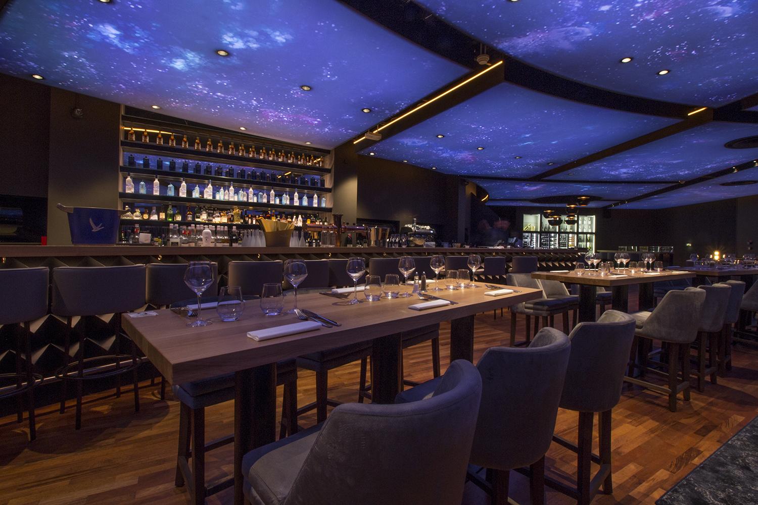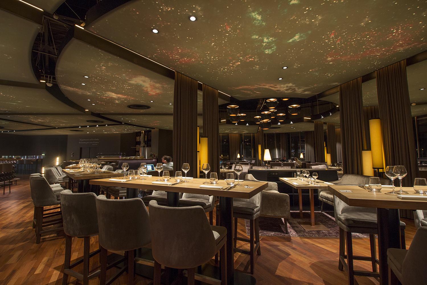 Like a circular orbit, the huge fabric covered frames, of which the largest measures 50 m2 in one single piece, decorate the ceiling with a pattern in the image of the universe, the cosmos... A celestial vault realised in digital printing and backlit by rails of RGB LEDs placed behind the protective fabric. The fabric comes to life, changing colour and brightness according to the time of day but also to a playlist developed by Hervé Porte, each track being associated with a color that permanently modulates the atmosphere.