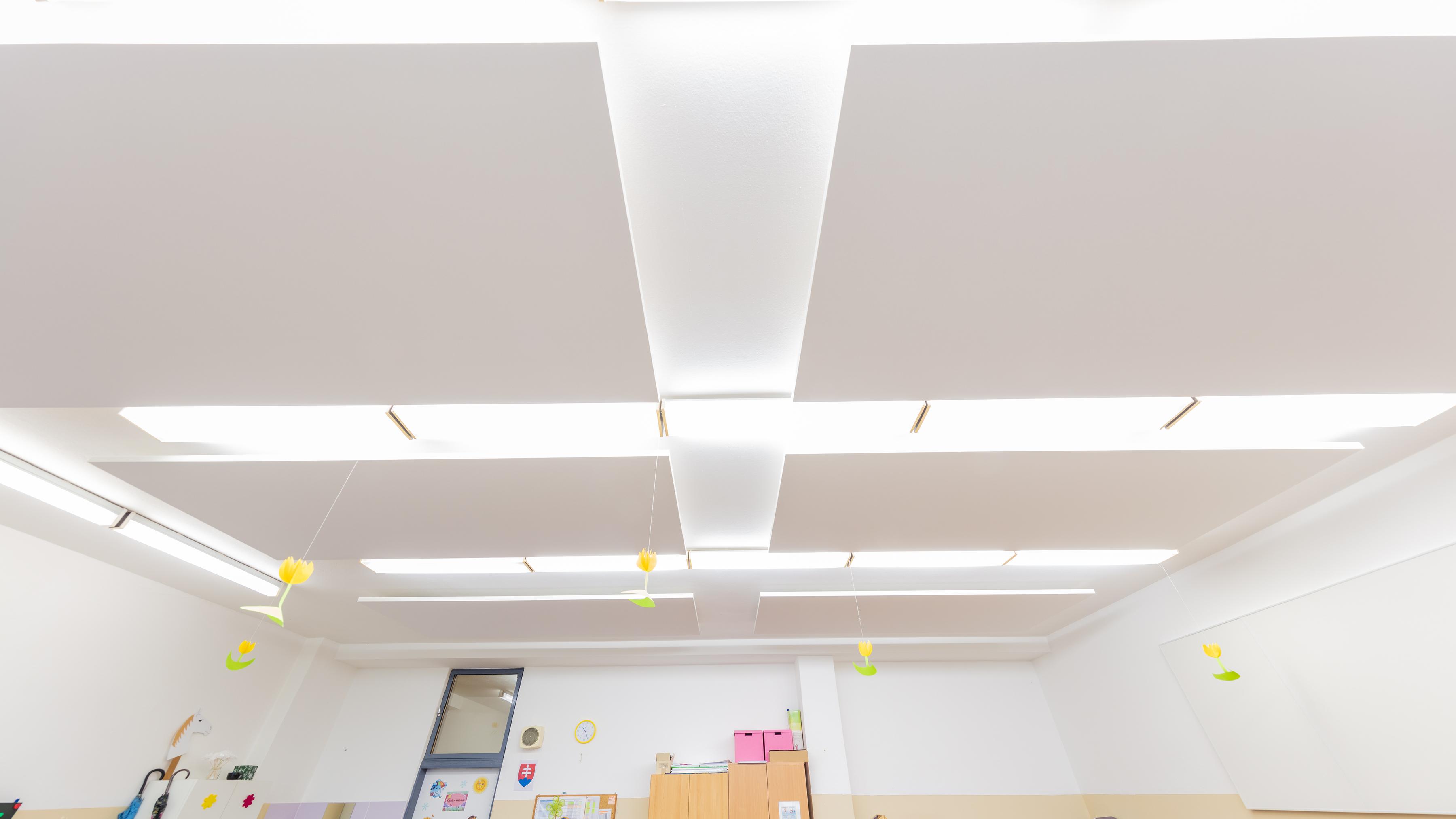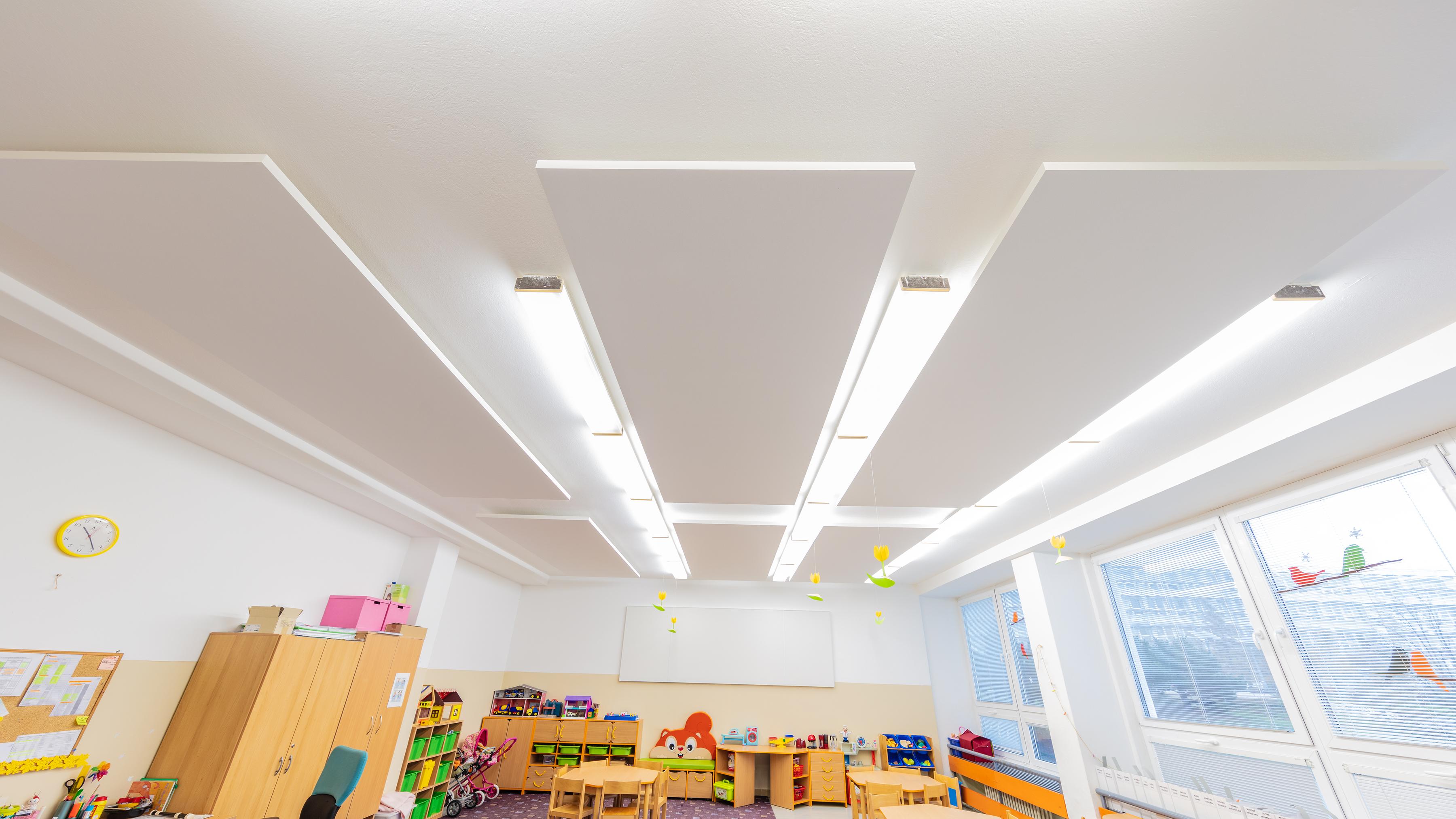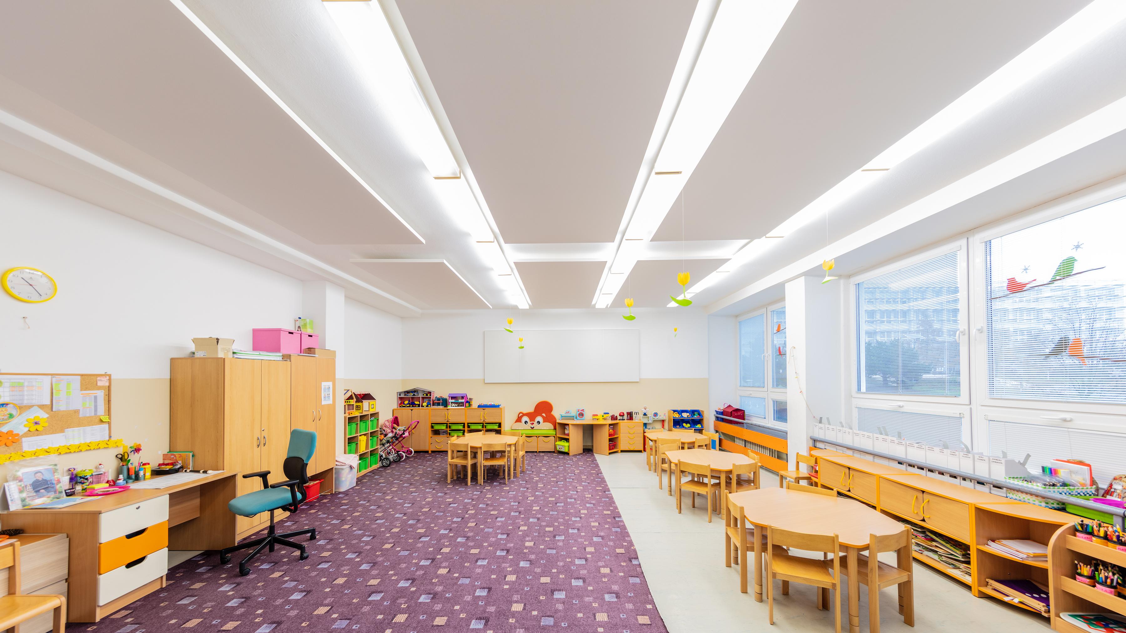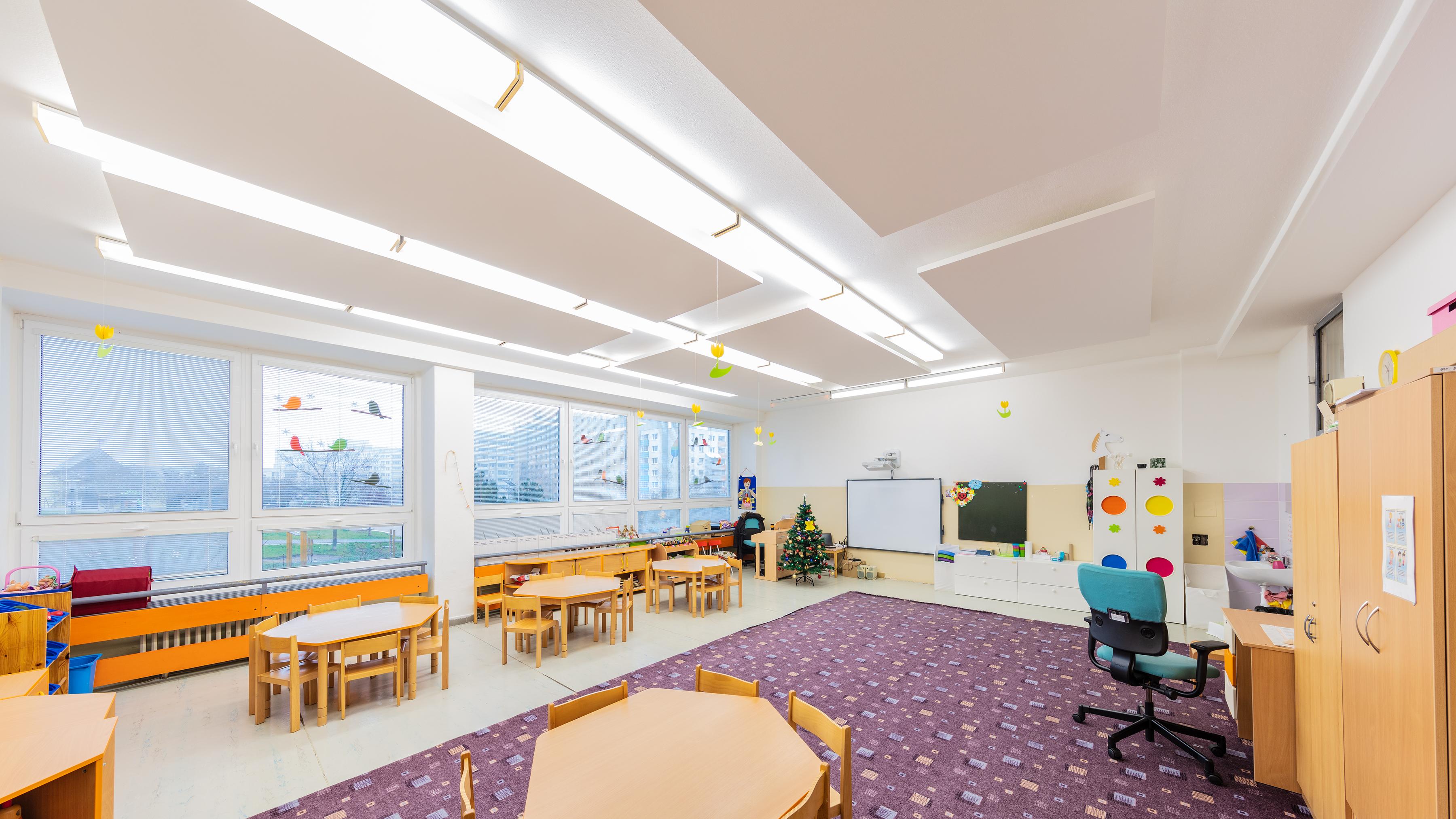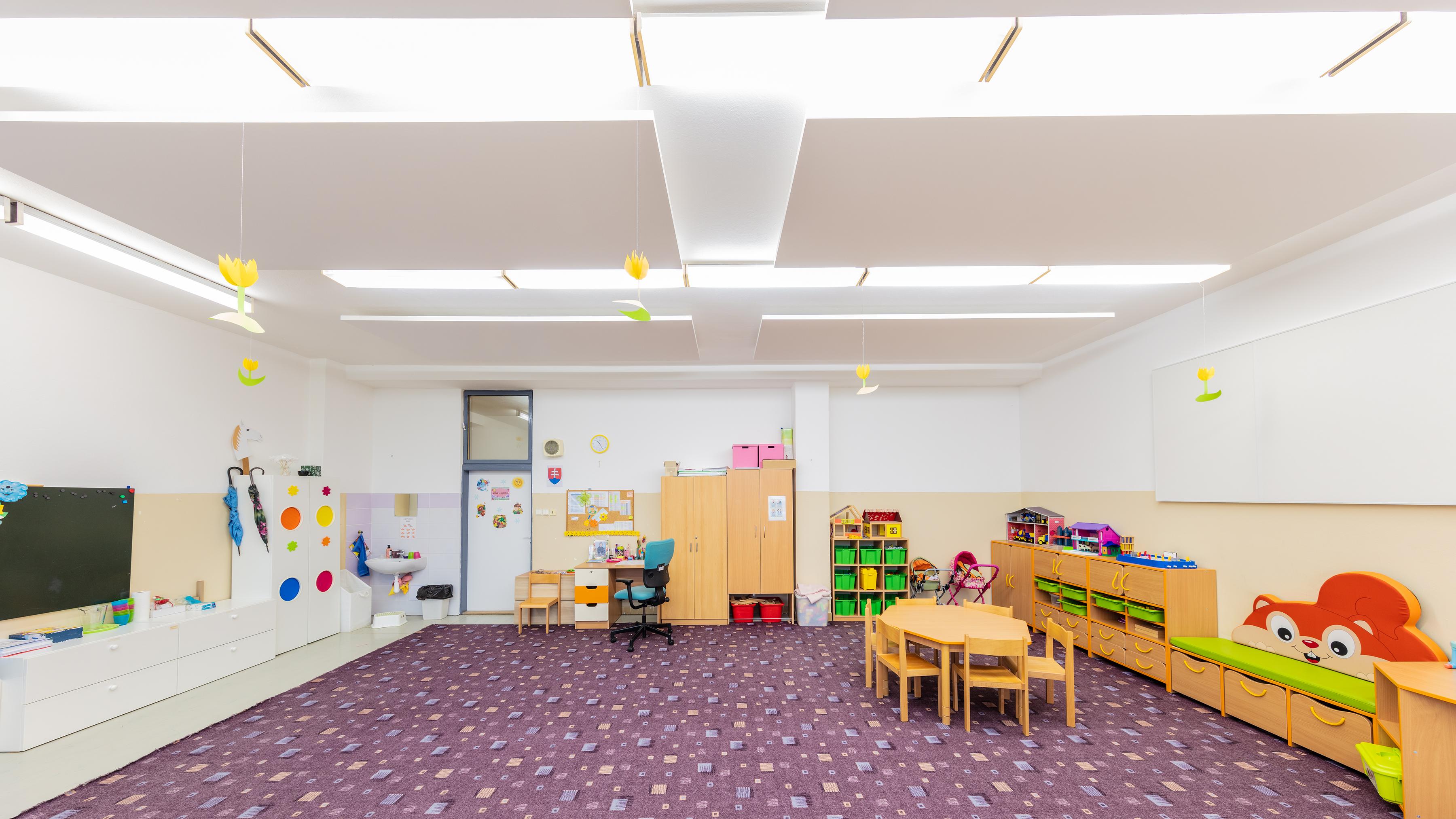 Such measures were able, for example, to cut the reverberation time in half in a kindergarten in Karlová Ves and also improve the intelligibility of speech. Free-hanging Ecophon Solo™ Rectangle panels were used for the ceiling and Ecophon Akusto™ Wall C absorption class A panels were used on the walls.