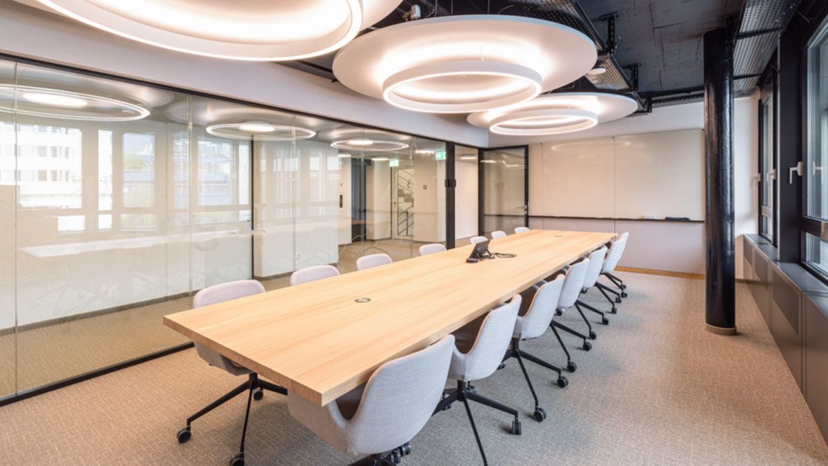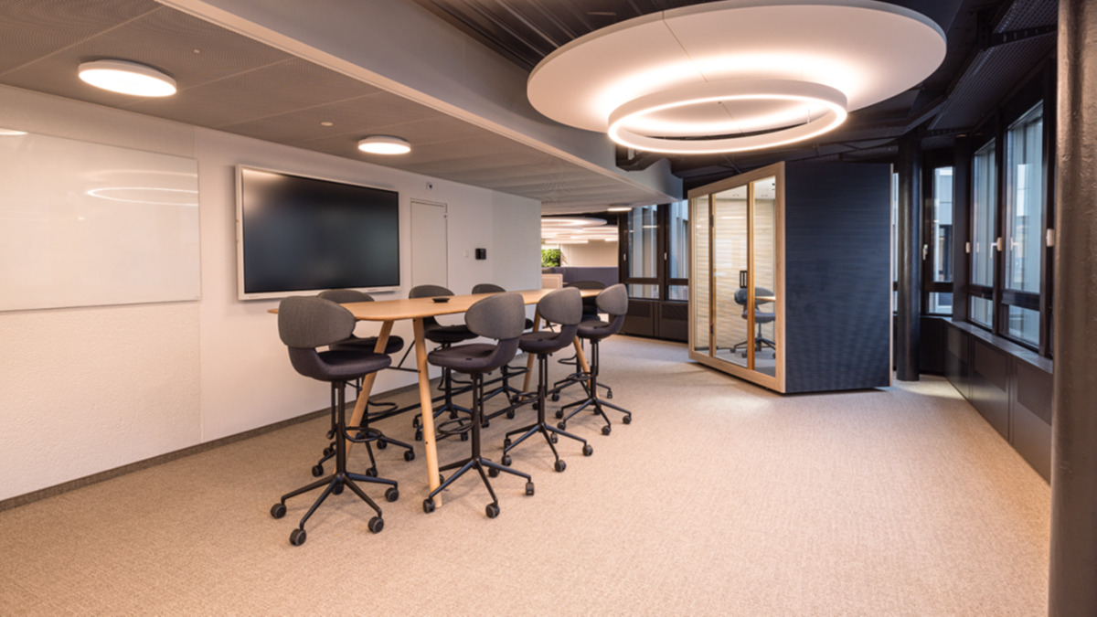 This is why Ecophon Solo™ Circle XL ceiling panels were chosen. In addition to their excellent acoustic properties, which have a positive effect on the workplace atmosphere for employees, the free-hanging ceiling panels also create a visual highlight in the room. In combination with the ring lights, the design really comes into its own. The ceiling panels are Ecobau certified and can be recycled via the SoundCircularity™ recycling service. The glass wool products manufactured in the Scandinavian countries have also been awarded the Cradle to Cradle Certified® Bronze label.
