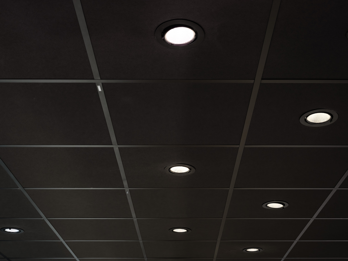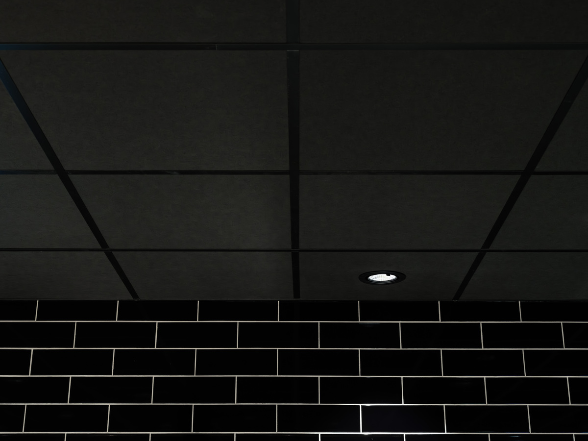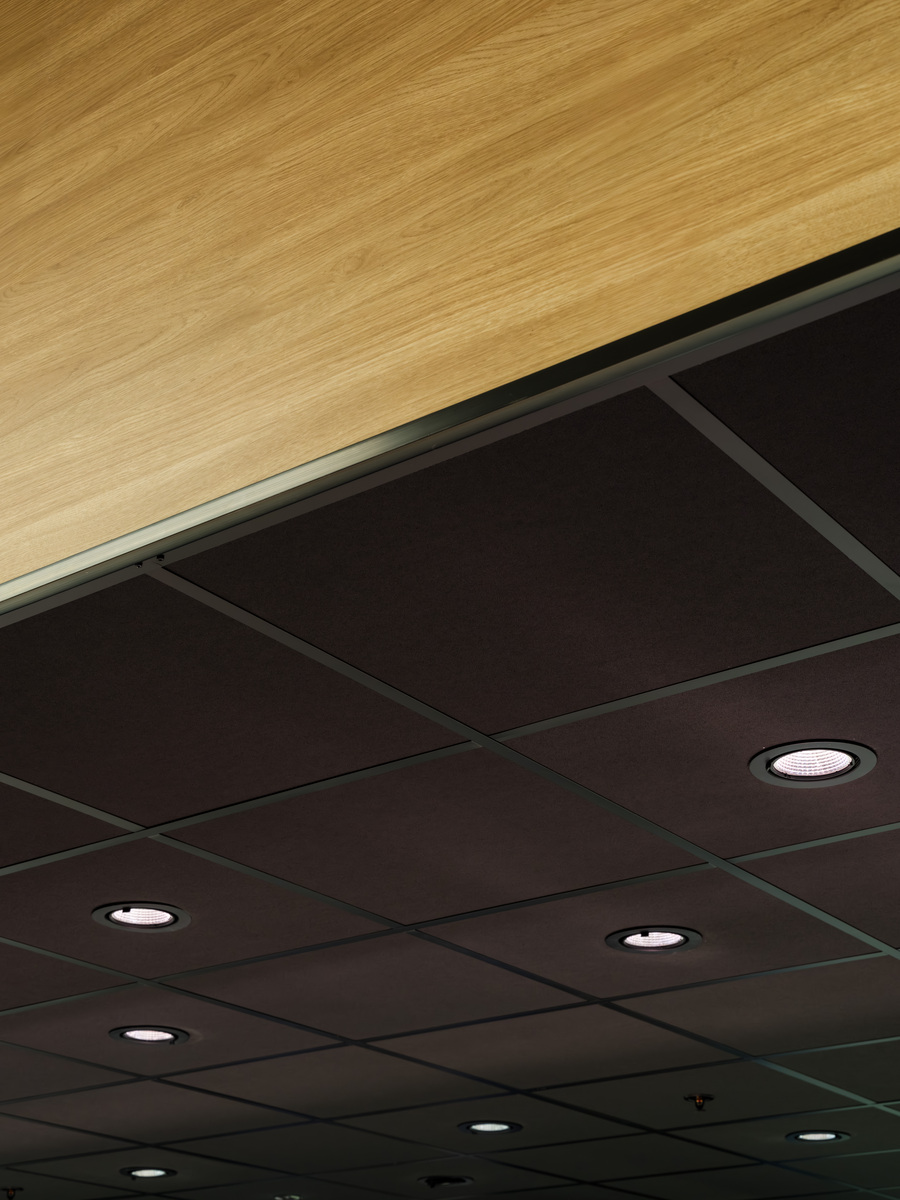 Ecophon Hygiene™ Black was installed above the service counter, delivering a ceiling solution that combines outstanding sound absorption with stringent hygiene standards and a sophisticated matte black finish. Easy to clean and moisture-resistant, it is ideal for demanding retail environments where both acoustics and cleanliness are essential.