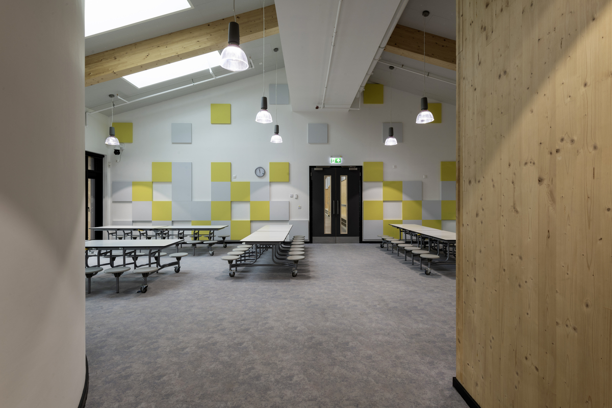 “The exposed nature of the timber structure brings natural materiality into the building which has been balanced by a well-considered acoustic design to ensure an optimum teaching environment. Focus Levels tiles were installed on the pitched roof soffit and on the walls to provide both decorative and effective sound absorption allowing the hard CLT walls to be exposed internally. Sound design with effective acoustic treatment was critical in exposing and celebrating the natural CLT & Glulam frame, bringing nature into the internal learning spaces.”