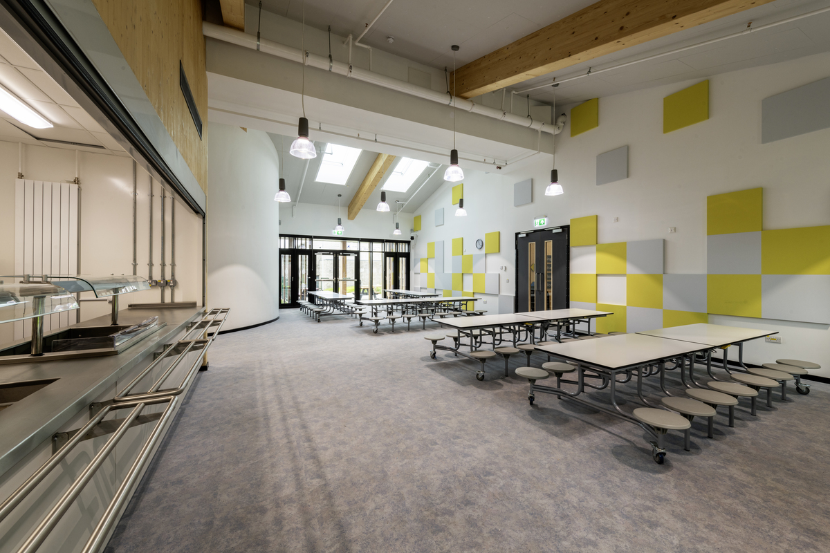 Focus Levels not only helped to maintain the design features in the ceiling but also created a focal point in classrooms and dining halls with a range of Ecophon colours. Kirkliston features several Ecophon solutions across the space, including corridors and toilets where Ecophon Focus™ E XL and Ecophon Hygiene Performance™ A are installed, alongside Gedina E in reception and staff rooms ensuring any ambient noise from communal areas does not interfere with the calming environment essential for learning and staff wellbeing.