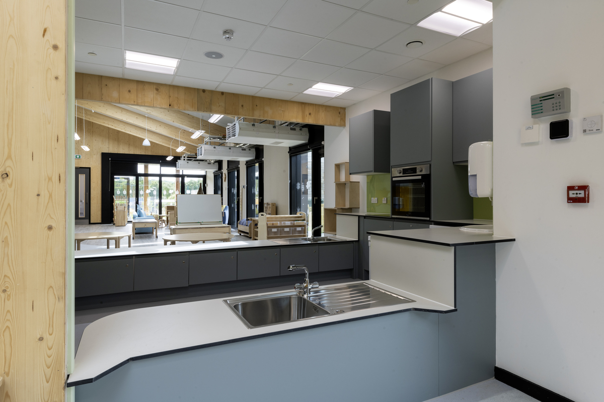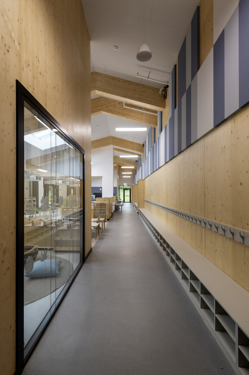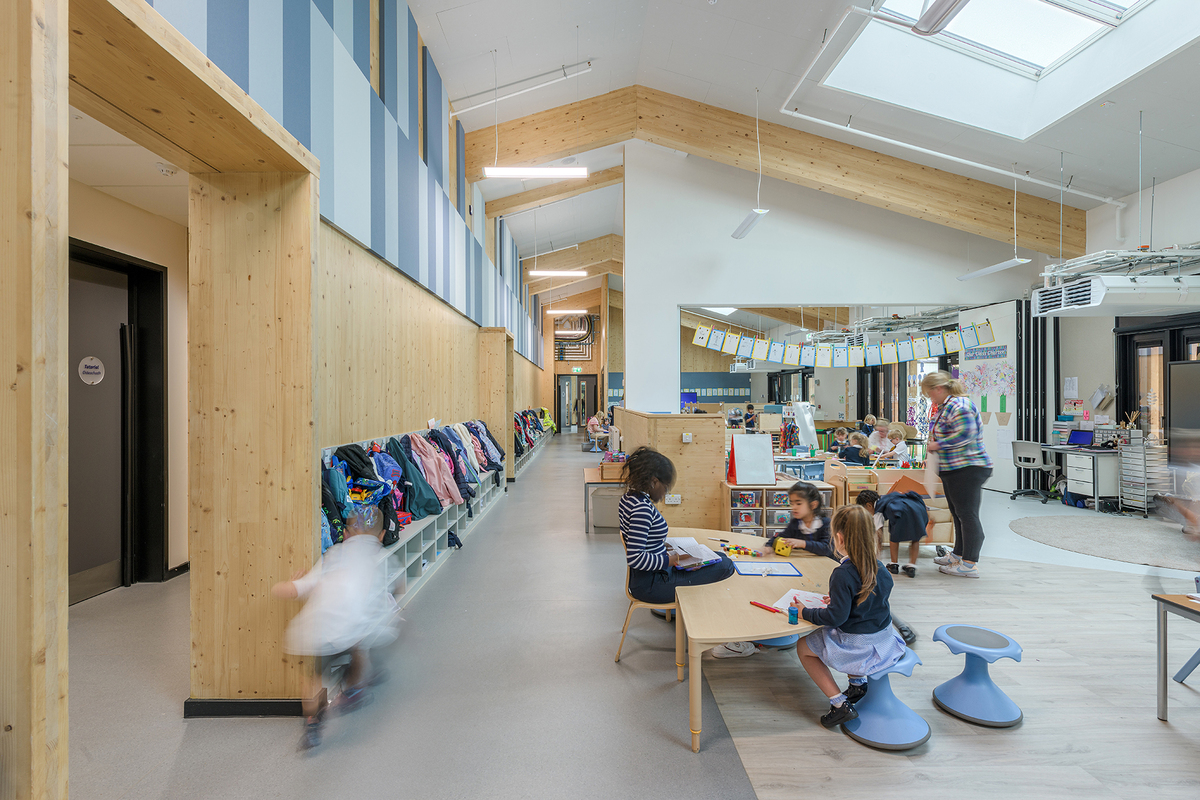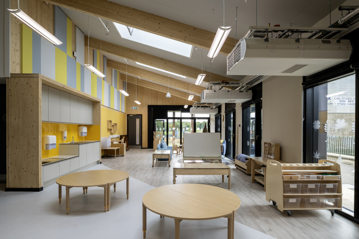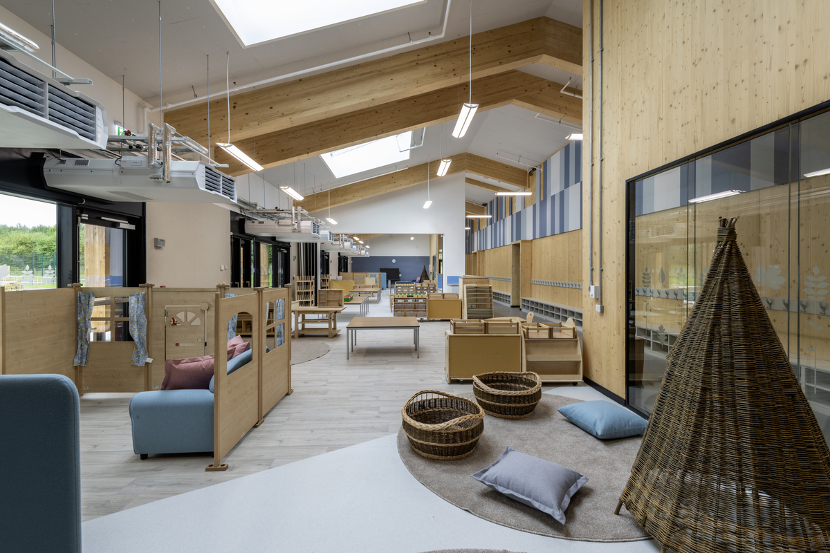 The annex, which connects two 50/50 nurseries and four Primary 1 classrooms via shared open spaces and a central dining area, is designed to foster outdoor and play-based learning. Sustainability was a key requirement with the building being built to PassivHaus principles and constructed in Cross Laminated Timber (CLT) to limit embodied carbon, the use of a glulam frame and CLT minimises energy demand and maximises natural light.