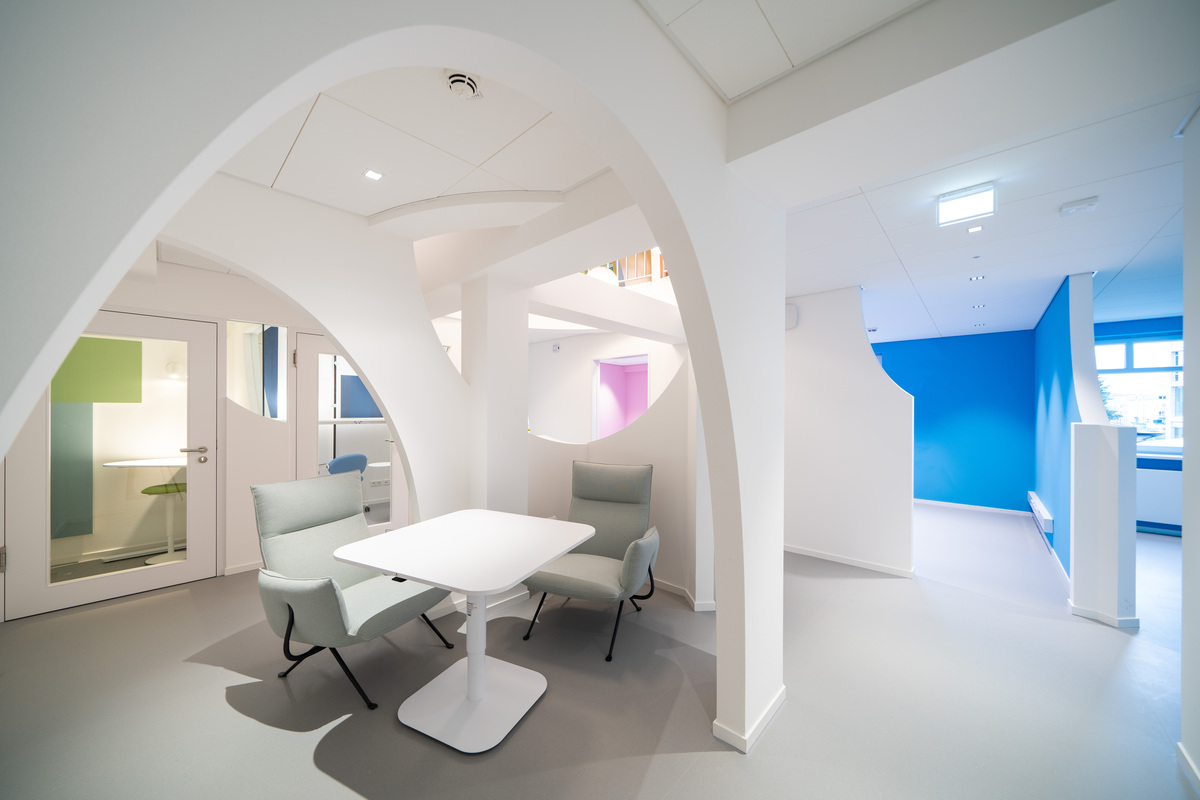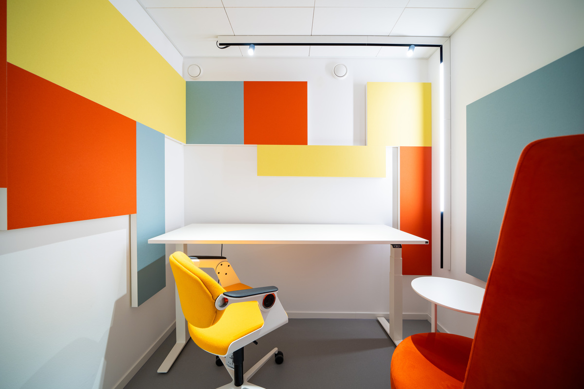 From the outset, acoustic planning was integral alongside colour and material choices. Ecophon Akusto™ One wall absorbers were used to reduce flutter echoes and add visual interest. These panels reflect the colour scheme and harmonise with the interior design, delivering both acoustic comfort and aesthetic coherence.