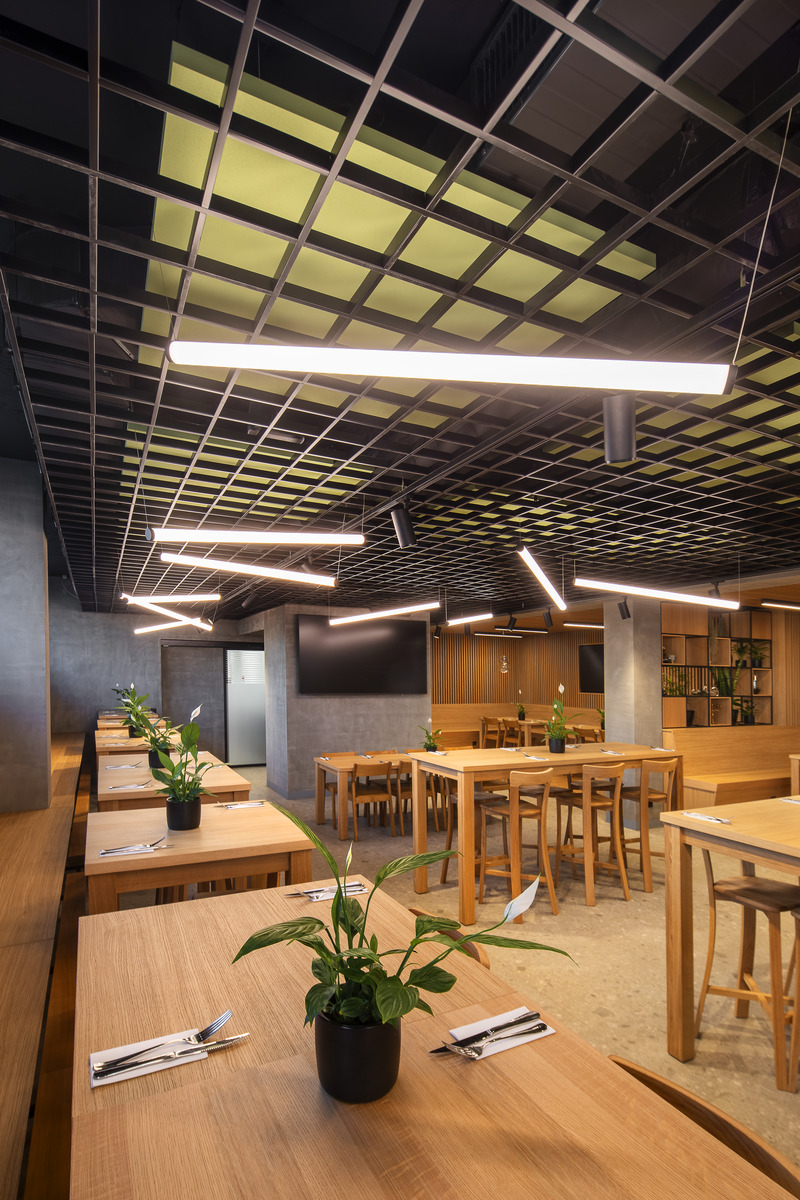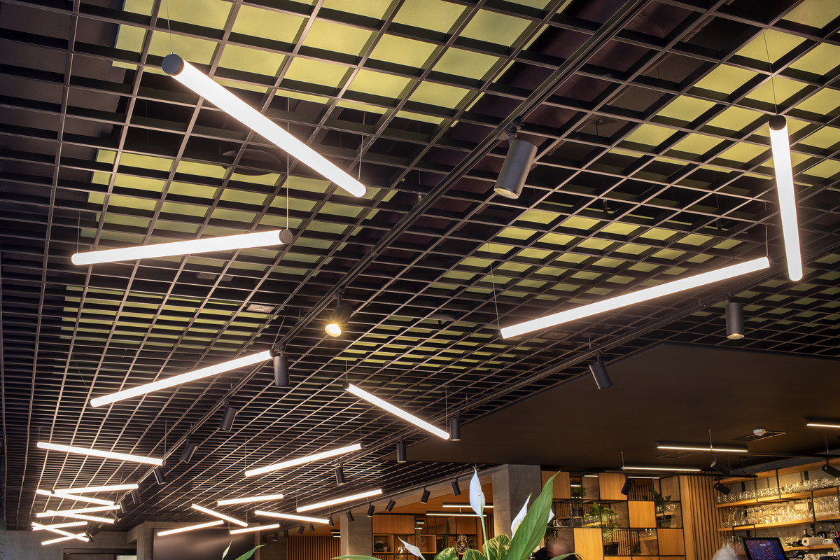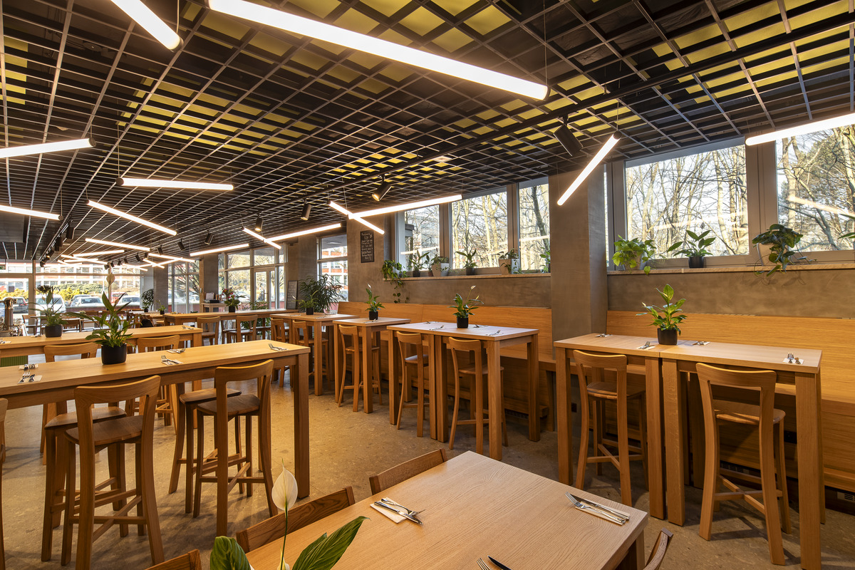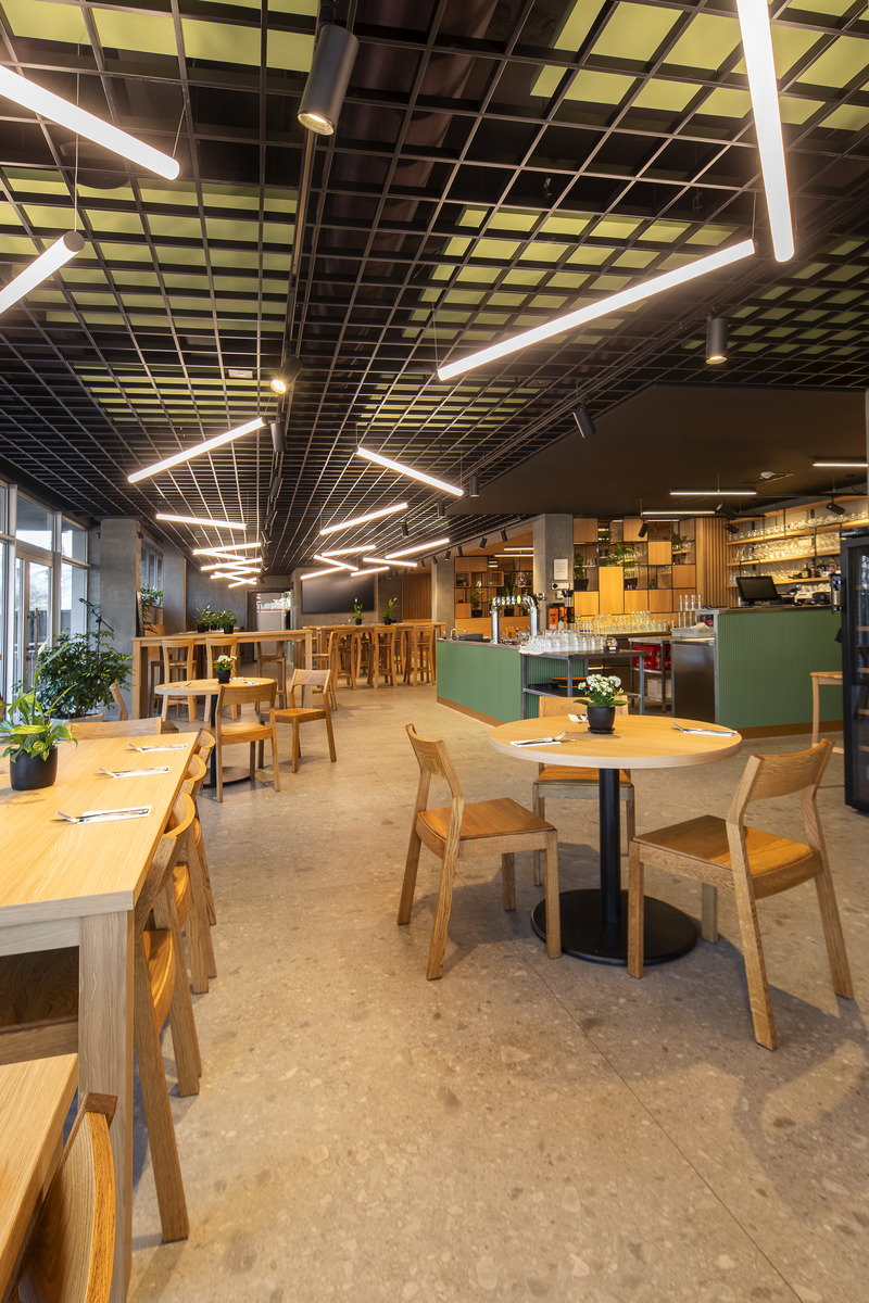 That’s why the acoustics in the restaurant at the campus of the Czech University of Life Sciences have been carefully considered. The space is designed to foster a calm and pleasant ambiance. A key element is the Ecophon Solo™ Square acoustic panels in the Fresh Clover shade, discreetly placed behind a black decorative grid. This ensures they do not interfere with the rustic interior design while effectively absorbing unwanted noise, allowing guests to enjoy conversations and fully immerse themselves in the dining experience.