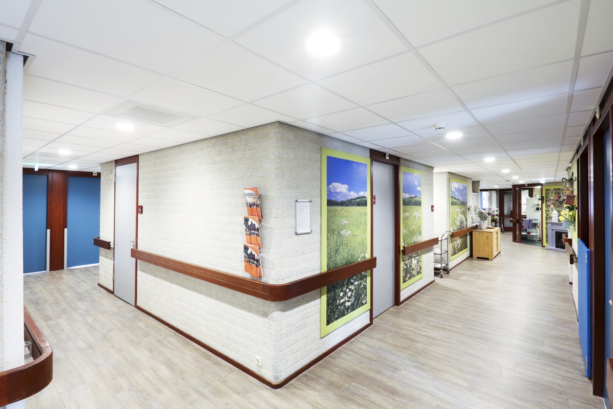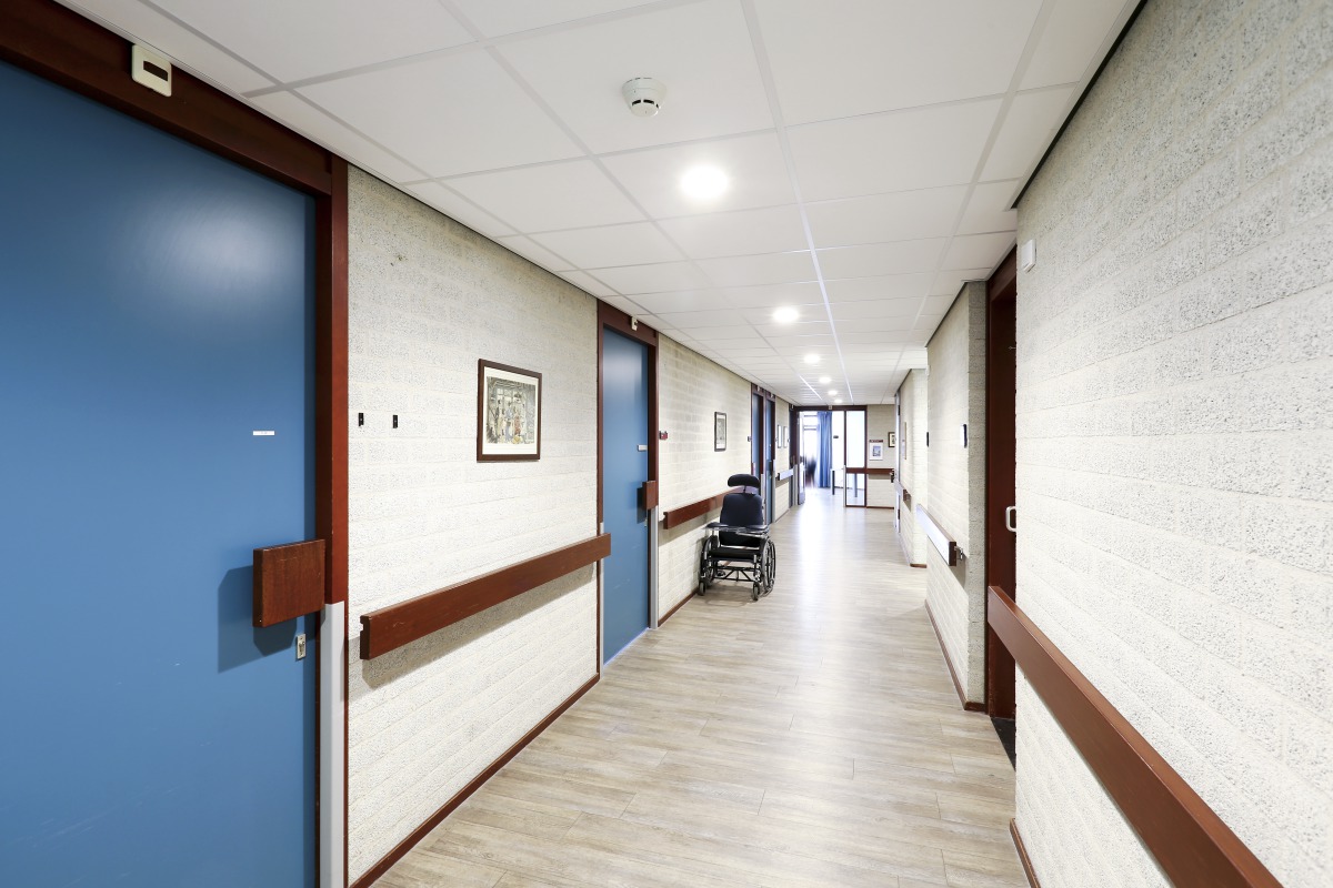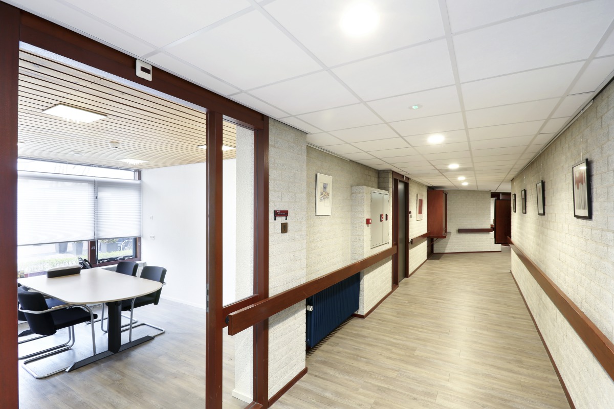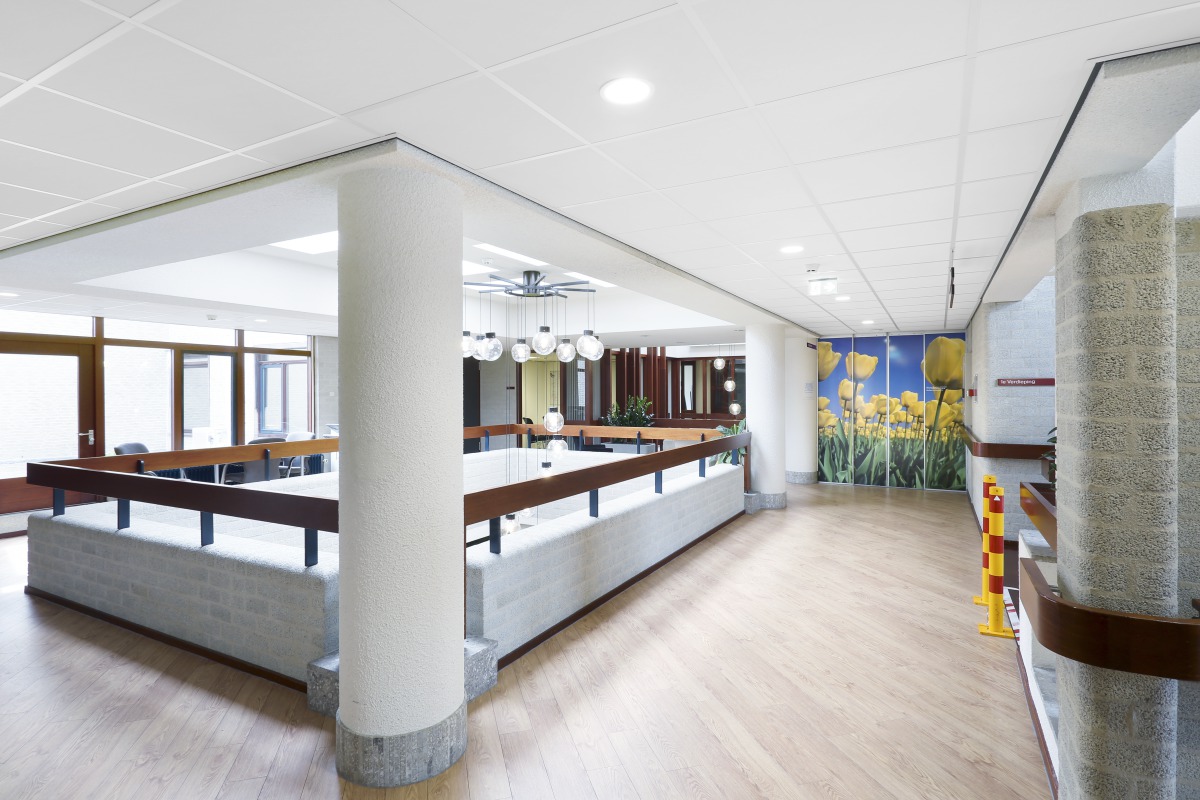 At PW Janssen nursing home and rehabilitation centre the old scrap ceiling in the corridors and breakout spaces was replaced by a new bright acoustic ceiling Advantage A.
