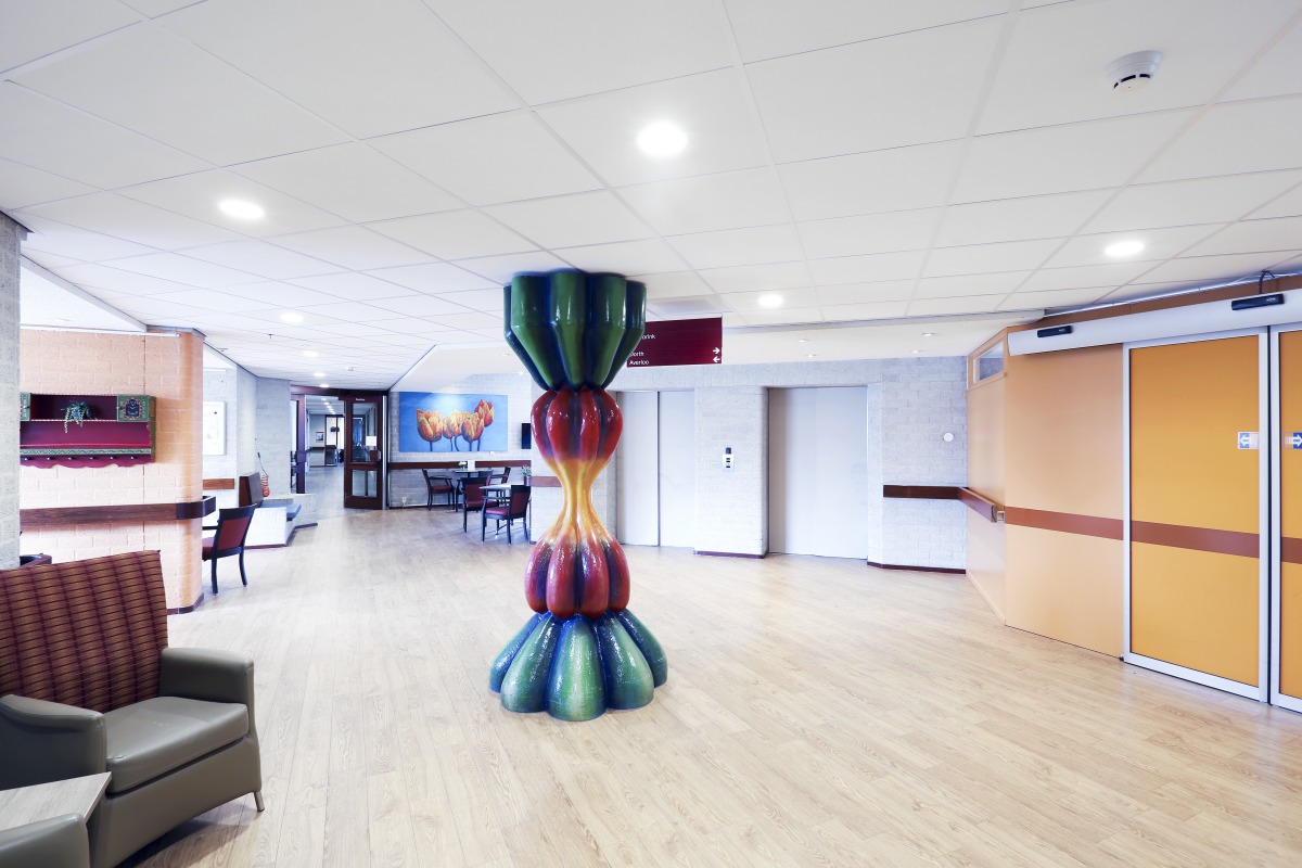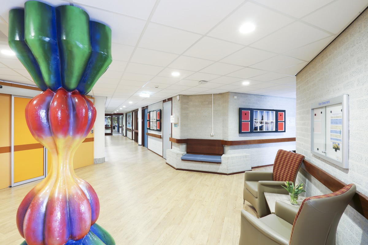 This renovation transformed the dark oldated corridors into bright walkways with pleasant acoustics where people like to stay and meet eachother. A real positive change for clients, staff and visitors.
