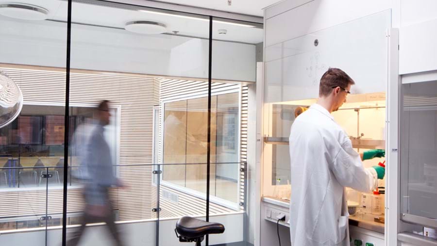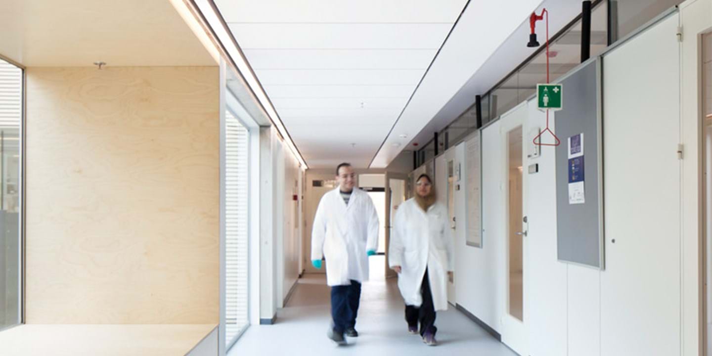 Ecophon Hygiene™ Labotec Ds C1* was selected as the new acoustic ceiling system for the laboratories. This wall-to-wall solution is designed for environments requiring low particle emissions and where cleaning and/or disinfection may be necessary. The Ds system features vertical joints with a concealed grid, and the absorbers can be easily removed to access the installations above.