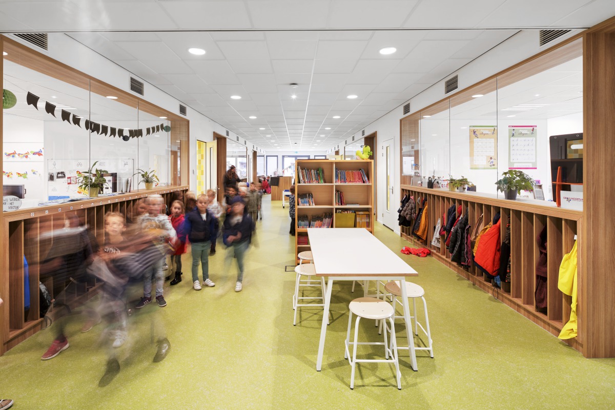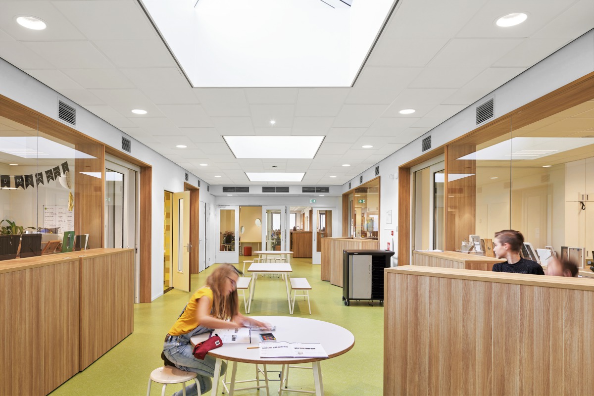 Se pensó mucho en la creación de un buen ambiente acústico. Ya que por el edificio pasan muchos grupos diferentes, es importante que sus actividades no interfieran unas con otras. El falso techo seleccionado para las aulas fue Ecophon Gedina A con al absorbente de bajas frecuencias Ecophon Extra Bass sobre él, que es particularmente efectivo absorbiendo el ruido en el intervalo de frecuencias de 125 Hz. Esta solución ha sido desarrollada por Ecophon específicamente para aulas y cumple con los standards Clase B del programa Dutch Frisse Scholen (‘Fresh Schools’). Lo que quiere decir en la práctica que la acústica es buena (la Clase C es el standard requerido en el código de edificación y la clase A es la óptima). En los amplios pasillos que también sirven como espacios de aprendizaje, se instalaron paneles acústicos en el techo Ecophon Focus E siguiendo un patrón escalonado, lo que no solo asegura una buena acústica, sino que también genera un ambiente más lúdico.