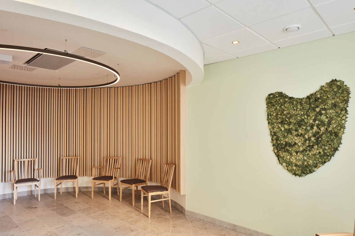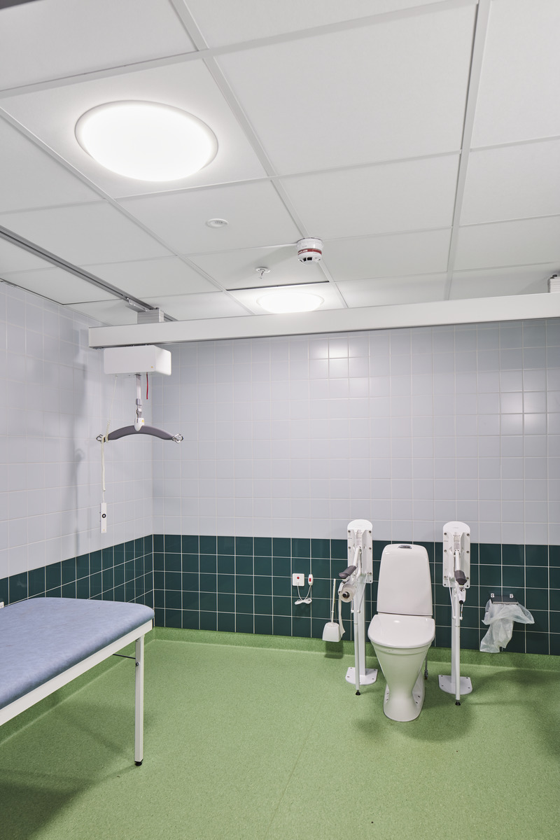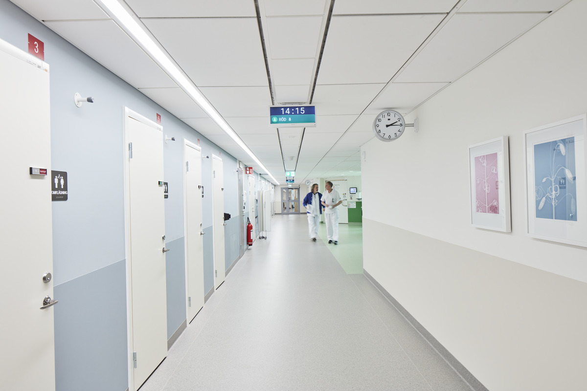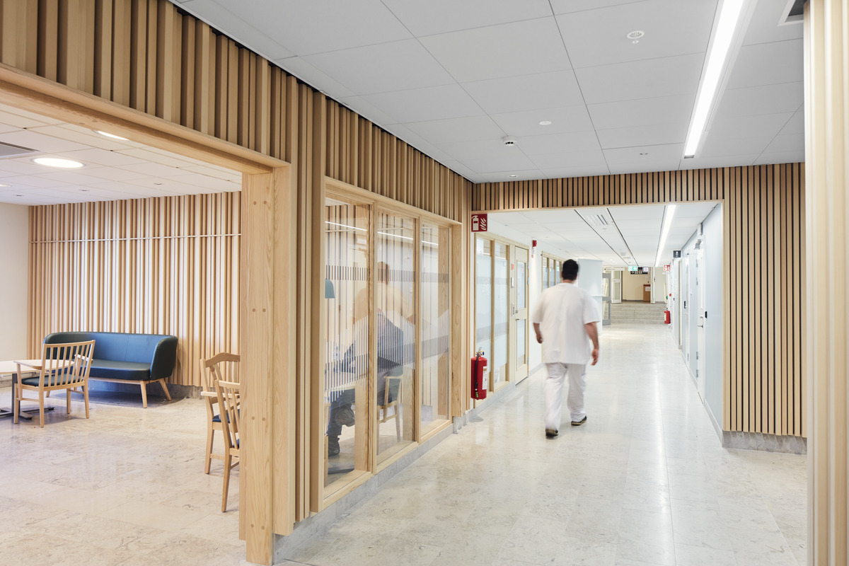 El edificio sanitario N55 también albergará una unidad de resonancia magnética, salas y un centro de pruebas. Estará conectado con los edificios existentes del hospital y será un centro muy importante para el hospital, tanto para los visitantes como para el personal y las operaciones. La clasificación del edificio de entrada es Miljöbyggnad Gold, ya que está construido con materiales sostenibles.