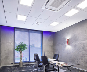 Encuentra soluciones para integraciones sin problemas de ventilación, luminarias, altavoces y protectores contra incendios en tu techo Ecophon.