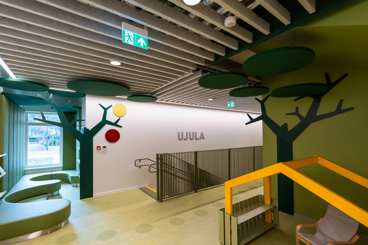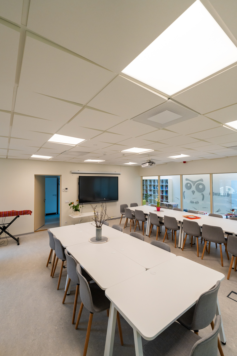 The main entrance corridor was fitted with Ecophon Focus™ E ceiling panels to welcome children and visitors with a bright and comfortable impression, while the reading nooks along the corridor were enhanced with Ecophon Solo™ Circle suspended panels in the refreshing shade Summer Forest – creating calm, inspiring spaces where young learners can explore the joy of reading.